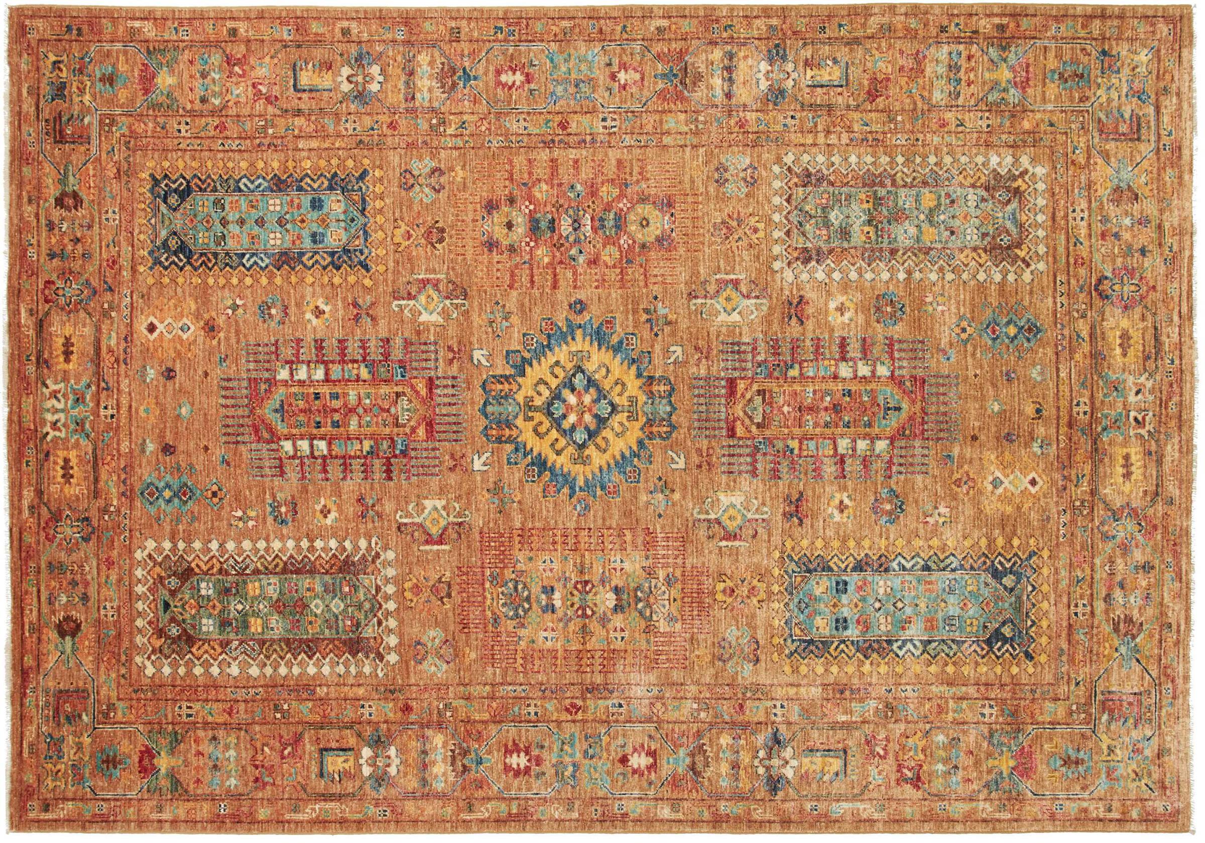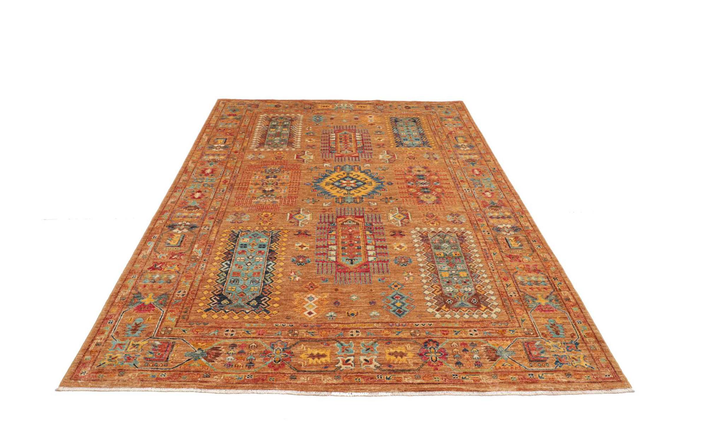 This vibrant oriental rug was hand-knotted in Pakistan - in one of the most far-reaching knotting cultures in the world. Here, the vibrant color spectrum of the Orient comes into its own. A rug like this brings joie de vivre at any time of year. The designer rug has its very own character, as it has only been hand-knotted once over a period of months.
