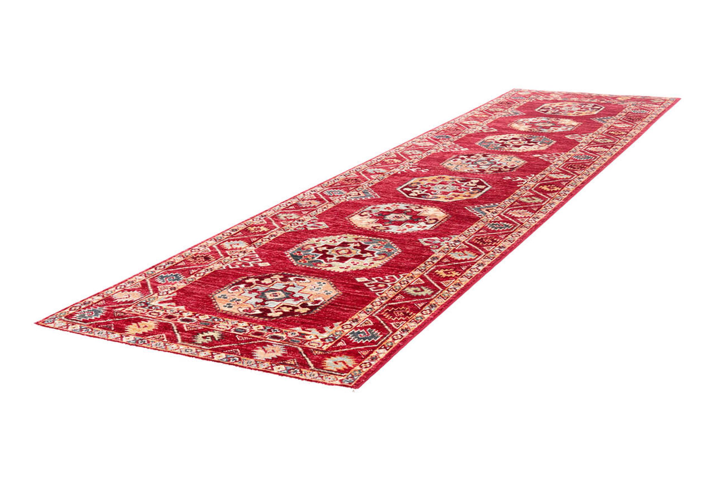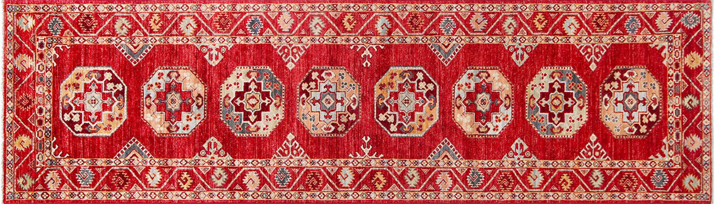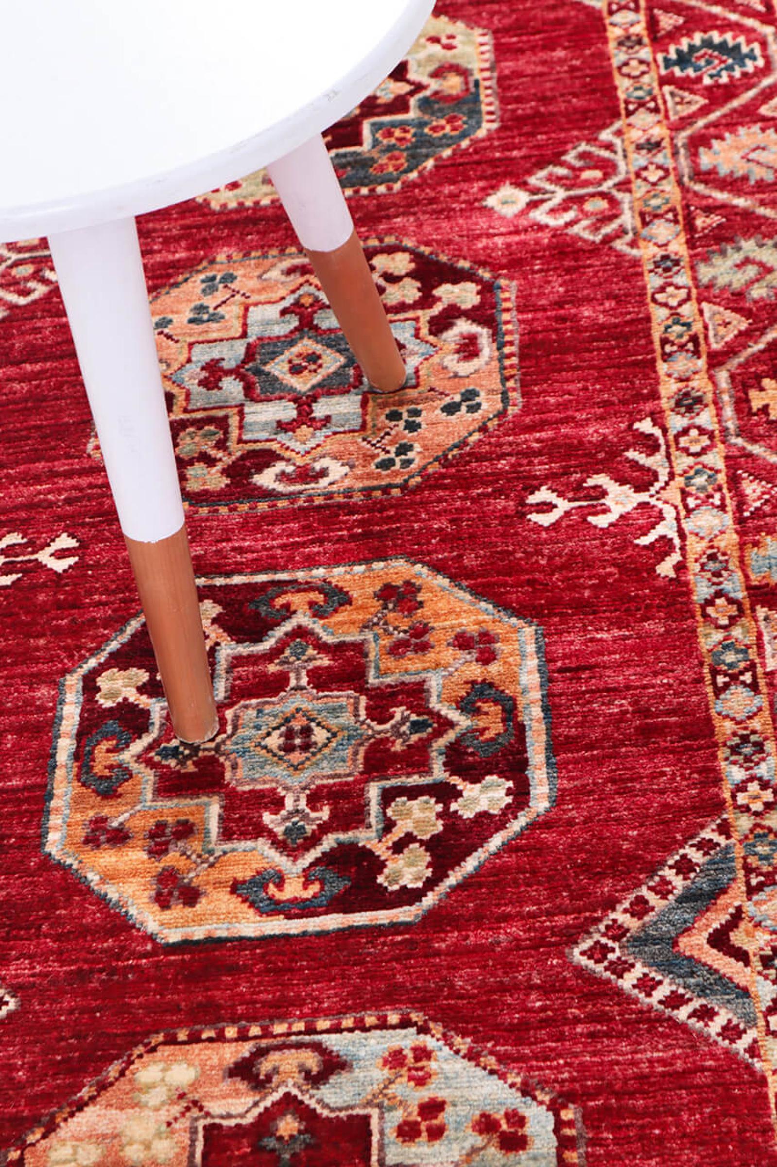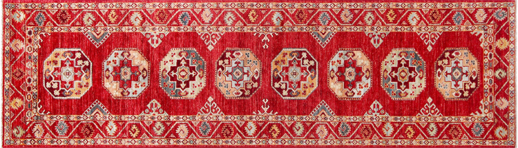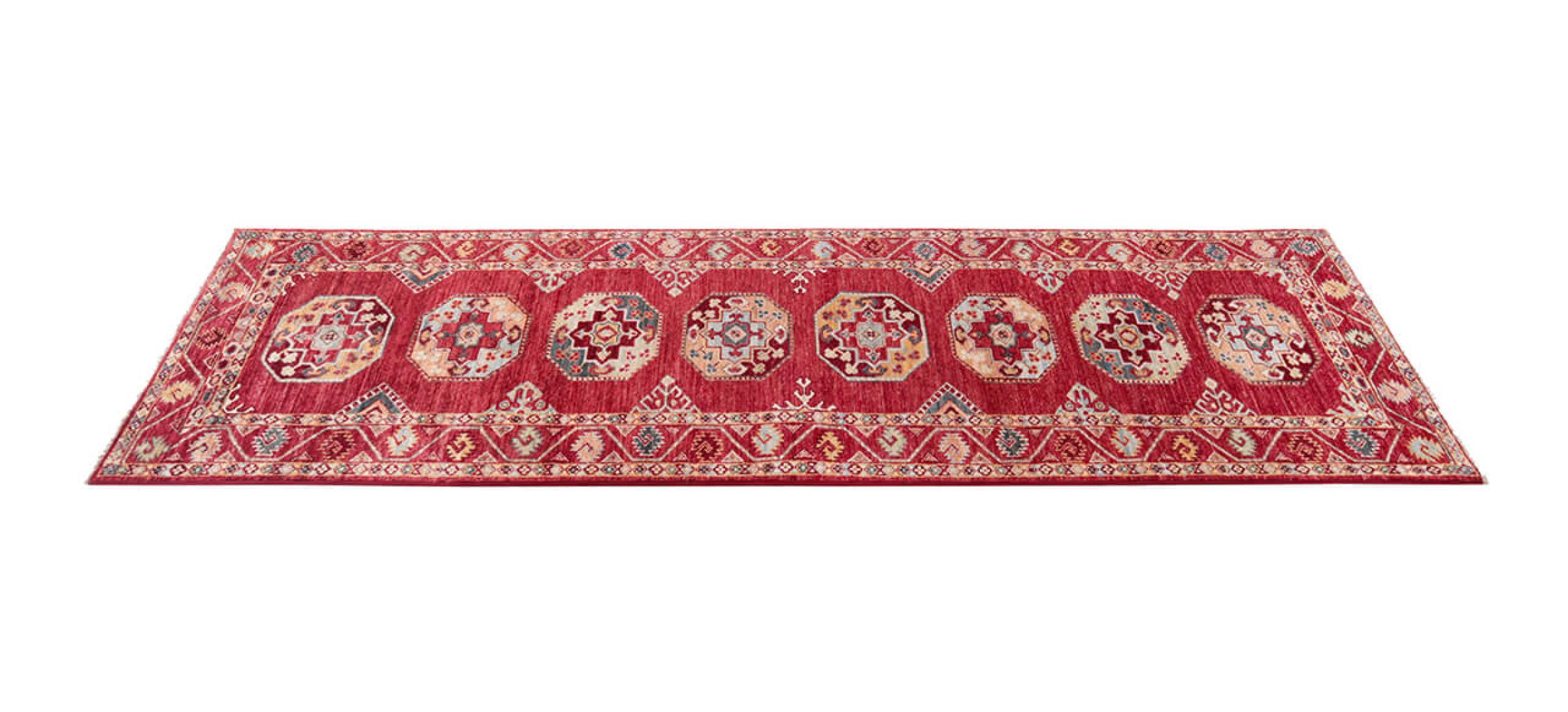 A large part of Pakistani rug production takes place in and around the cities of Lahore and Karachi. Many of the rug knotters of that time fled to Pakistan during the war with India and settled there. Today, especially hand-knotted Pakistan Bukhara rugs are well-known. Similar to the Afghan oriental rugs, Pakistani rugs are also made in dark colours and mostly have shades of red. Even the well-known elephant foot pattern (repeating octagonal pattern) can be found on a Pakistani.