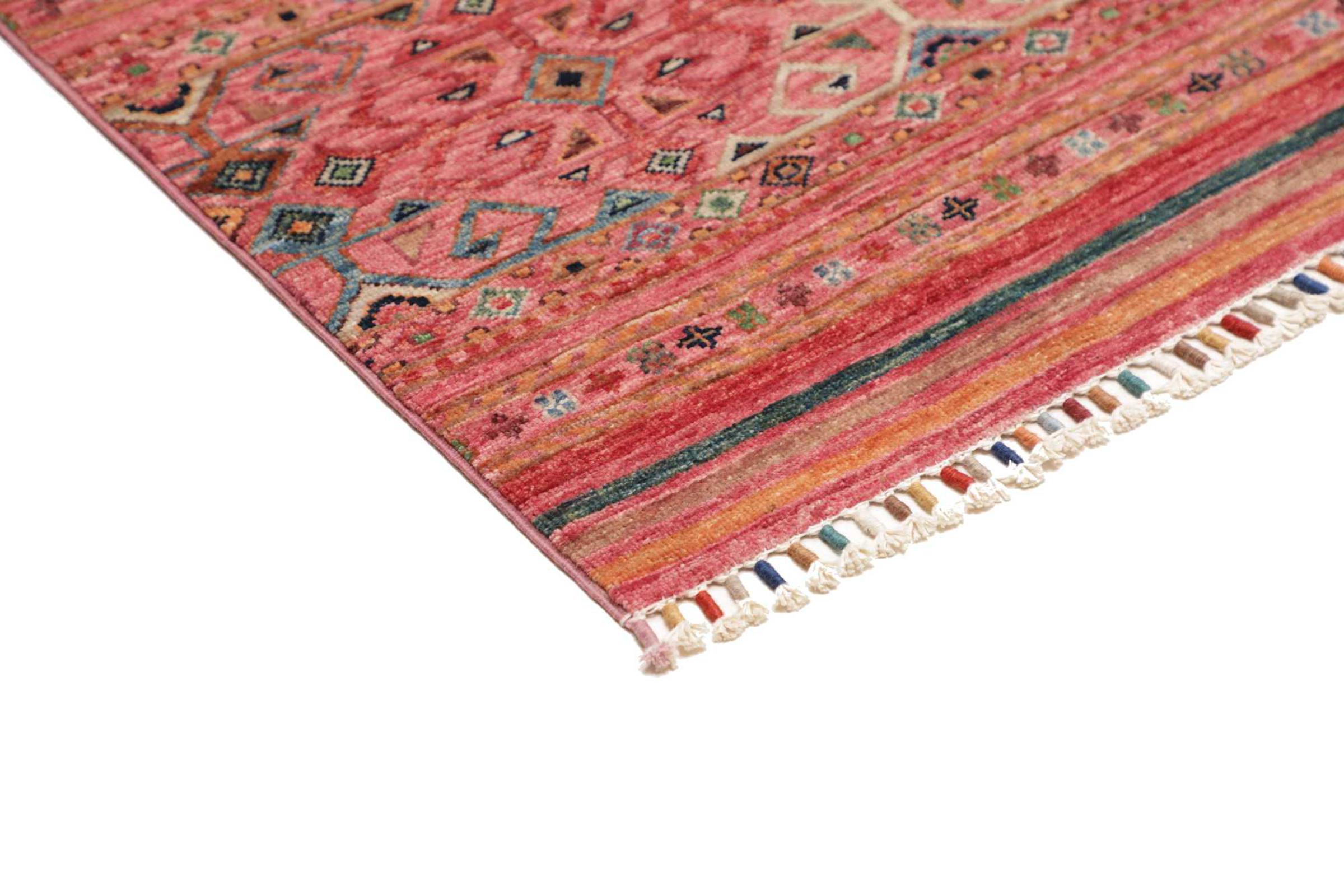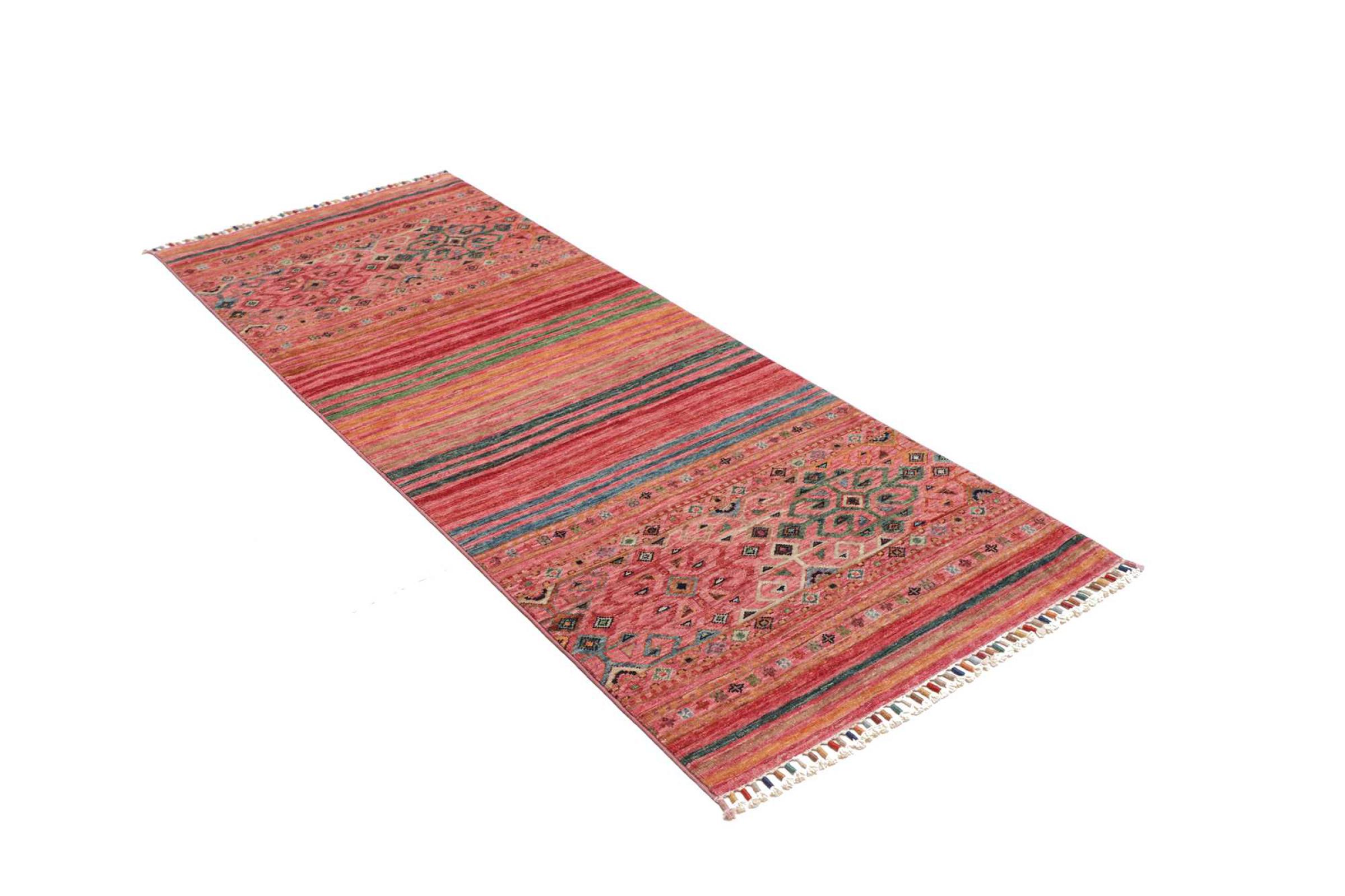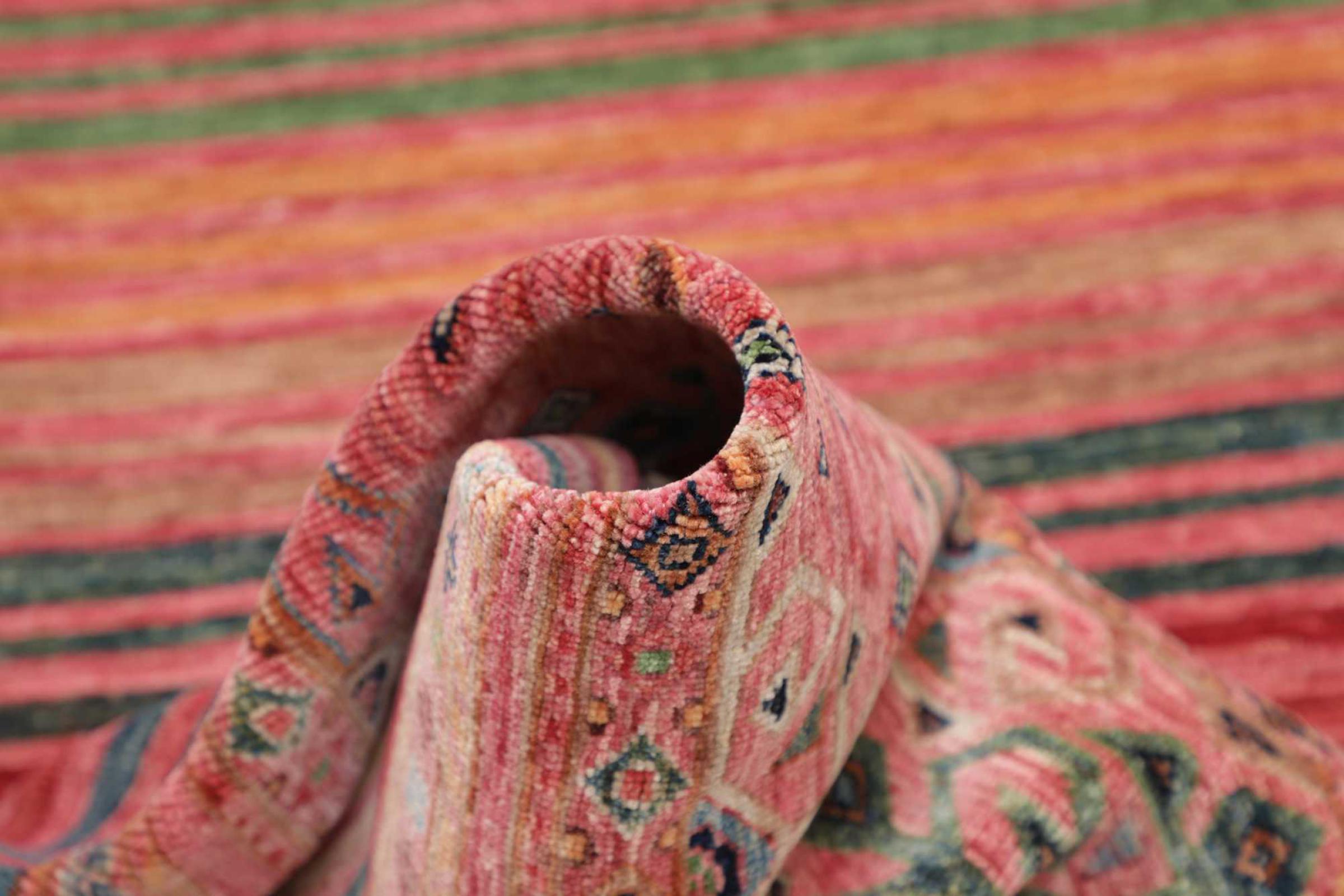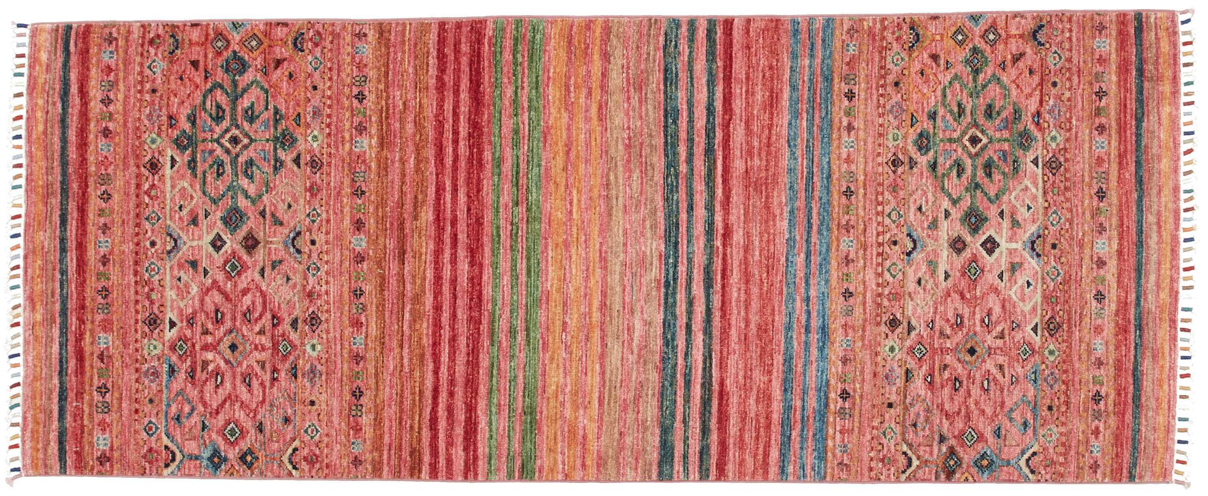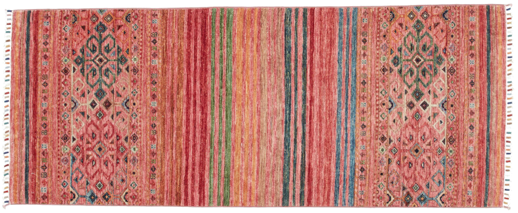 This Arijana Shaal carpet was knotted by hand in Pakistan. It promises a very high quality and thus offers long lasting pleasure. The pattern in stripes is varied and exciting. It was inspired by the well-known Moharamati design. If you find monochrome carpets too boring, you will certainly be delighted with this Arijana Shaal.
