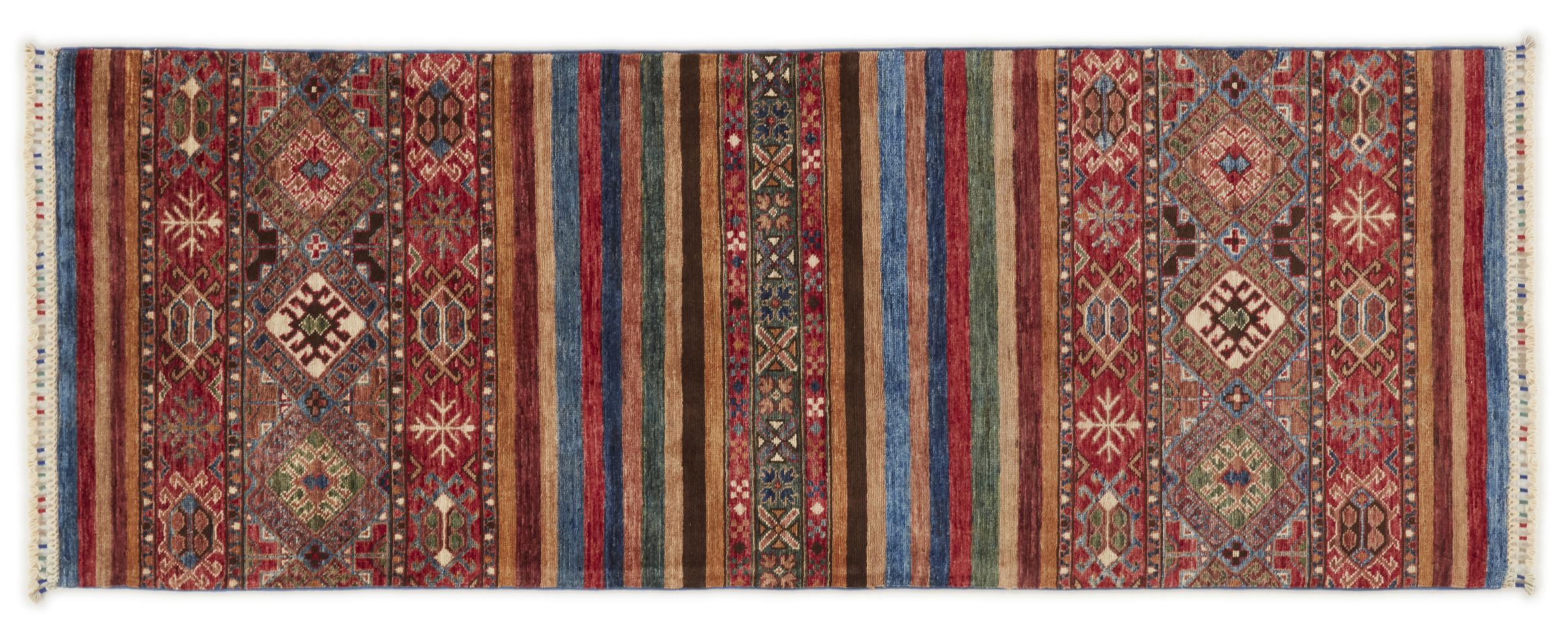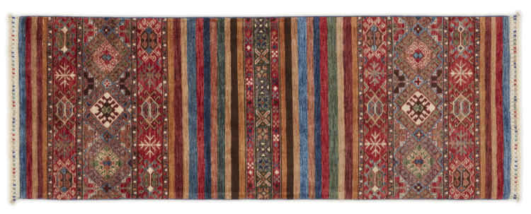 Carpet ID: 291853008595138 Size: 207x78 cm Thickness: ap. 5 mm Knot density: 160 000 - 200 000 / m² Manufacturing: Knotted by hand Pile: Handspun wool Warp: Cotton Origin: Afghanistan Age: New Weight: ap. 6 kg In stock: Unique - Only 1 in stock