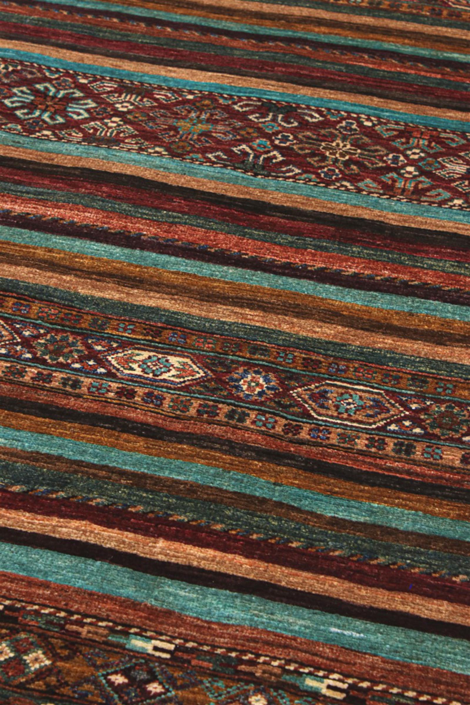 A large part of Pakistani rug production takes place in and around the cities of Lahore and Karachi. Many of the rug knotters of that time fled to Pakistan during the war with India and settled there. Today, especially hand-knotted Pakistan Bukhara rugs are well-known. Similar to the Afghan oriental rugs, Pakistani rugs are also made in dark colours and mostly have shades of red. Even the well-known elephant foot pattern (repeating octagonal pattern) can be found on a Pakistani.
