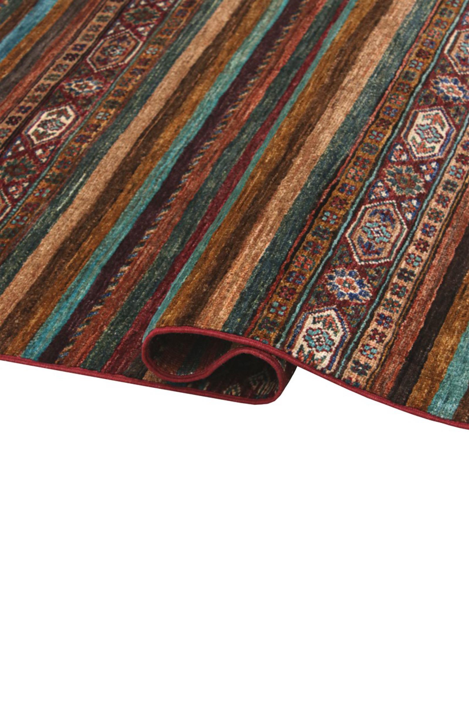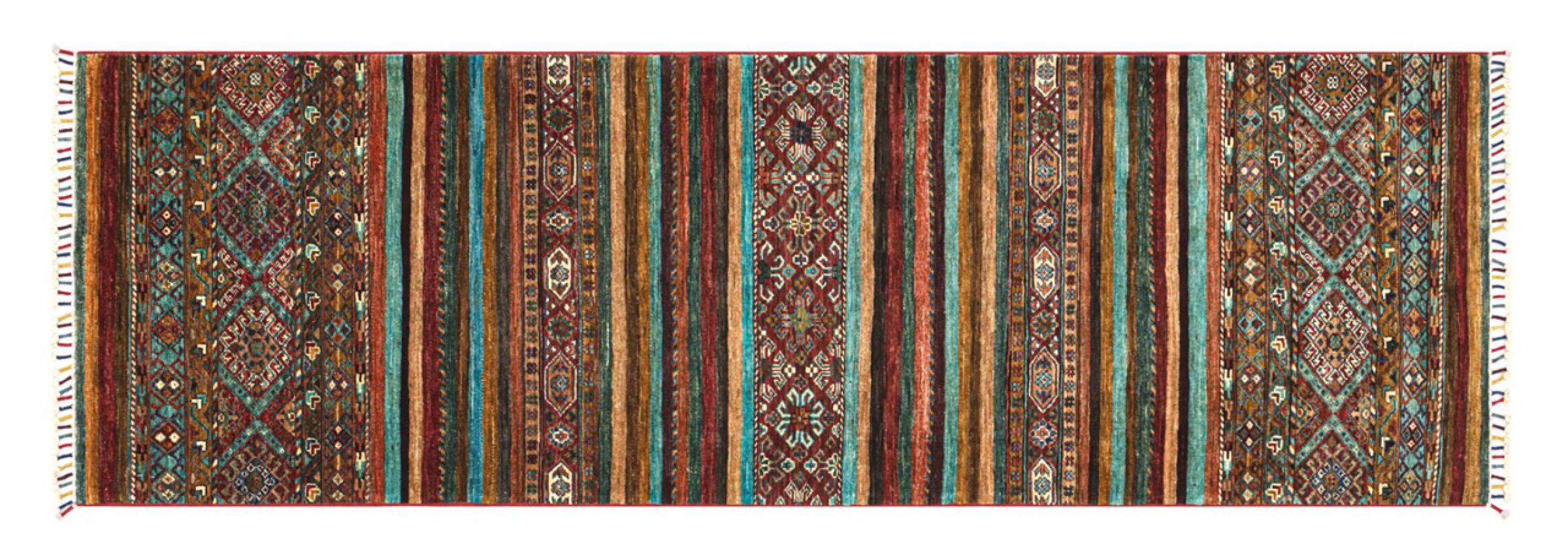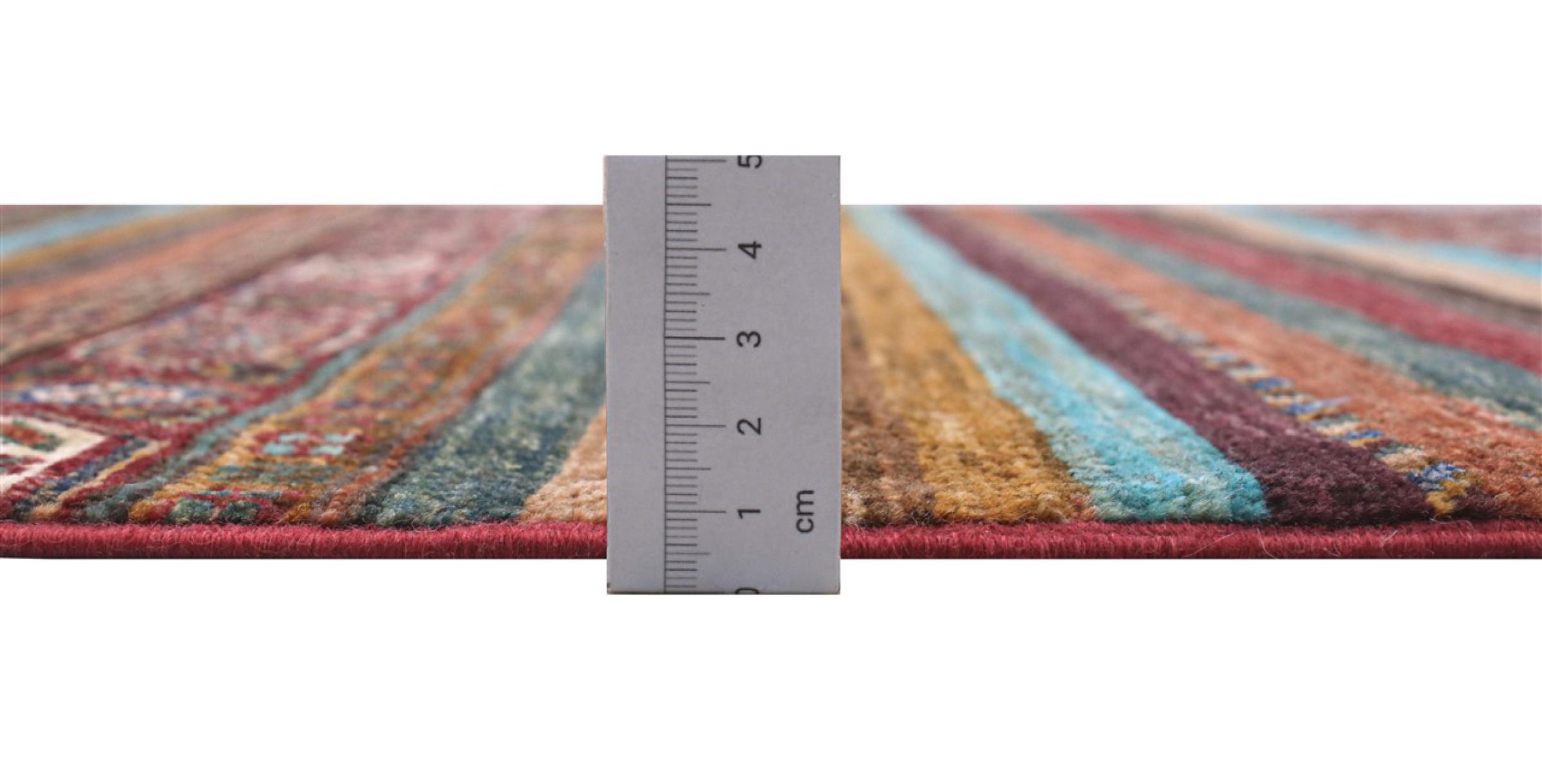 This Arijana Shaal carpet was knotted by hand in Pakistan. It promises a very high quality and thus offers long lasting pleasure. The pattern in stripes is varied and exciting. It was inspired by the well-known Moharamati design. If you find monochrome carpets too boring, you will certainly be delighted with this Arijana Shaal.