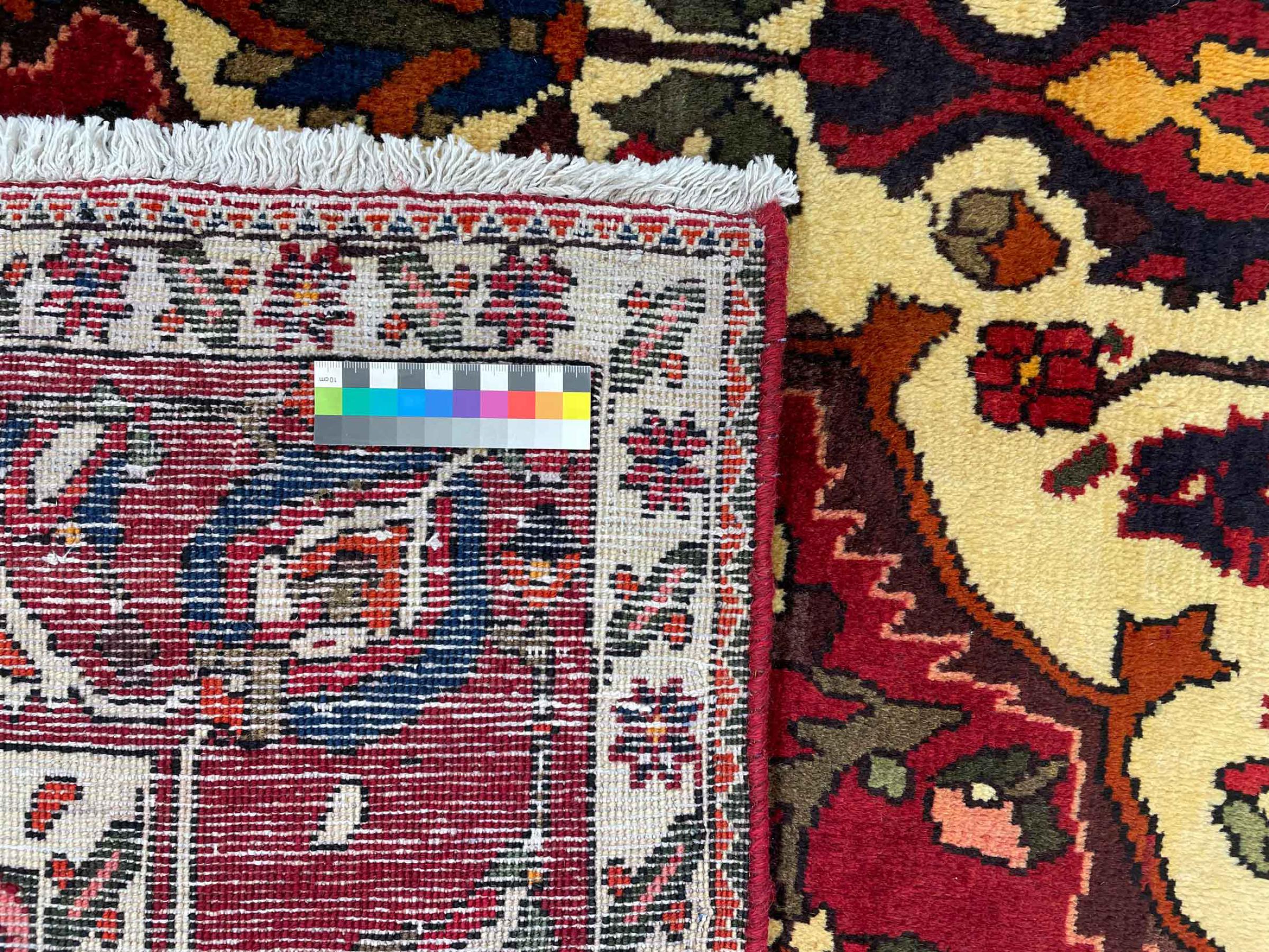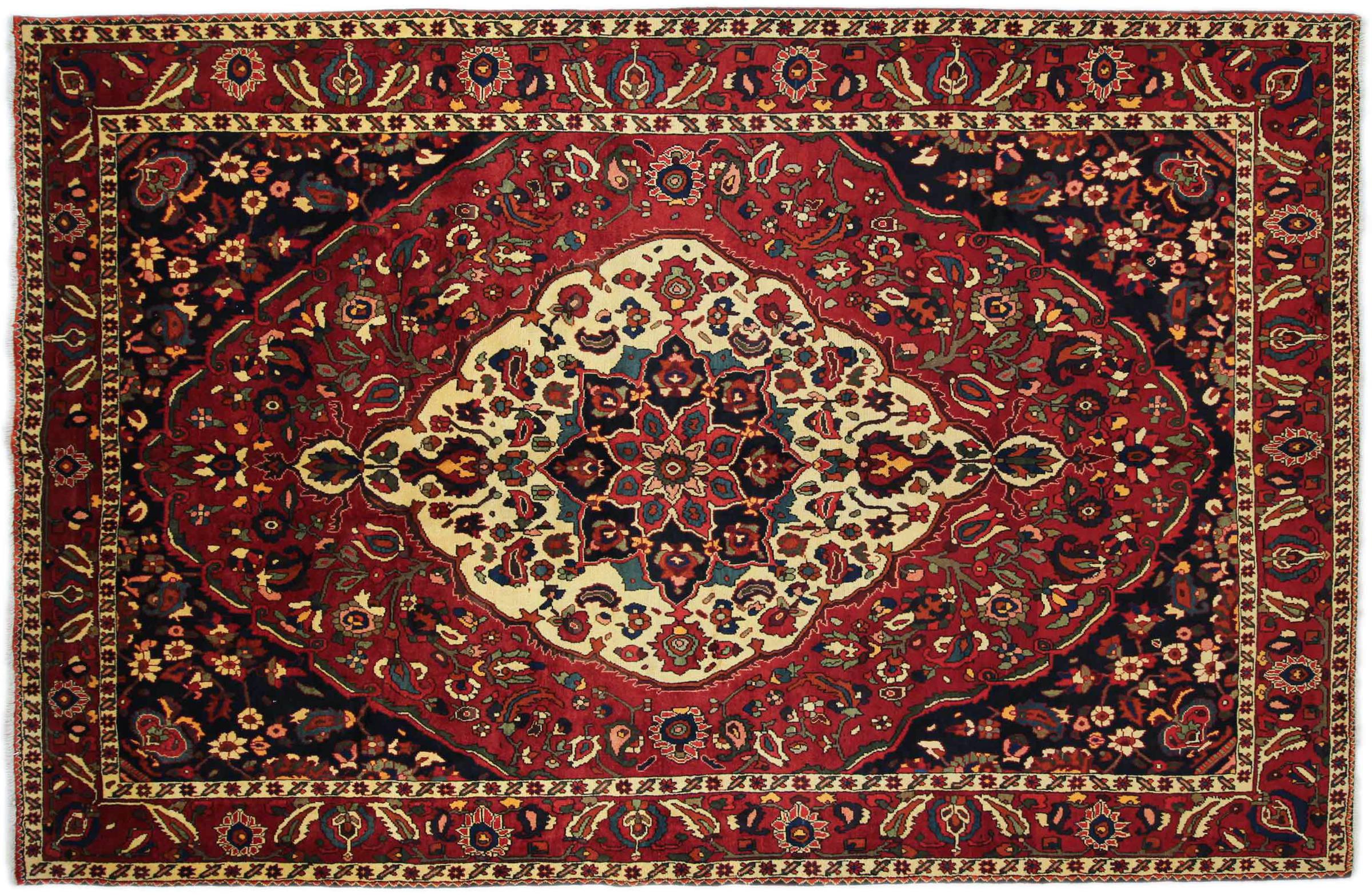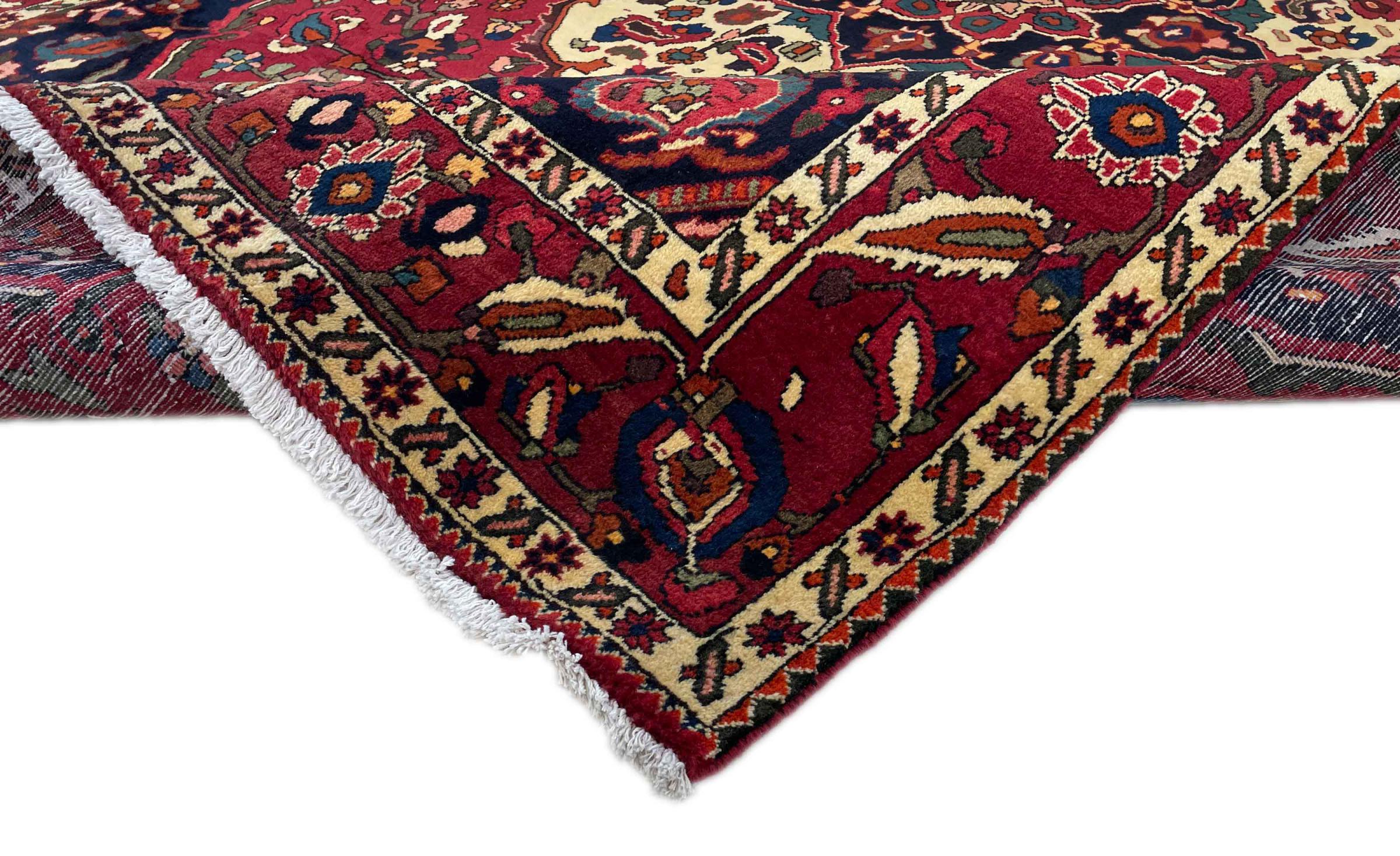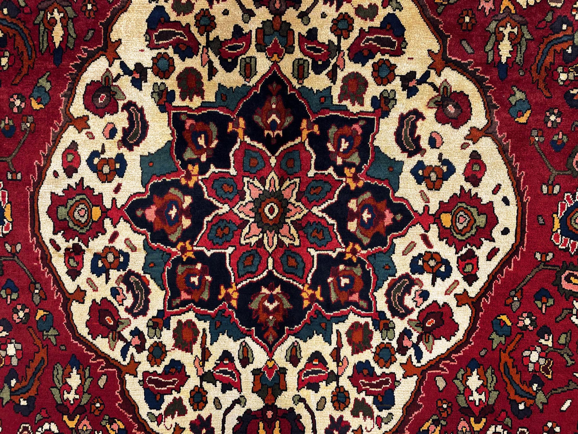 This Persian Bakhtiari was hand-knotted by nomads of the Bakhtiari tribe. This Persian carpet plays with the colours of the Orient in the most beautiful patterns. The design of its ornaments is inspired by Persian gardens. Over the years, the so-called traditional garden design has gained great popularity in the western world. Its high knotting density in combination with the strong yarn promises a long-lasting pleasure of Persian carpet art.