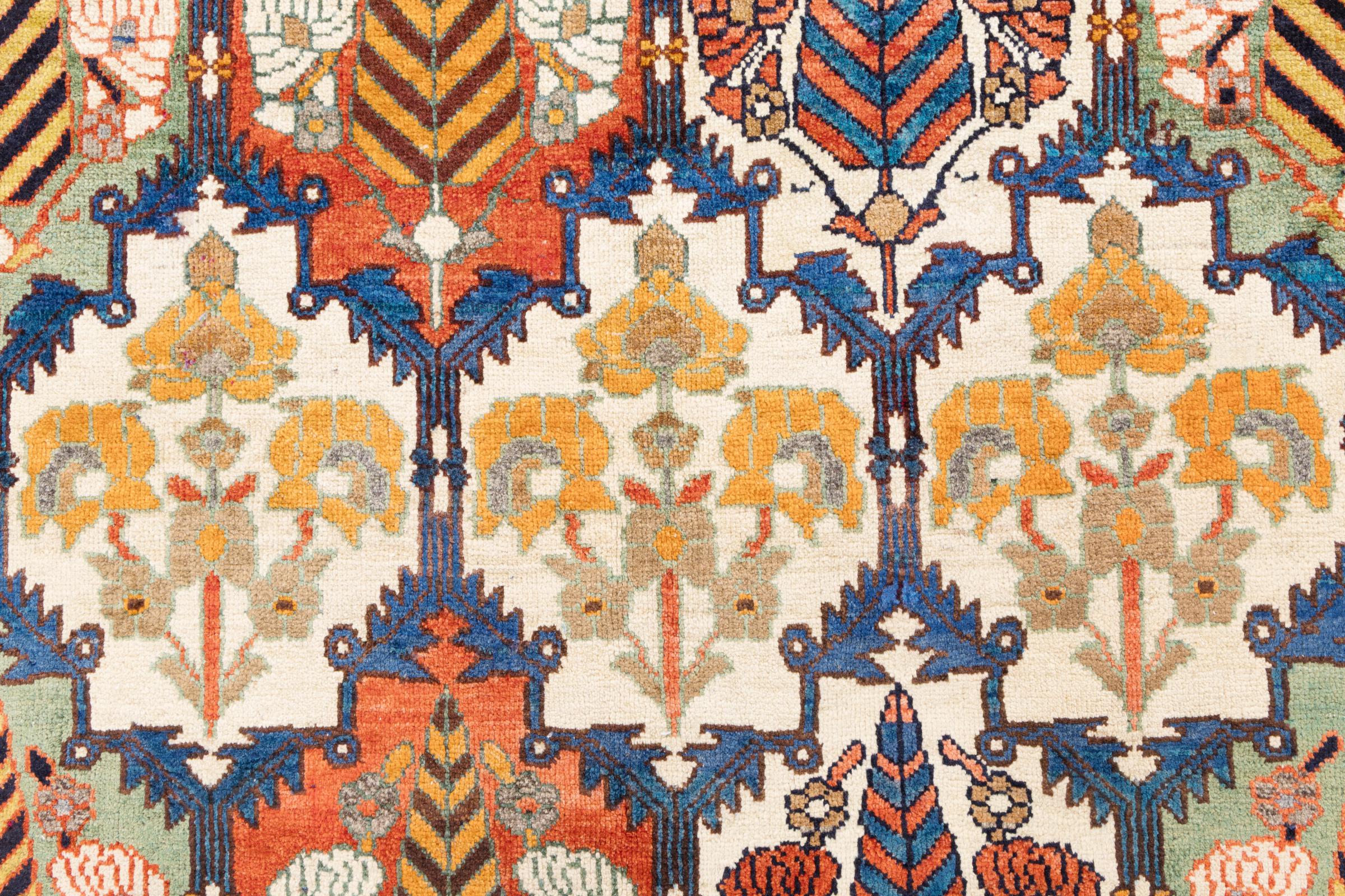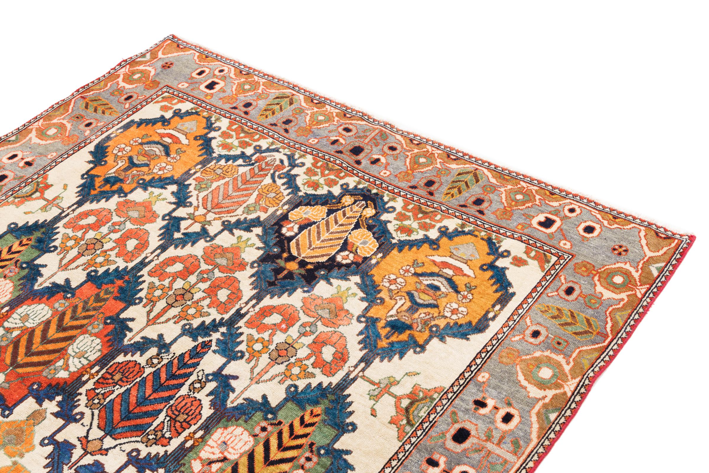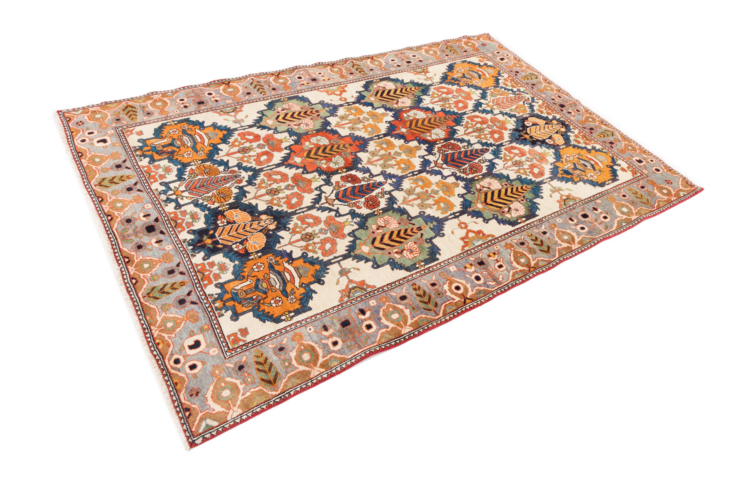 This Persian Bakhtiari was hand-knotted by nomads of the Bakhtiari tribe. This Persian carpet plays with the colours of the Orient in the most beautiful patterns. The design of its ornaments is inspired by Persian gardens. Over the years, the so-called traditional garden design has gained great popularity in the western world. Its high knotting density in combination with the strong yarn promises a long-lasting pleasure of Persian carpet art.