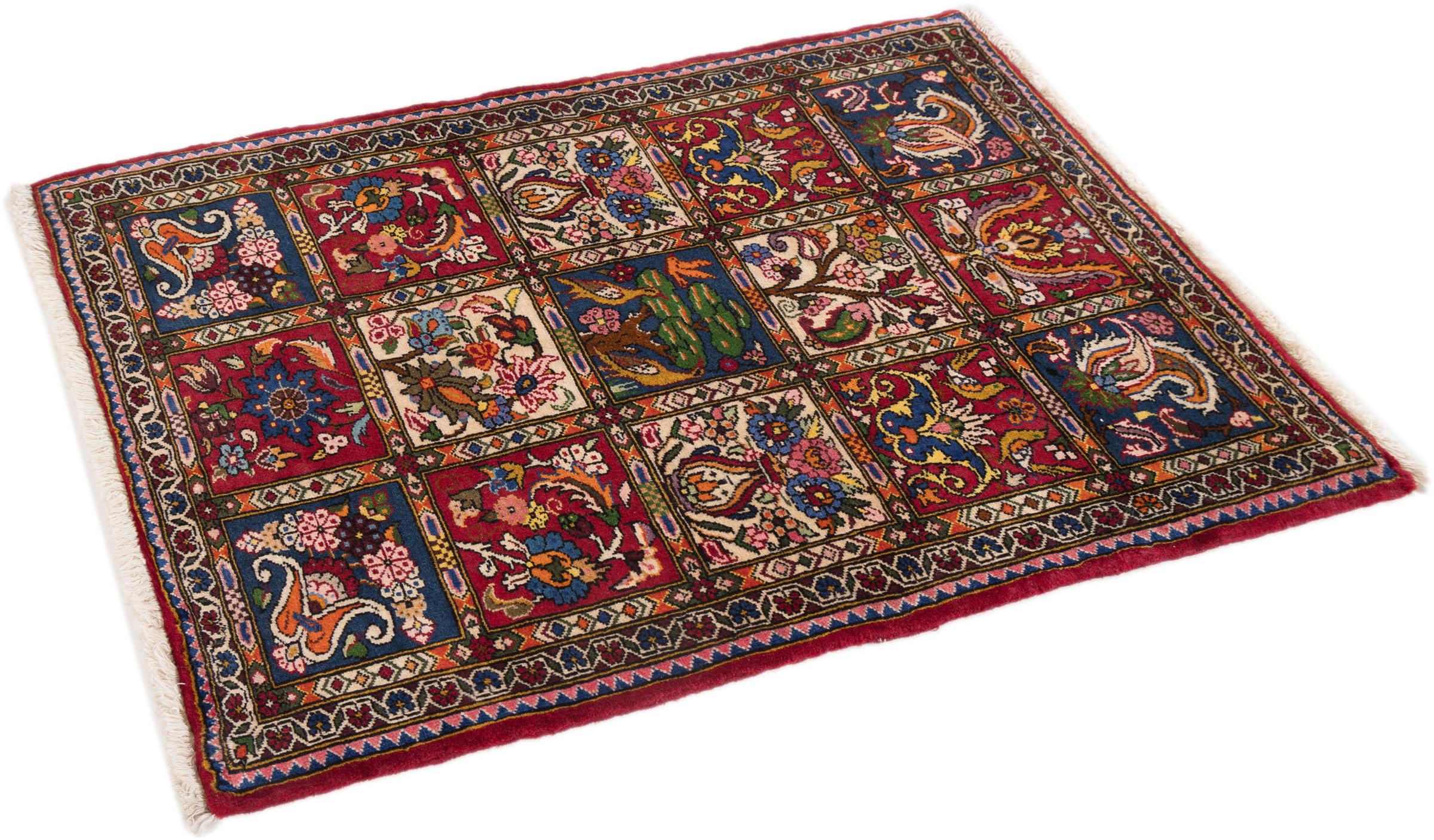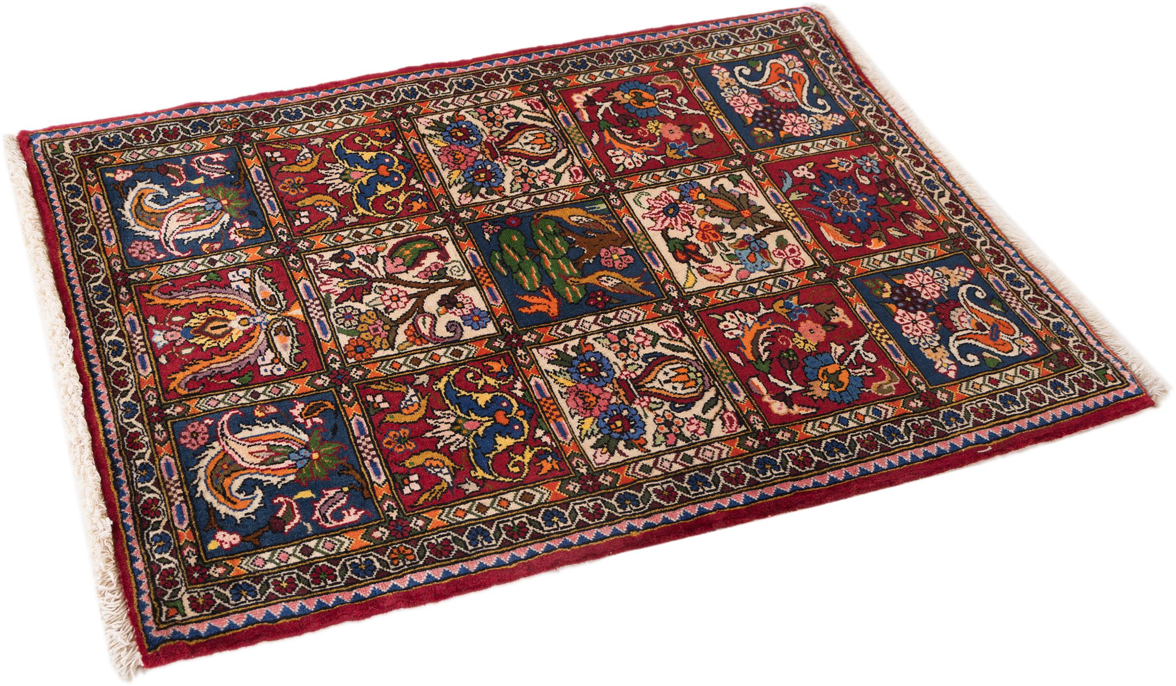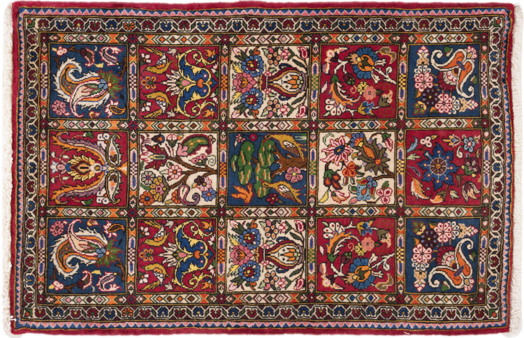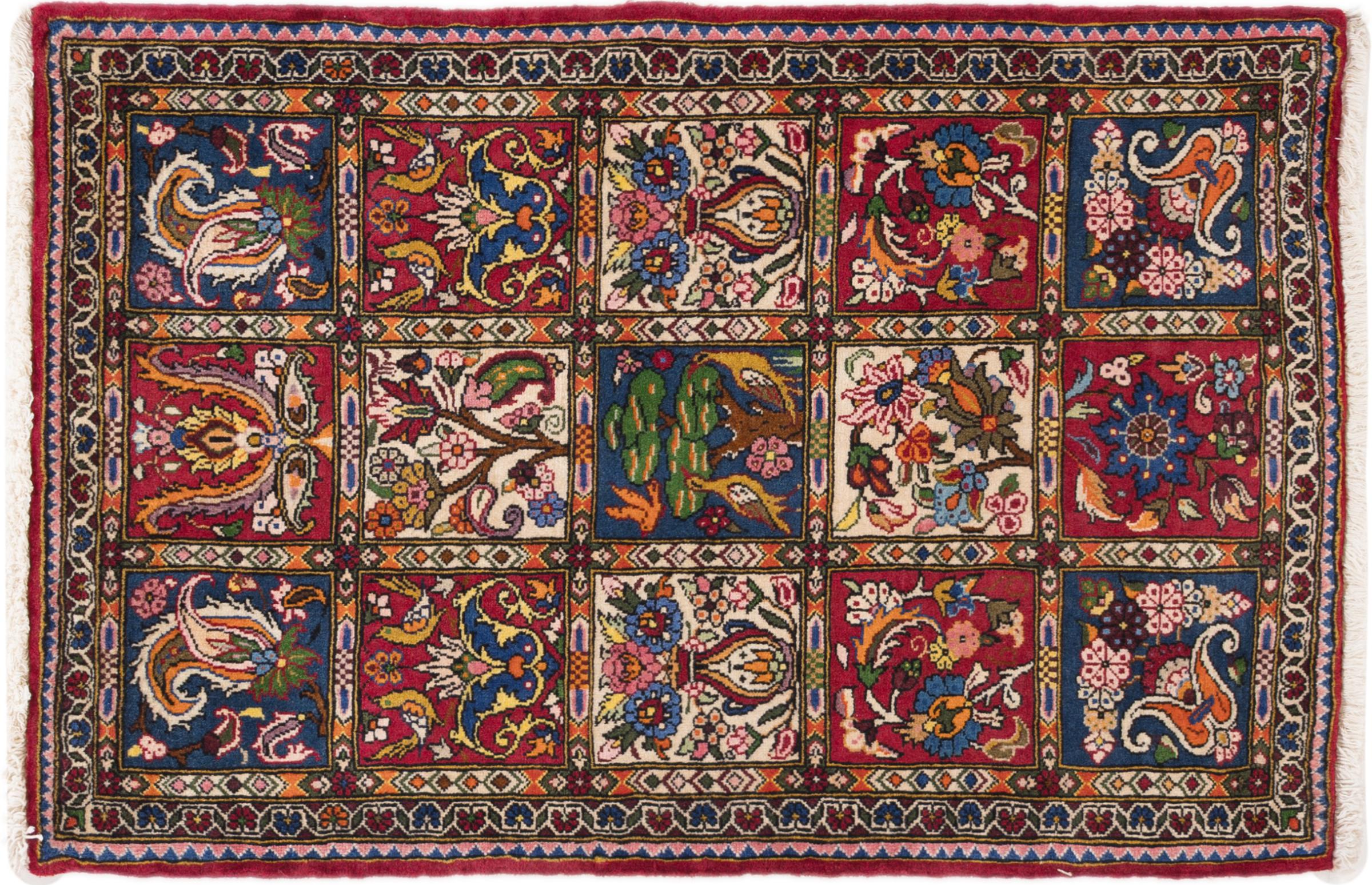 Carpet ID: 296752002876 Size: 95x63 cm Thickness: ap. 12 mm Knot density: 200 000 - 250 000 / m² Manufacturing: Knotted by hand Pile: Handspun wool Warp: Cotton Origin: Persia Age: New Weight: ap. 2 kg Also know as Baktjar In stock: Unique - Only 1 in stock