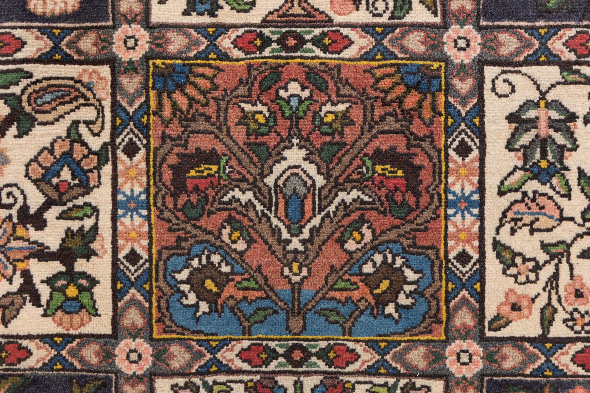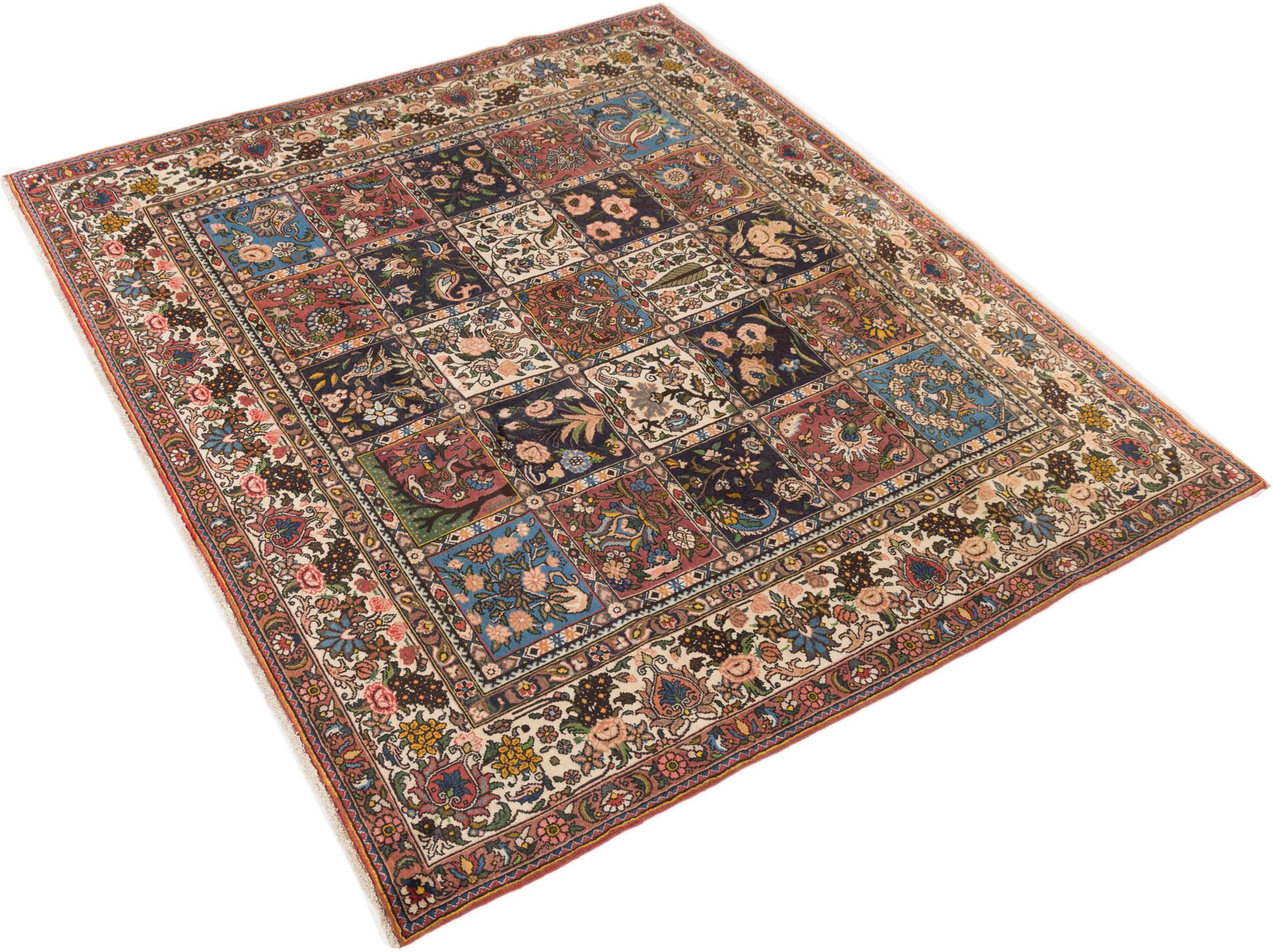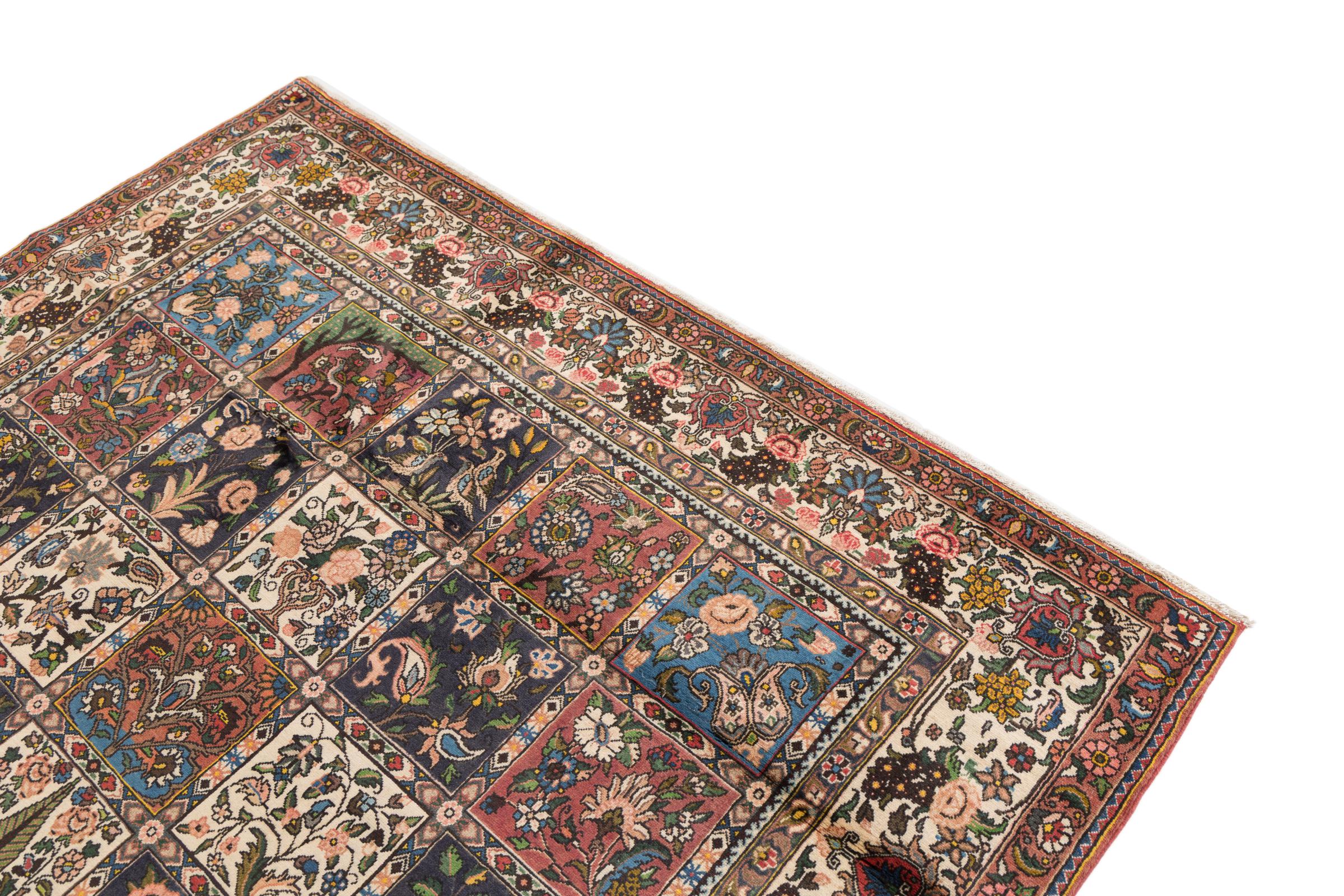 This Persian Bakhtiari was hand-knotted by nomads of the Bakhtiari tribe. This Persian carpet plays with the colours of the Orient in the most beautiful patterns. The design of its ornaments is inspired by Persian gardens. Over the years, the so-called traditional garden design has gained great popularity in the western world. Its high knotting density in combination with the strong yarn promises a long-lasting pleasure of Persian carpet art.