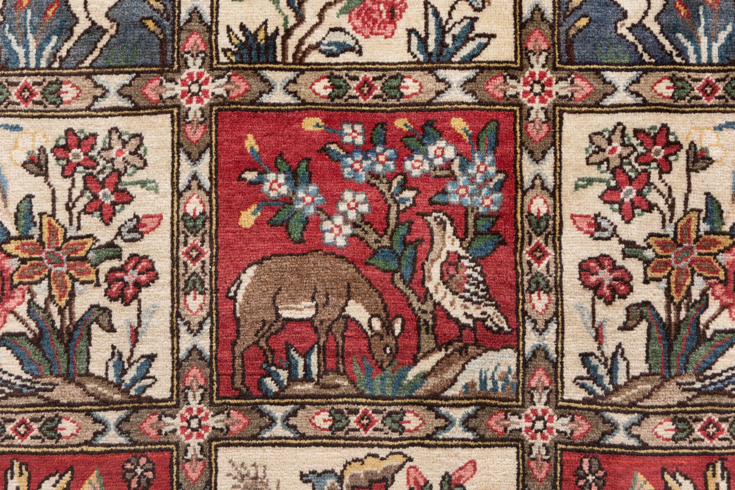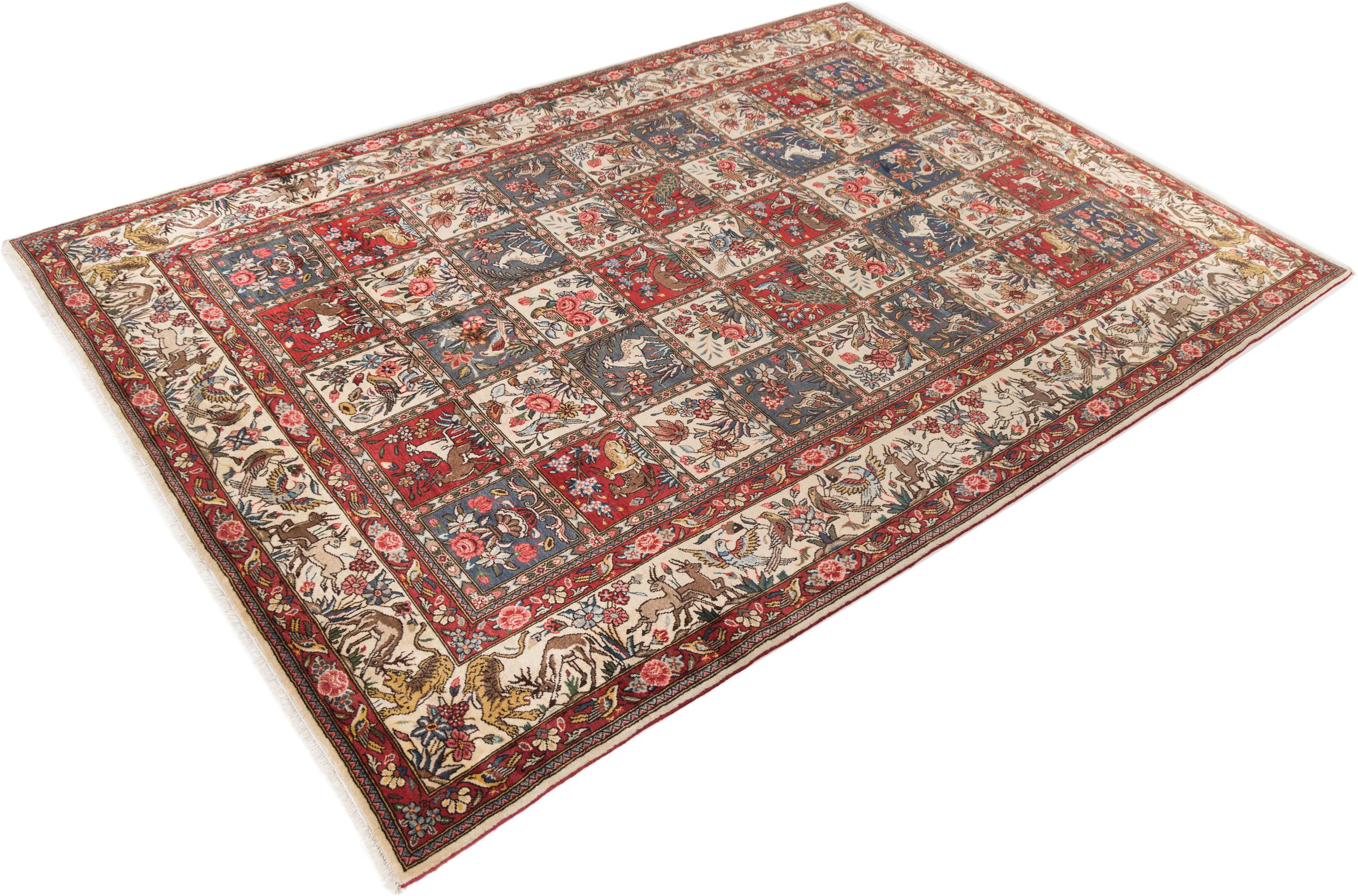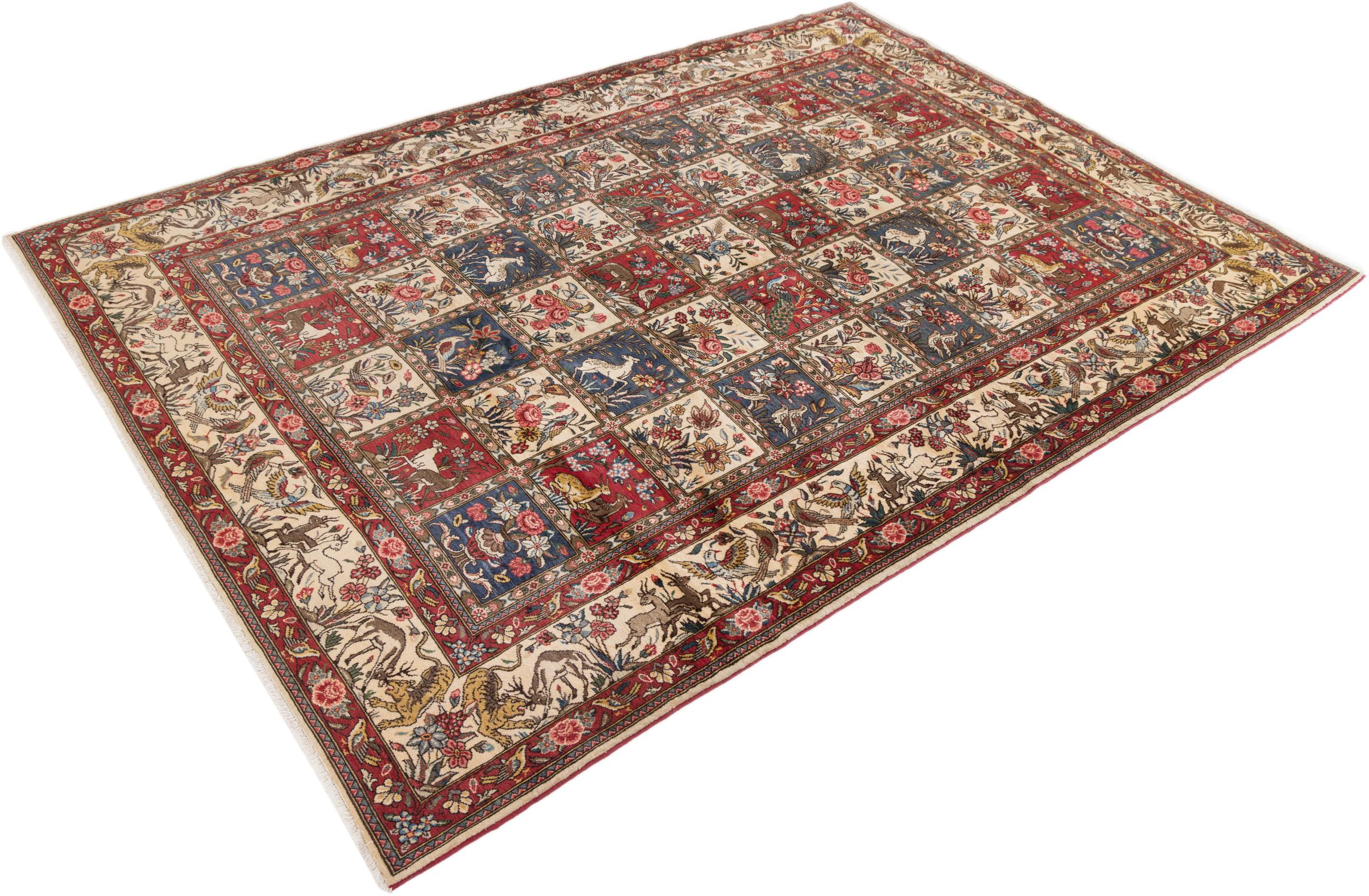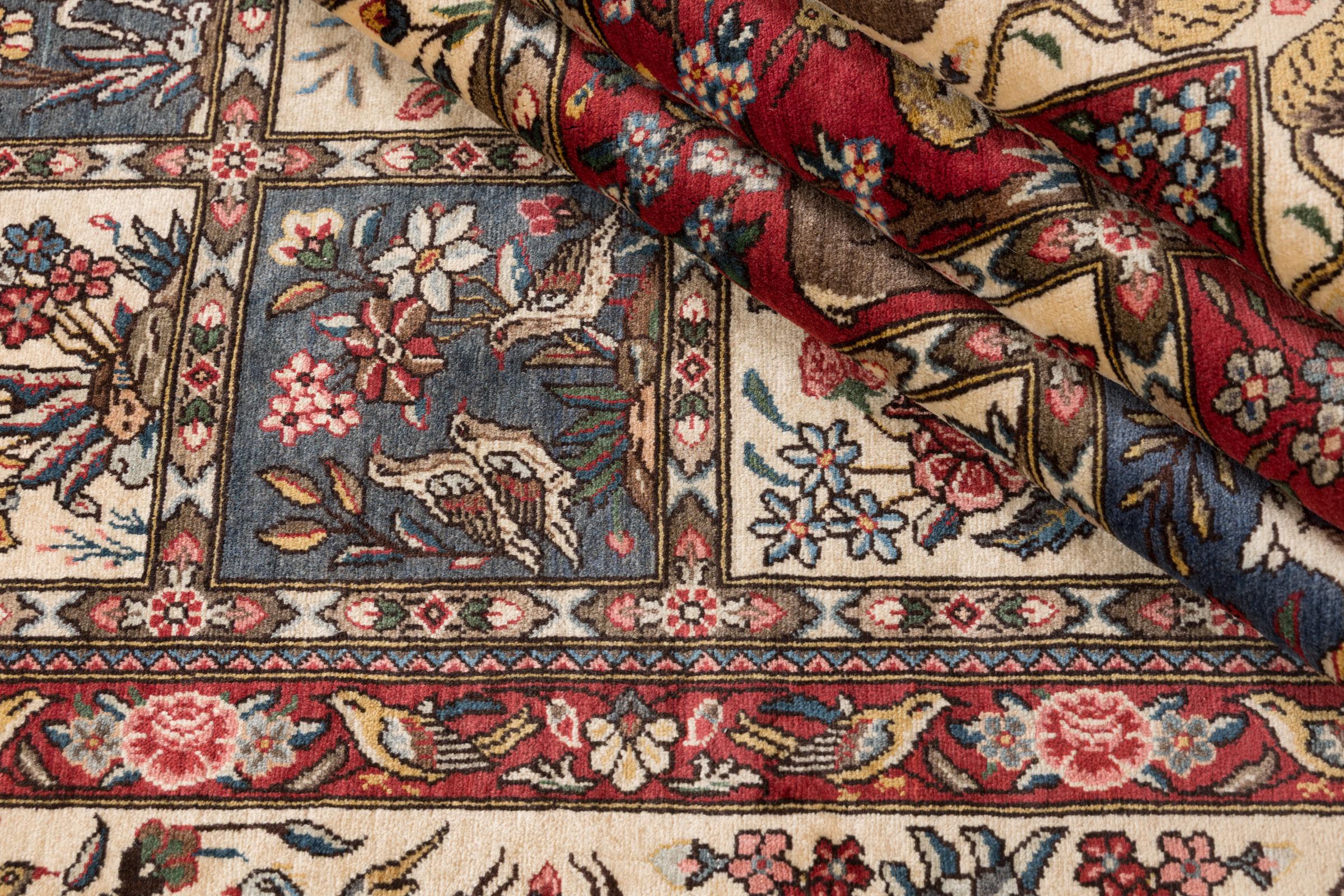 This Persian Bakhtiari was hand-knotted by nomads of the Bakhtiari tribe. This Persian carpet plays with the colours of the Orient in the most beautiful patterns. The design of its ornaments is inspired by Persian gardens. Over the years, the so-called traditional garden design has gained great popularity in the western world. Its high knotting density in combination with the strong yarn promises a long-lasting pleasure of Persian carpet art.