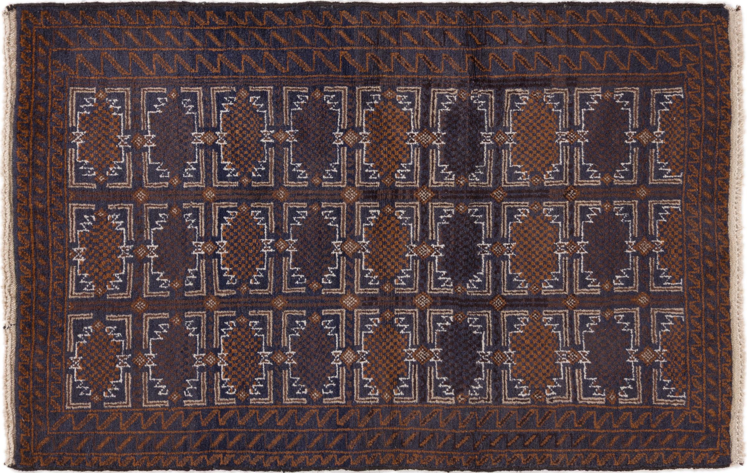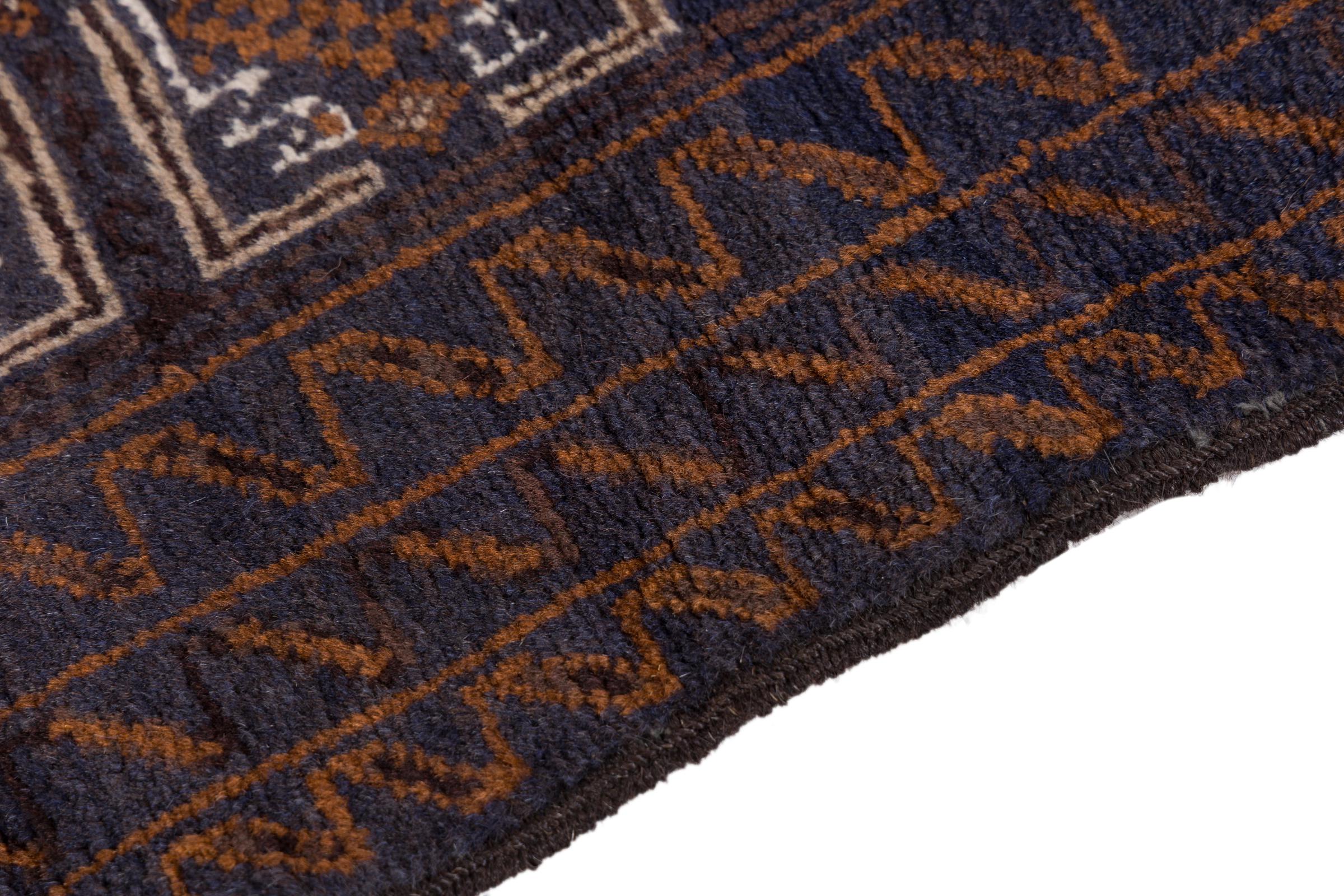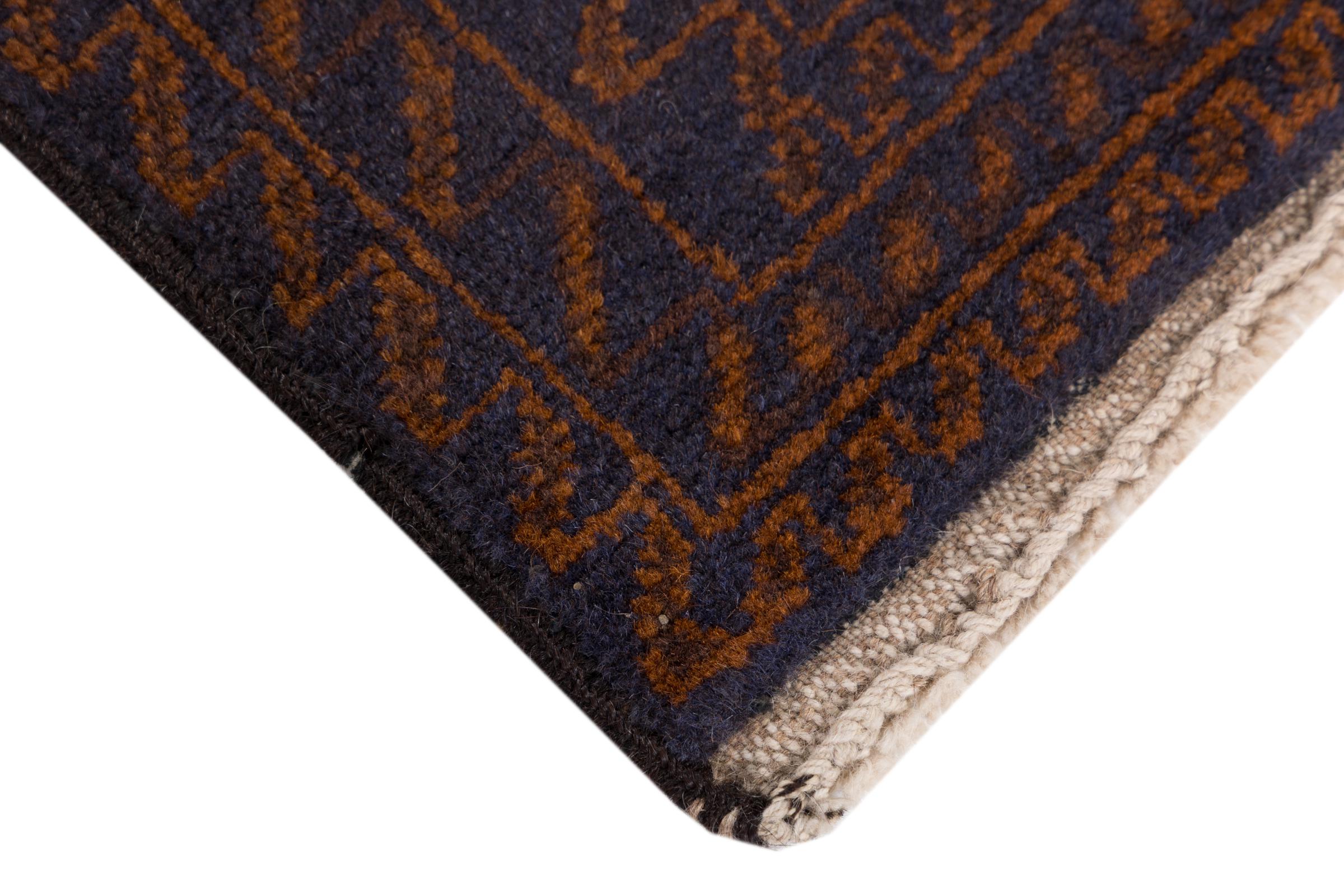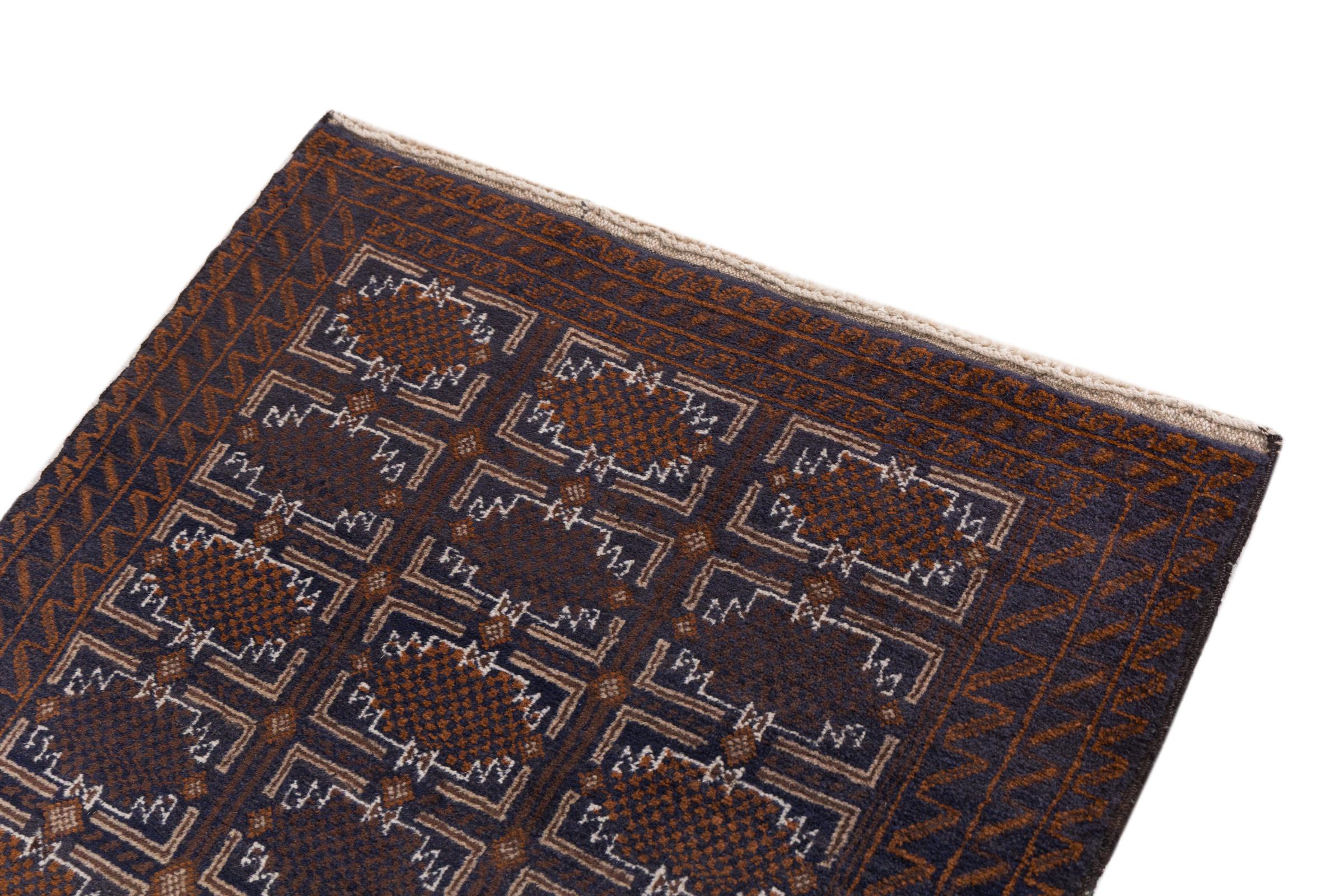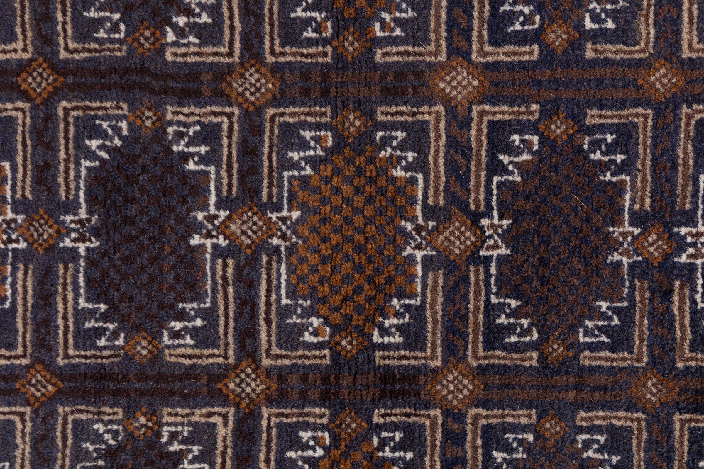 This Baluch carpet is a wonderful example of true nomadic art. The Persian carpet, made in the Iranian-Afghan border region, is convincing thanks to its dense, asymmetrical knotting. Lively patterns make it a real feast for the eyes. Typical are rather dark shades that spread a pleasant warmth. Its beautiful natural yarn conveys quality and makes it extremely durable. Typical for this carpet are the straight-lined patterns that make it an unmistakable nomadic carpet.