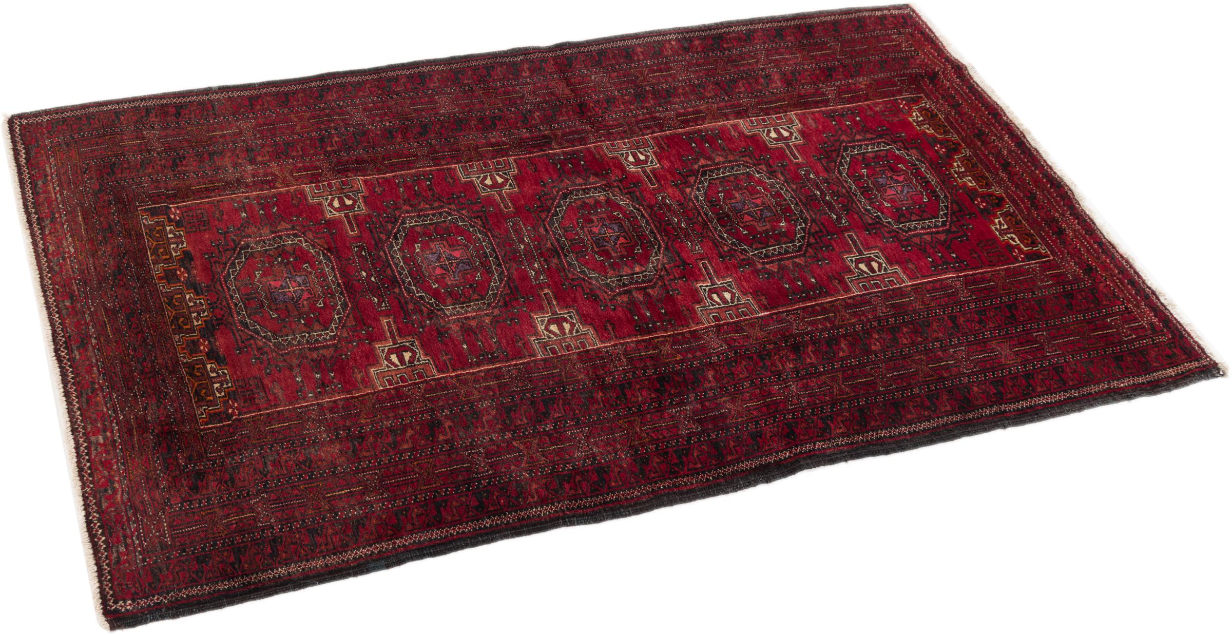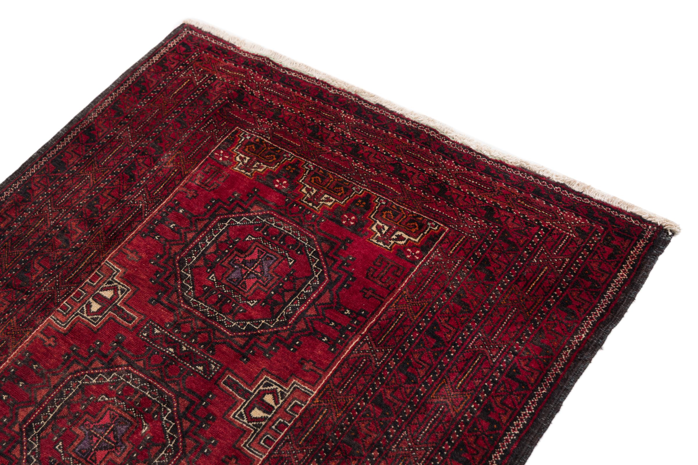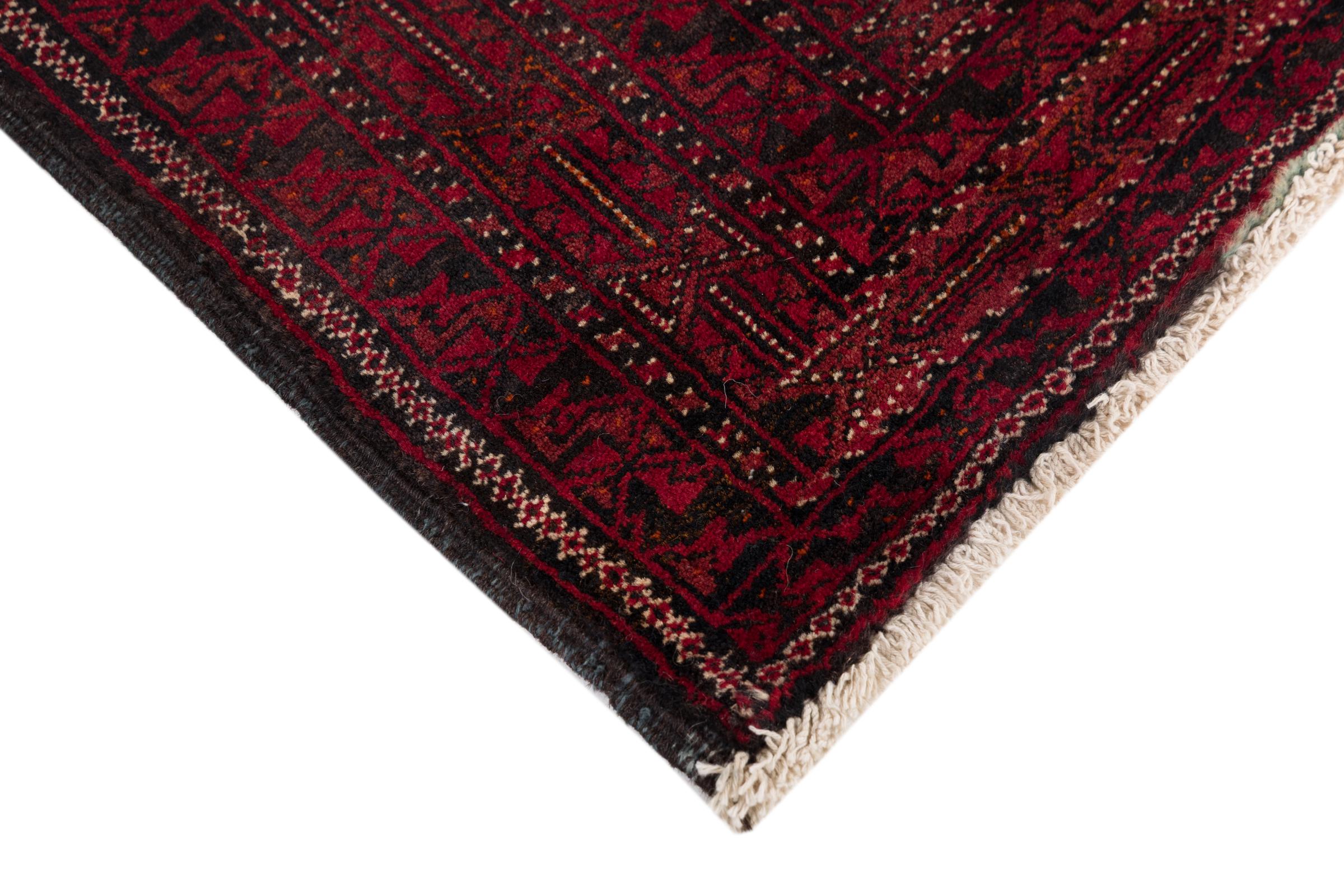 This Baluch carpet is a wonderful example of true nomadic art. The Persian carpet, made in the Iranian-Afghan border region, is convincing thanks to its dense, asymmetrical knotting. Lively patterns make it a real feast for the eyes. Typical are rather dark shades that spread a pleasant warmth. Its beautiful natural yarn conveys quality and makes it extremely durable. Typical for this carpet are the straight-lined patterns that make it an unmistakable nomadic carpet.