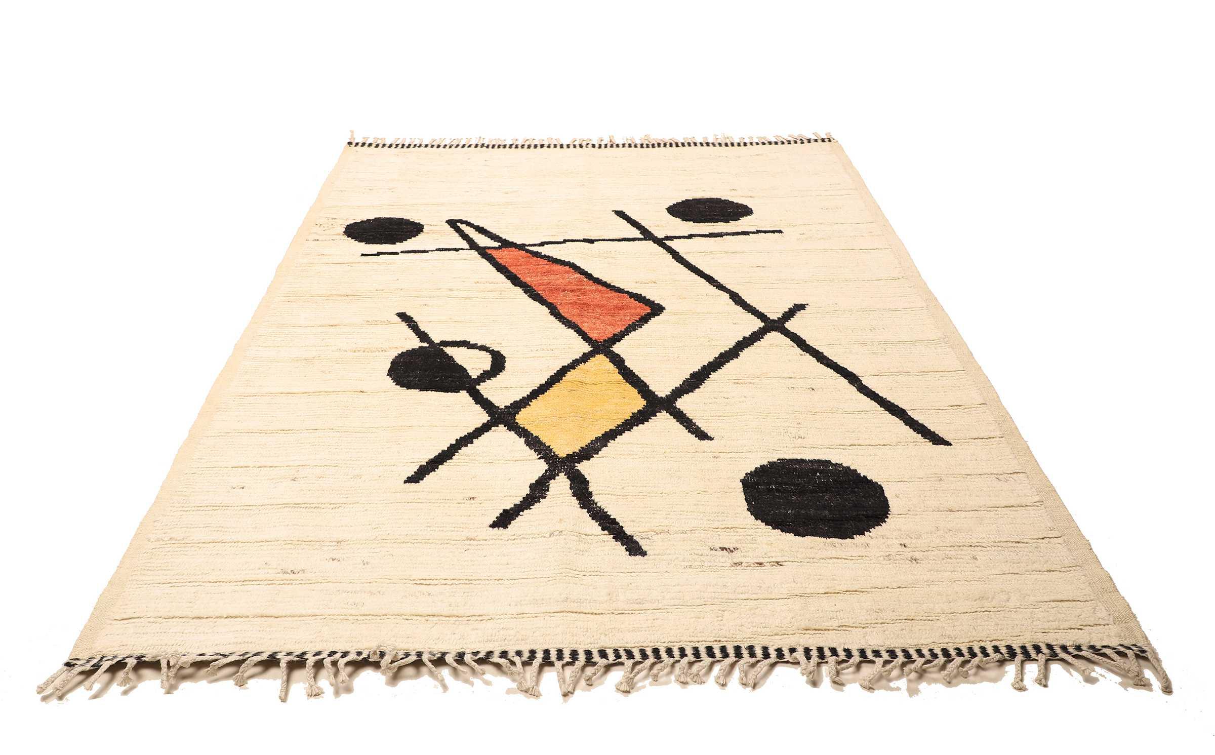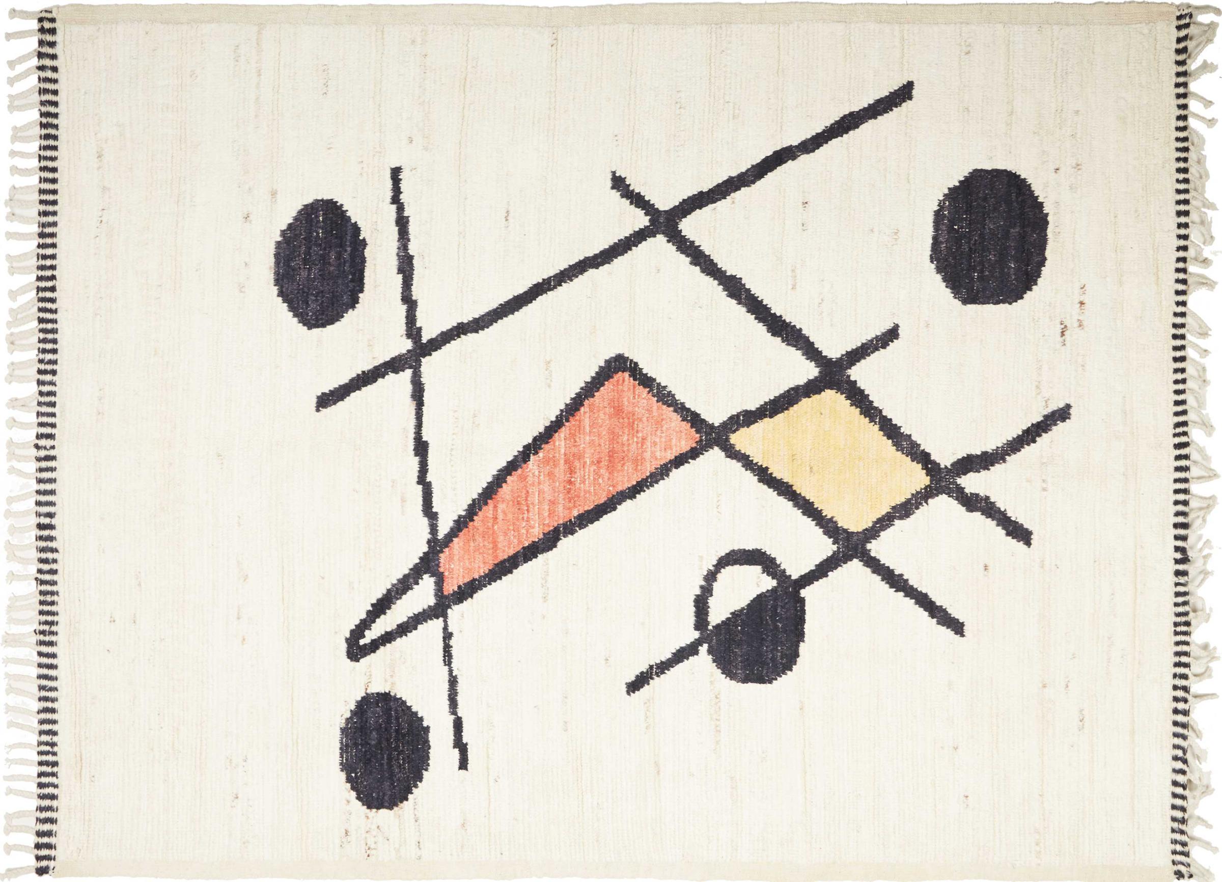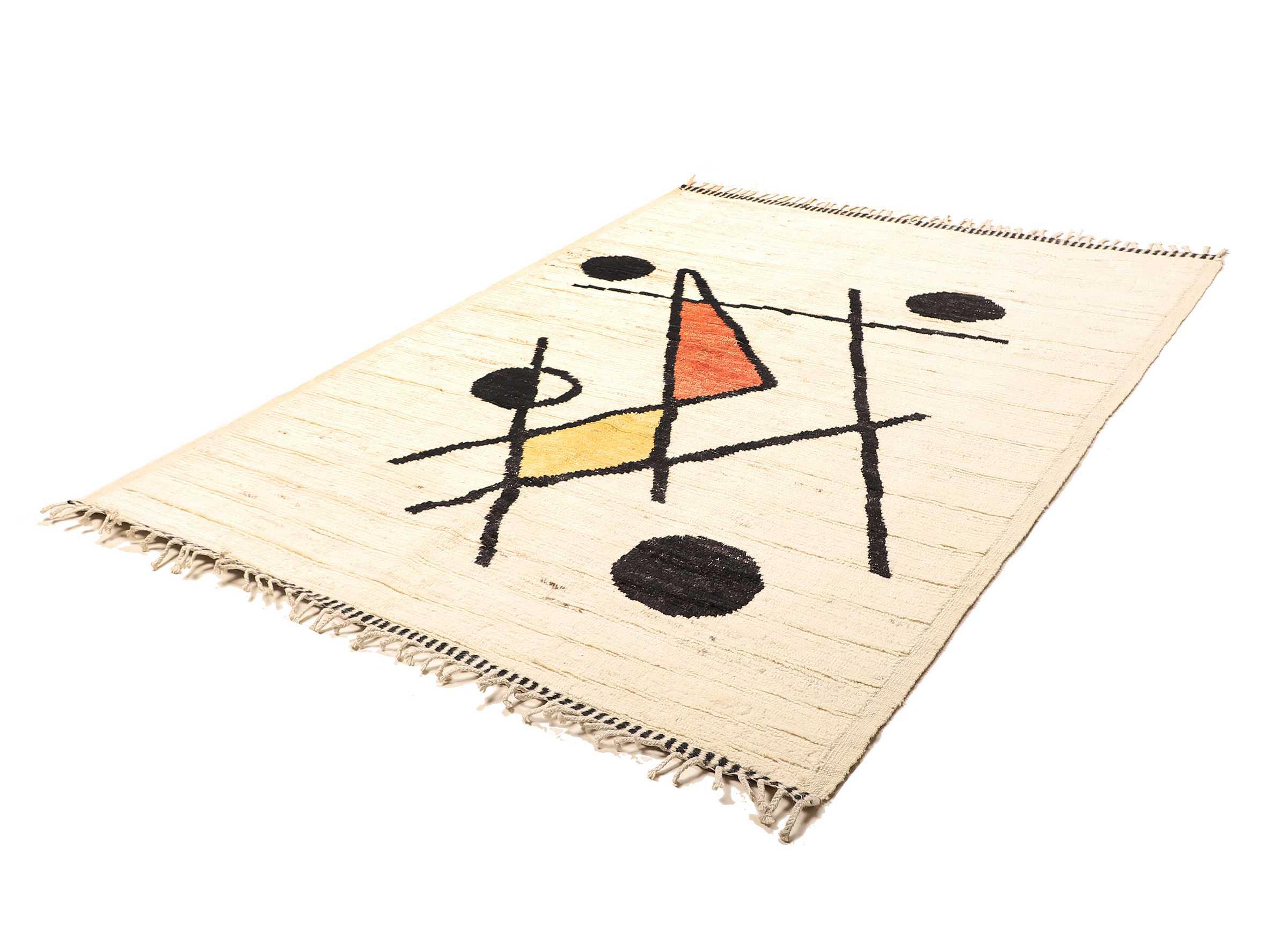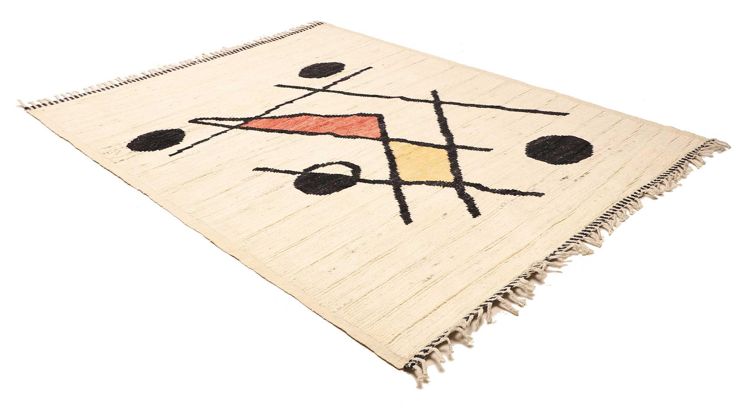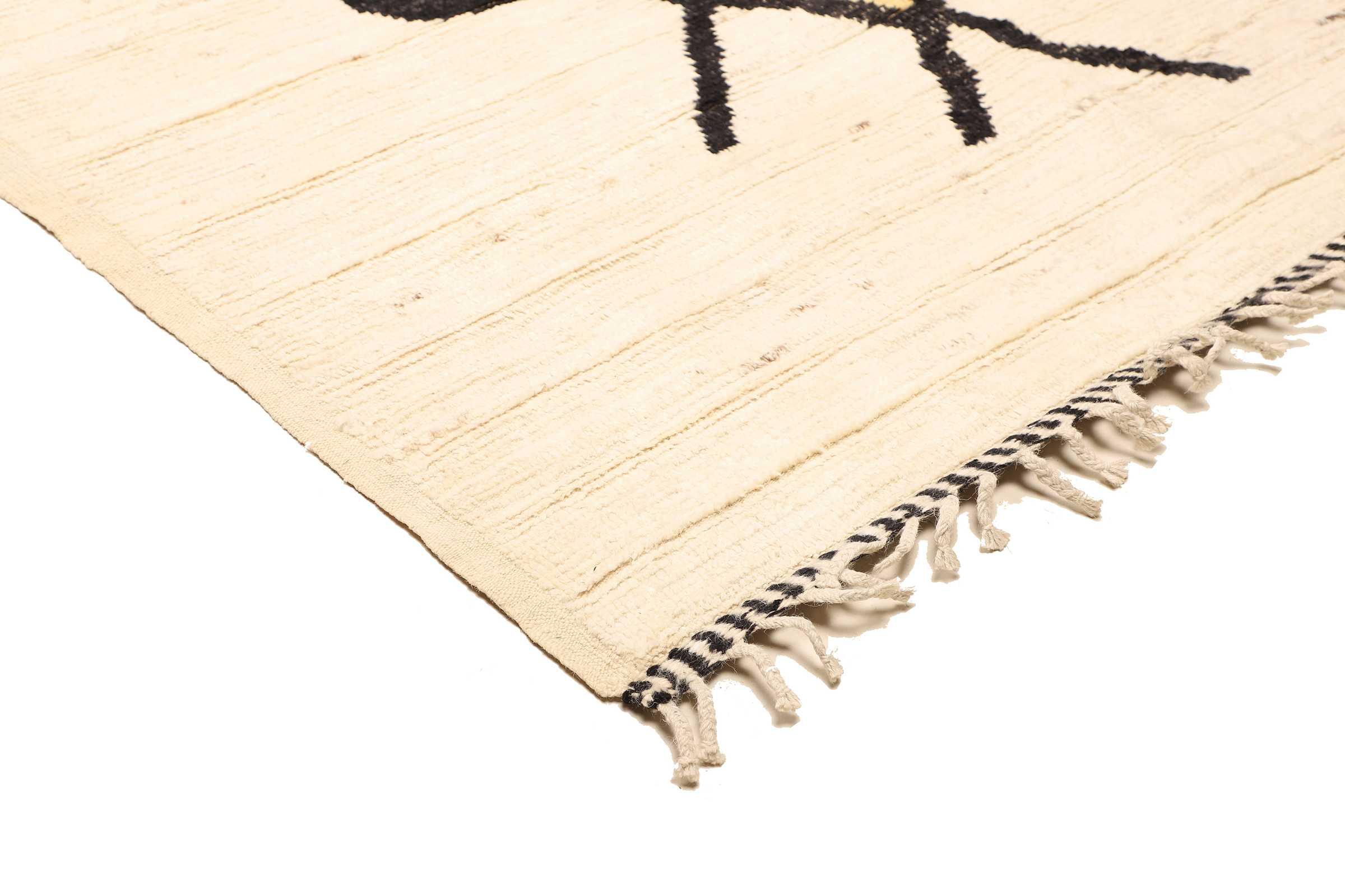 Carpet ID: 271012004013532 Size: 228x180 cm Thickness: ap. 25 mm Knot density: 96 000 - 120 000 / m² Manufacturing: Knotted by hand Pile: Handspun wool Warp: Cotton Origin: Afghanistan Age: New Weight: ap. 16 kg Also know as Beni Ourain, Beni Ouarain, Boucherouite In stock: Unique - Only 1 in stock