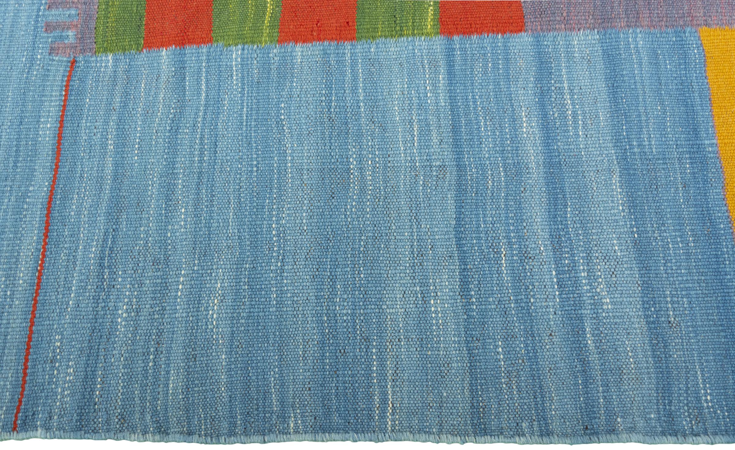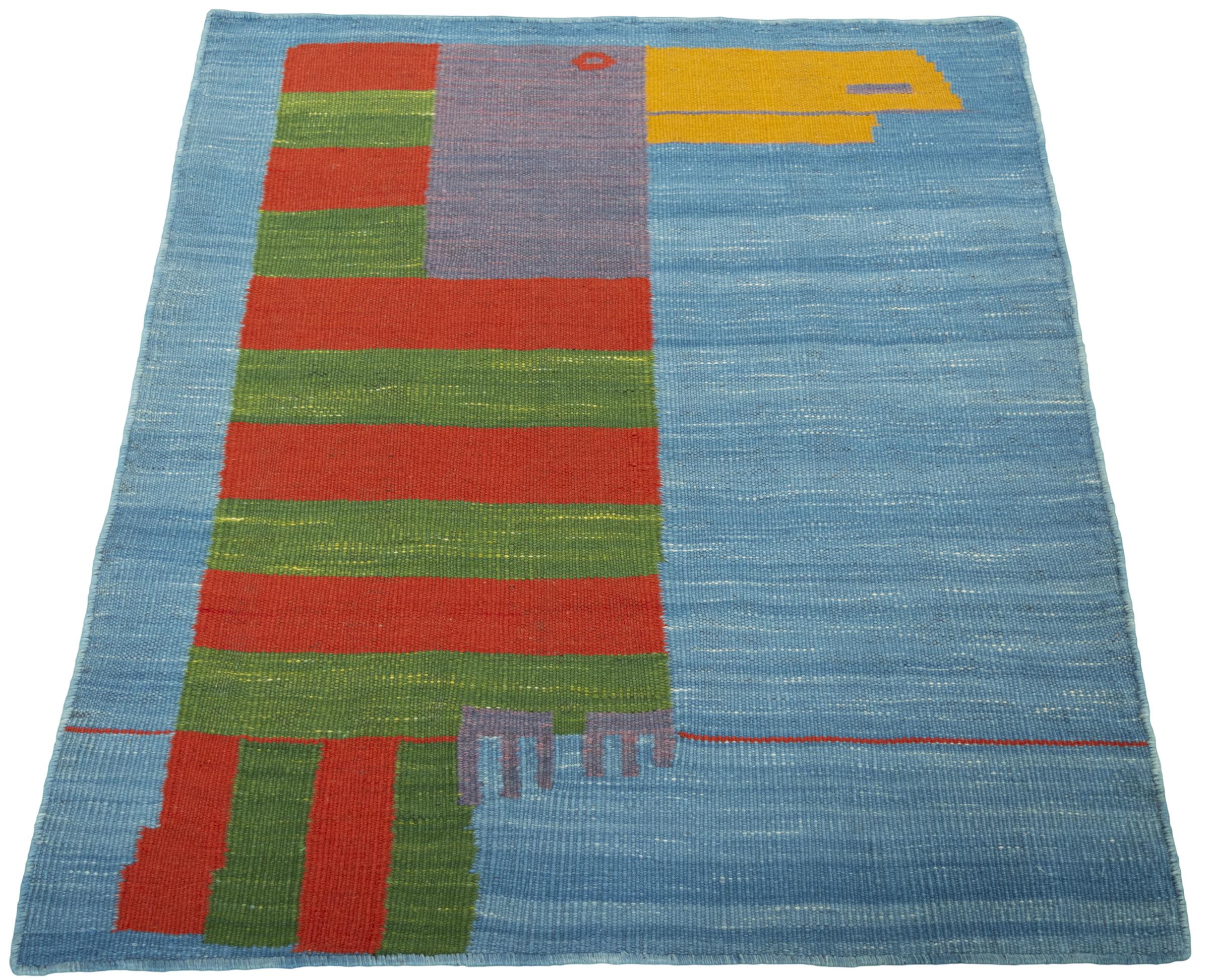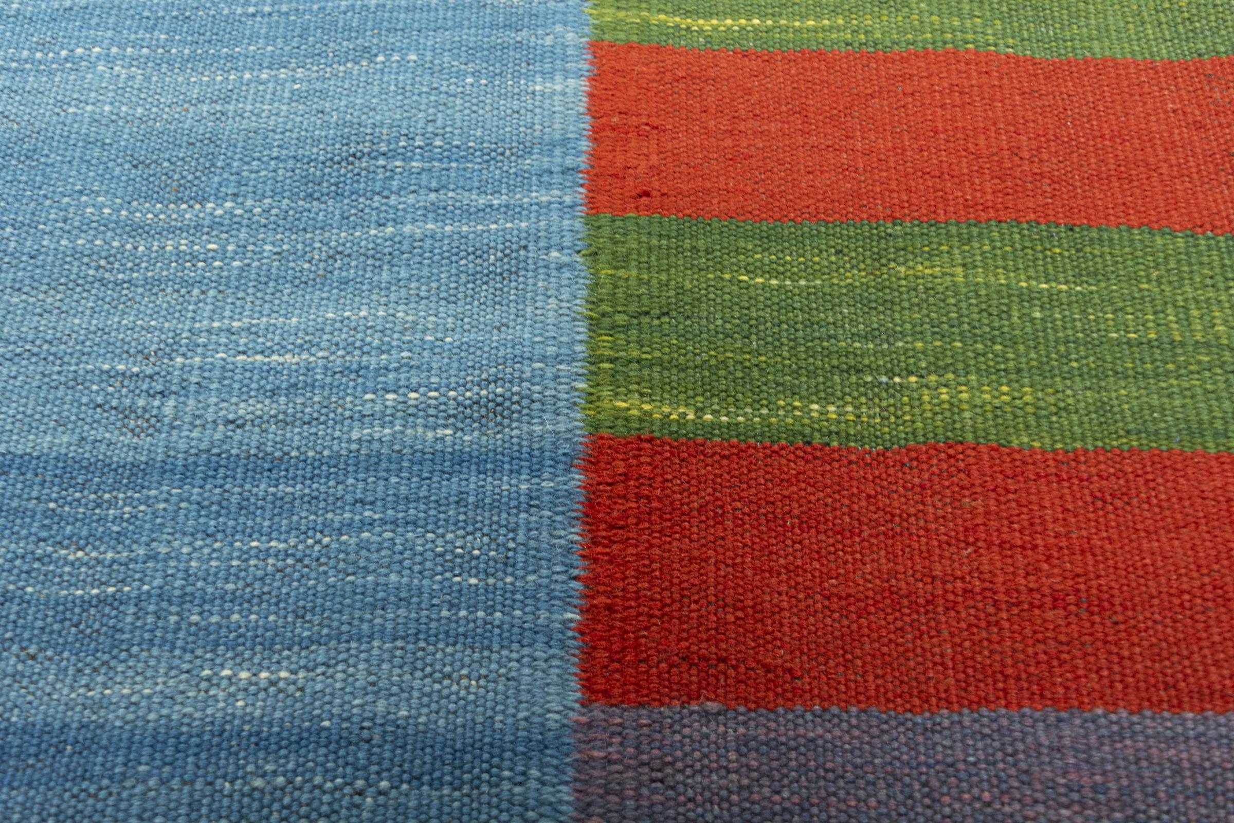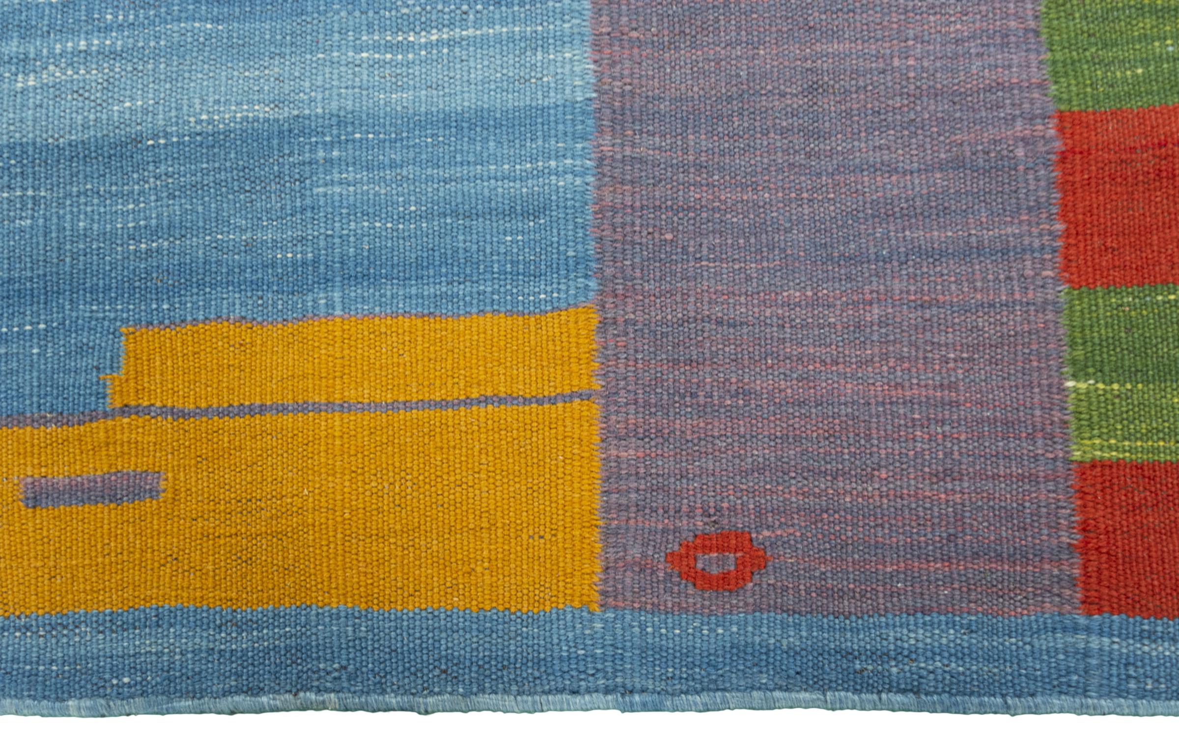 This rug was made as a flat weave by hand on a loom. Flatweave is the term used to describe rugs that have no pile. As the name promises, these rugs are woven and not knotted. This results in a flat rug with a structured surface. Flatweaves are not as soft and usually thinner than knotted rugs. At the same time they are much less complex to manufacture and can usually be laid out from both sides (front and back). Their patterns are usually geometric, which is determined by the fabric.