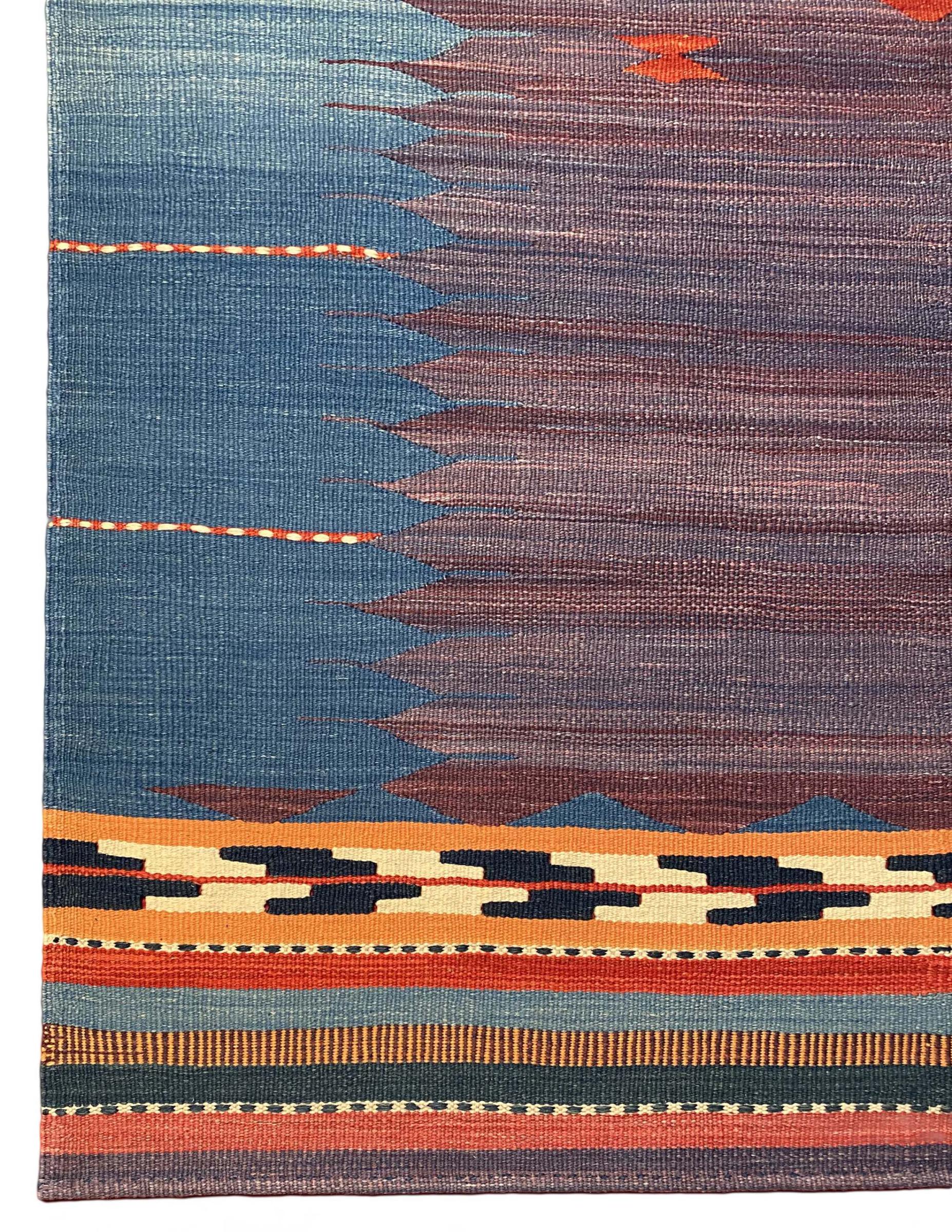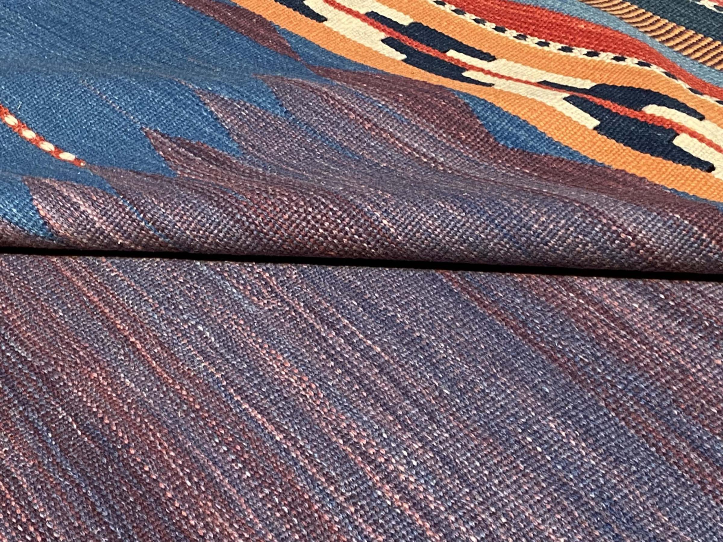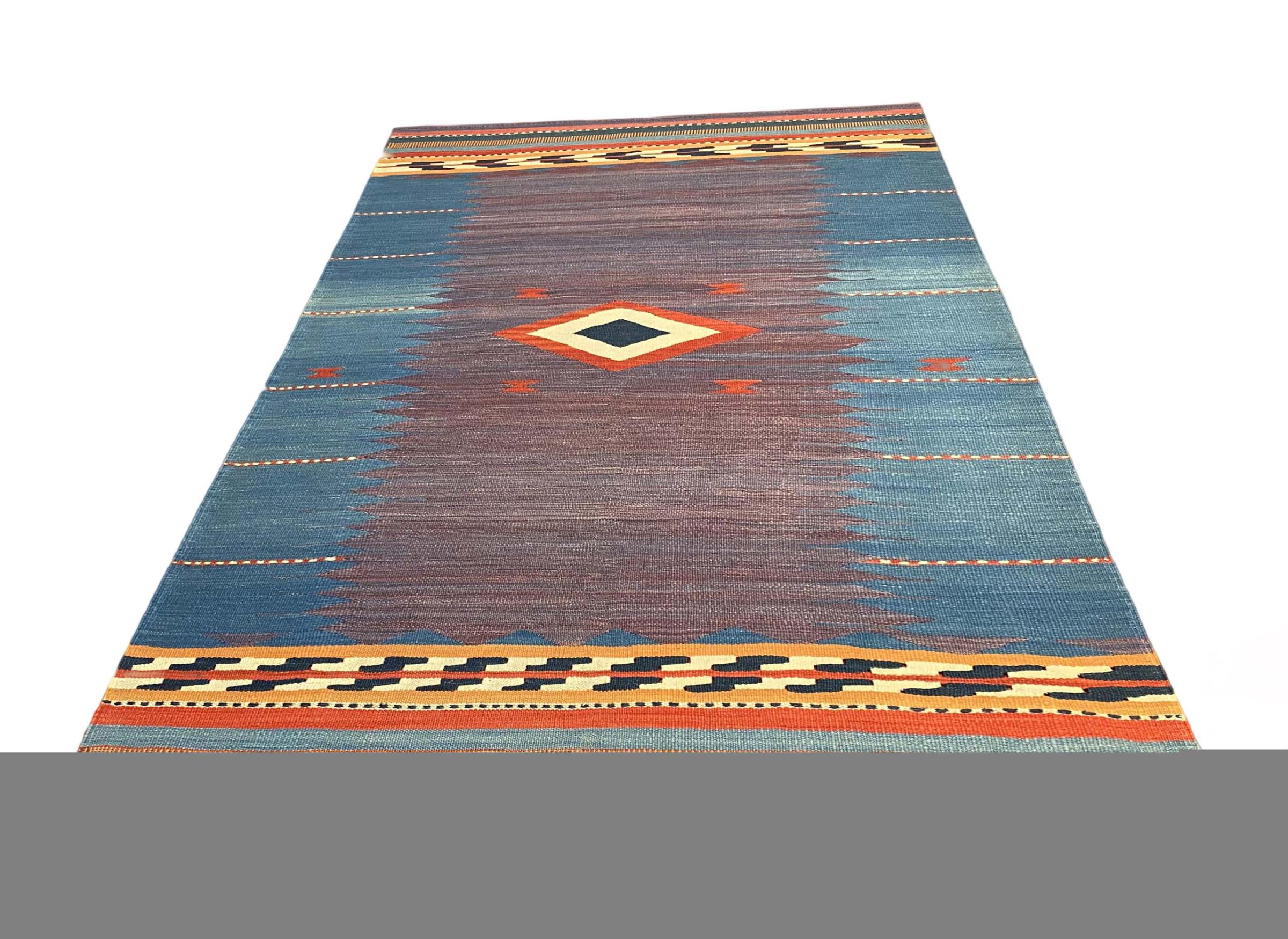 This rug was made as a flat weave by hand on a loom. Flatweave is the term used to describe rugs that have no pile. As the name promises, these rugs are woven and not knotted. This results in a flat rug with a structured surface. Flatweaves are not as soft and usually thinner than knotted rugs. At the same time they are much less complex to manufacture and can usually be laid out from both sides (front and back). Their patterns are usually geometric, which is determined by the fabric.