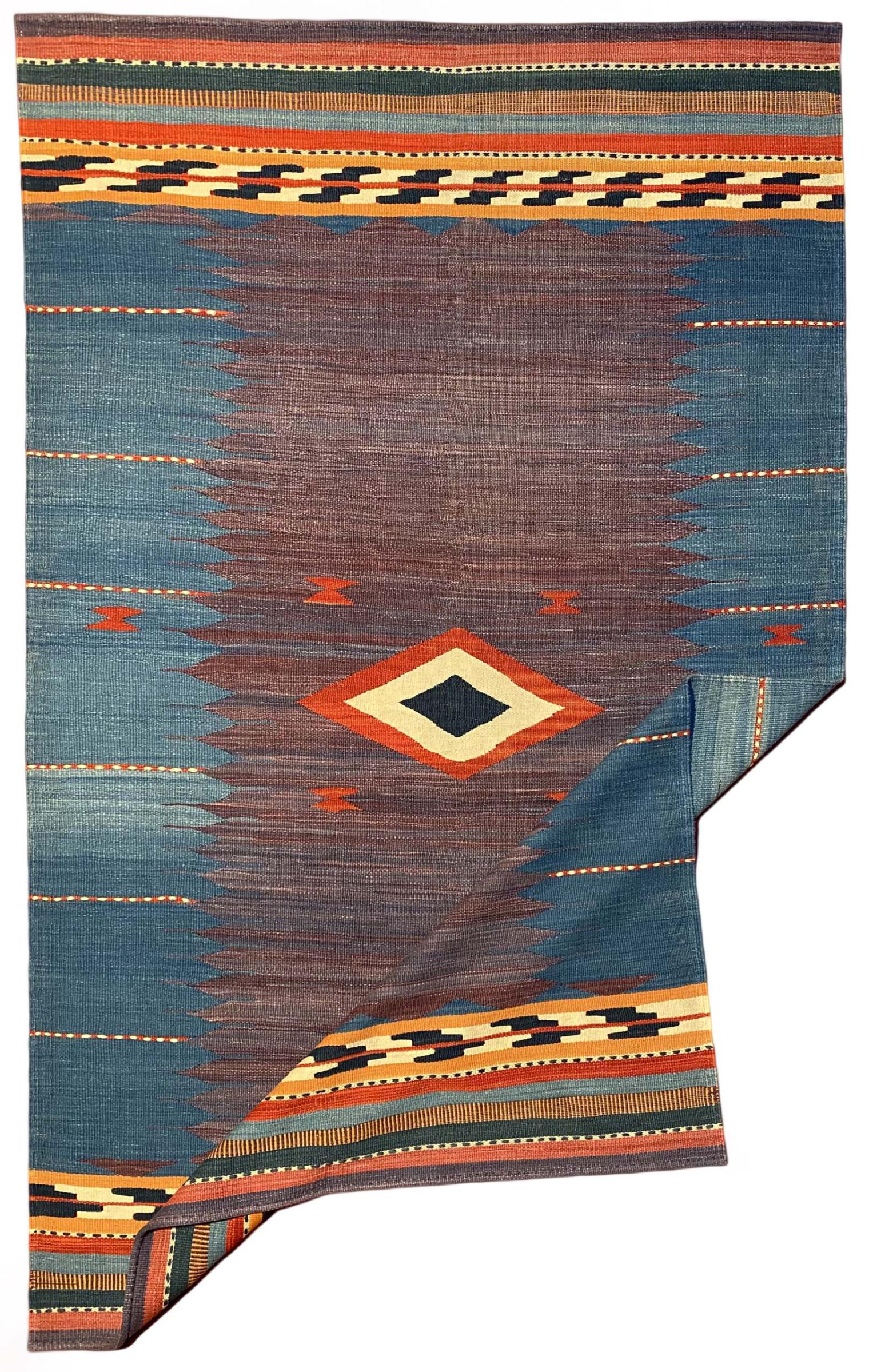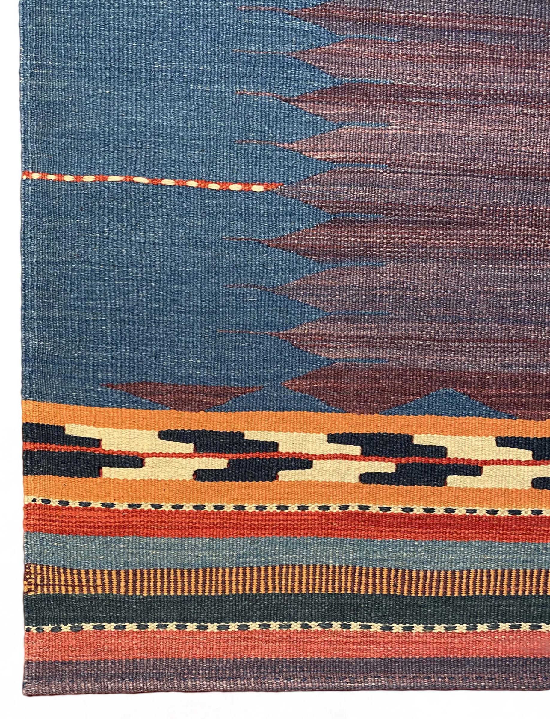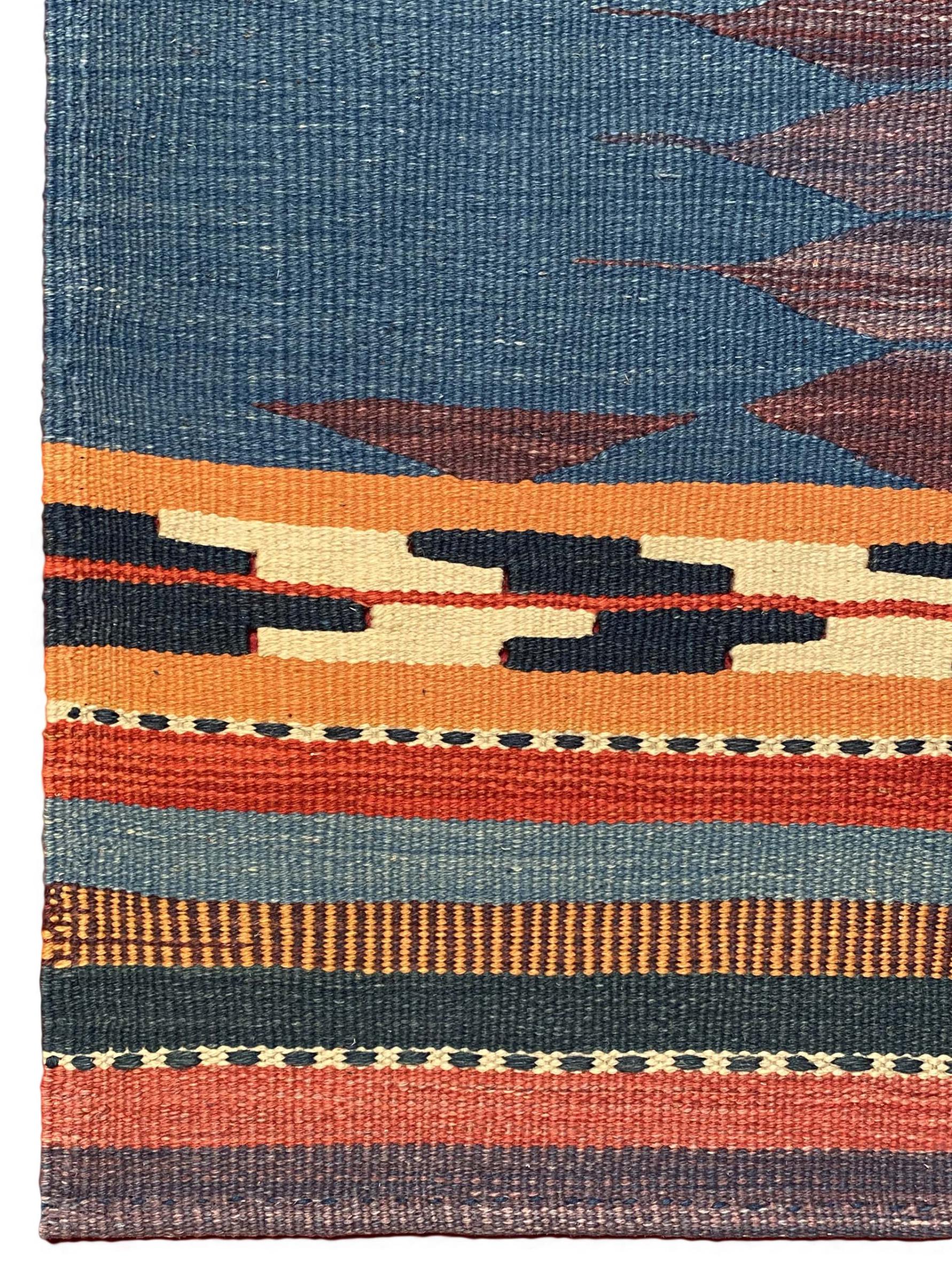 This rug was made as a flat weave by hand on a loom. Flatweave is the term used to describe rugs that have no pile. As the name promises, these rugs are woven and not knotted. This results in a flat rug with a structured surface. Flatweaves are not as soft and usually thinner than knotted rugs. At the same time they are much less complex to manufacture and can usually be laid out from both sides (front and back). Their patterns are usually geometric, which is determined by the fabric.