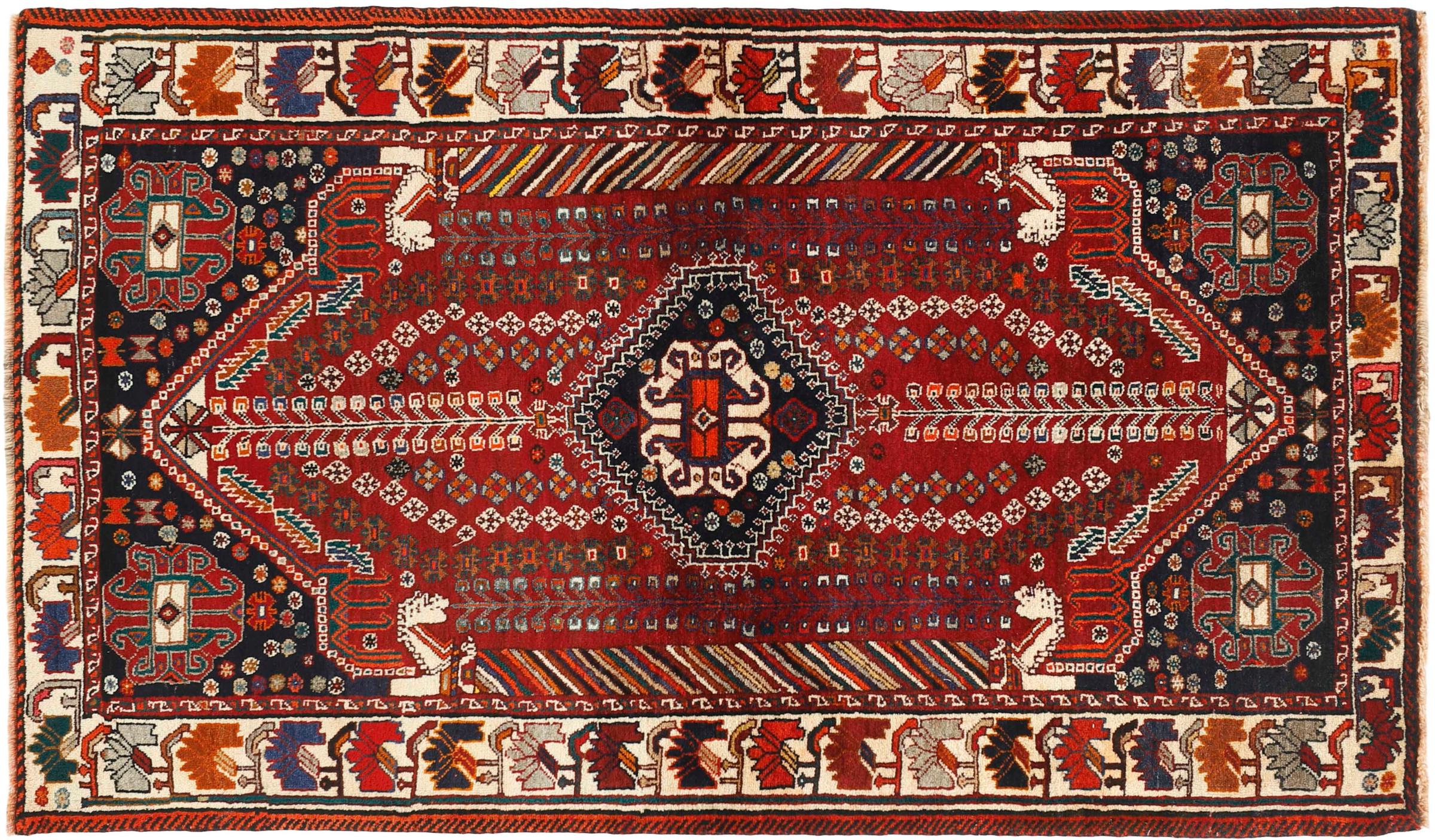 This rug belongs to village and nomadic rugs from Iran, formerly Persia. This type of rug is knotted by hand in smaller towns and villages in old tradition. Even nomads still knot Persian rugs in the open air. The rugs are knotted without a draft and completely from the mind. They are characterized by classical ornaments, which are arranged in straight and geometrical patterns. Thanks to their cultural-traditional origin, these rugs have a unique character that embodies ancient Persia.