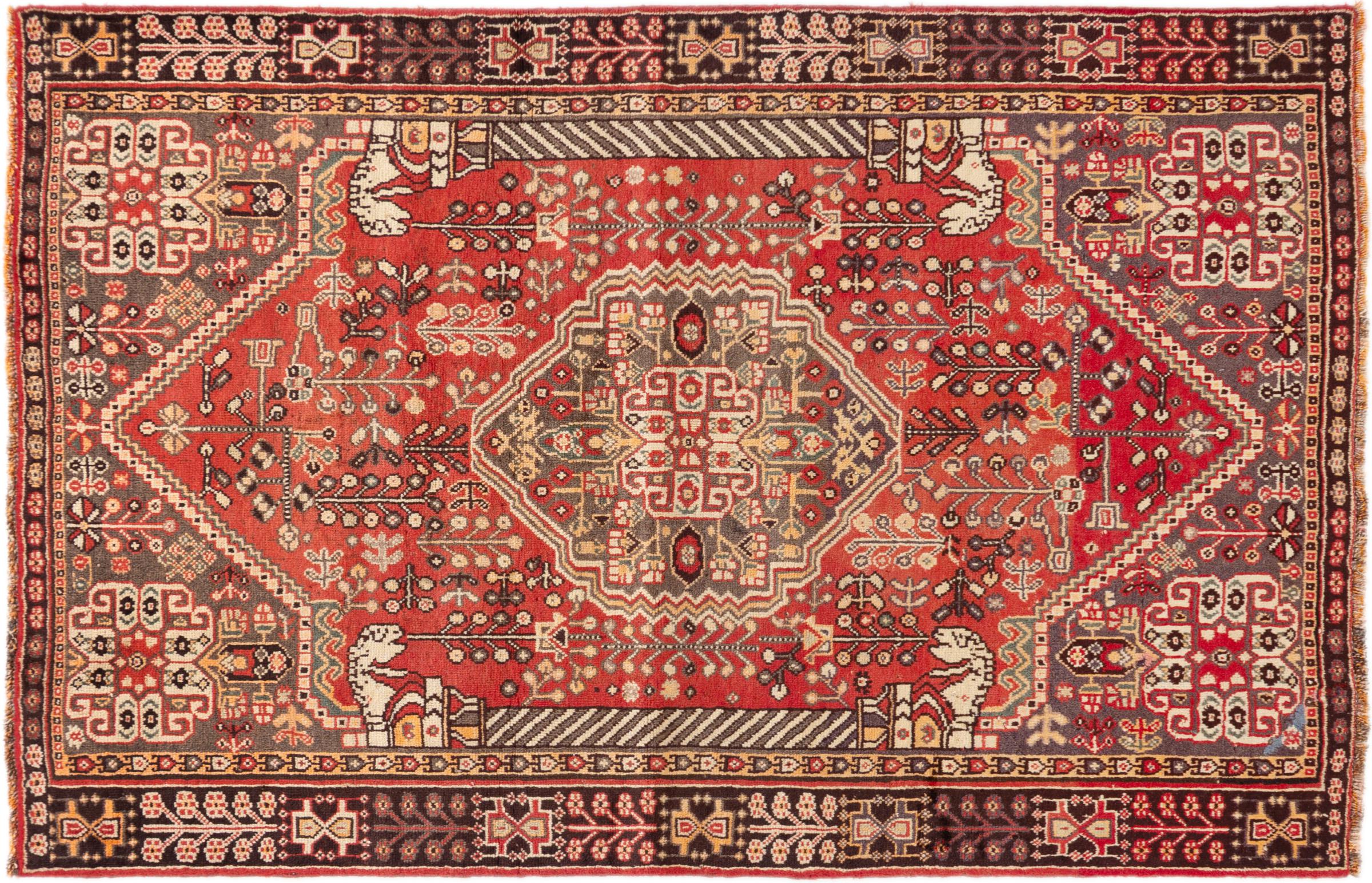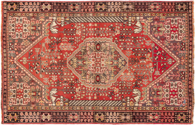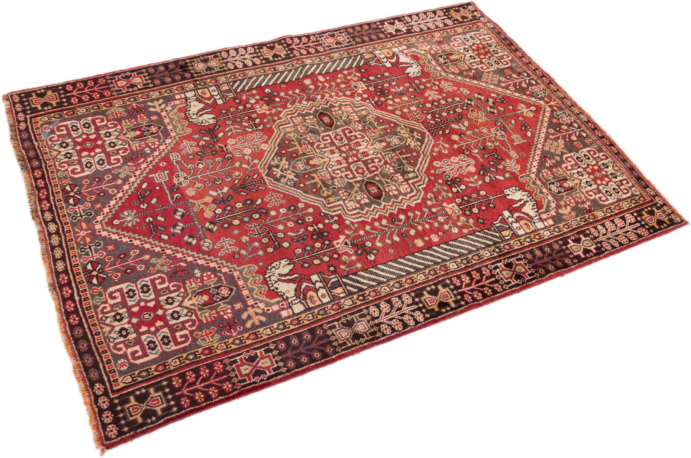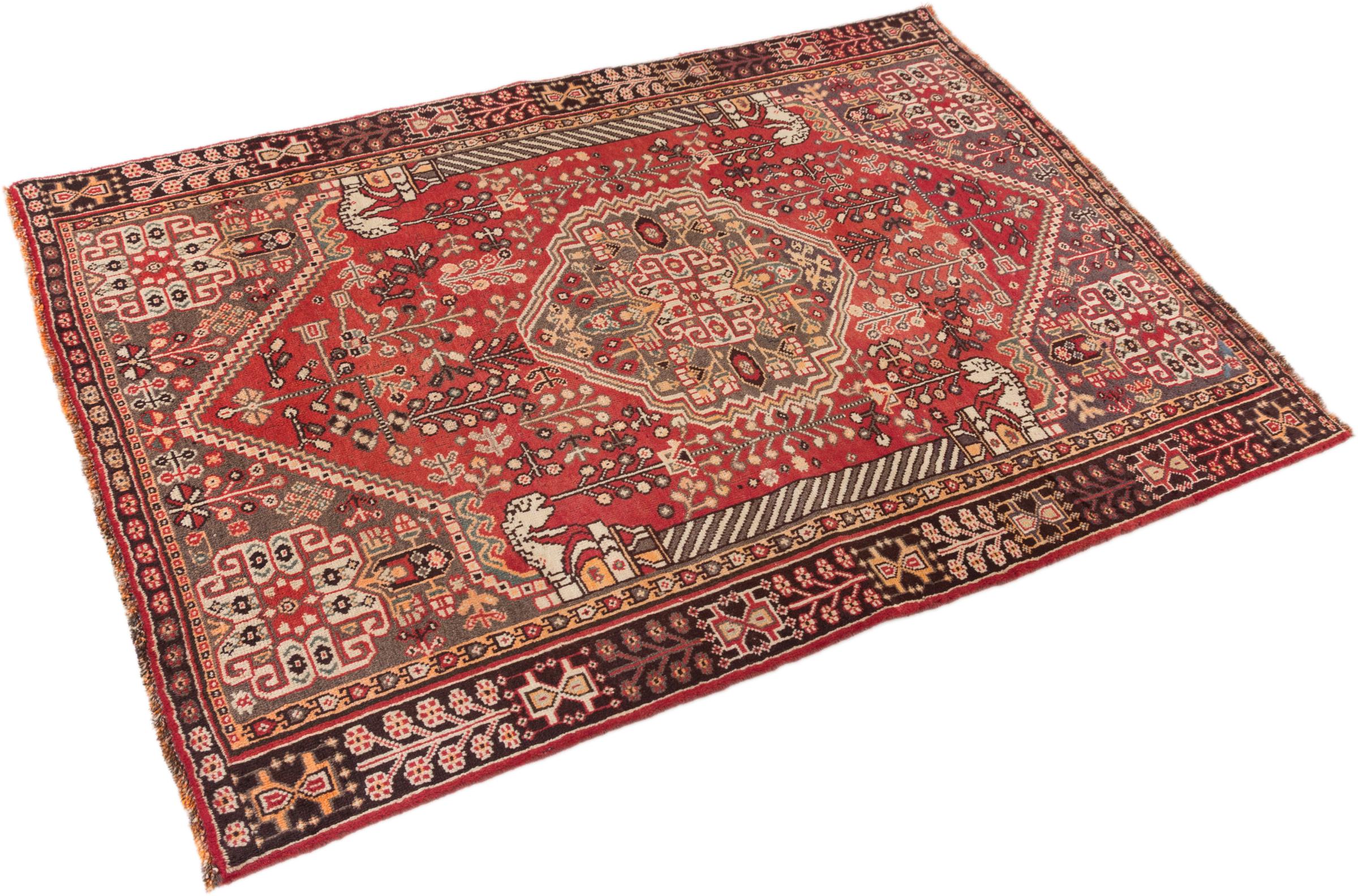 Carpet ID: 295484003770 Size: 187x118 cm Thickness: ap. 12 mm Knot density: 200 000 - 250 000 / m² Manufacturing: Knotted by hand Pile: Handspun wool Warp: Sheep wool Origin: Persia Age: Old/Semi antique, over 50 years Weight: ap. 8 kg Also know as Qashqai, Gaschgai, Gashghai, Kashgai In stock: Unique - Only 1 in stock