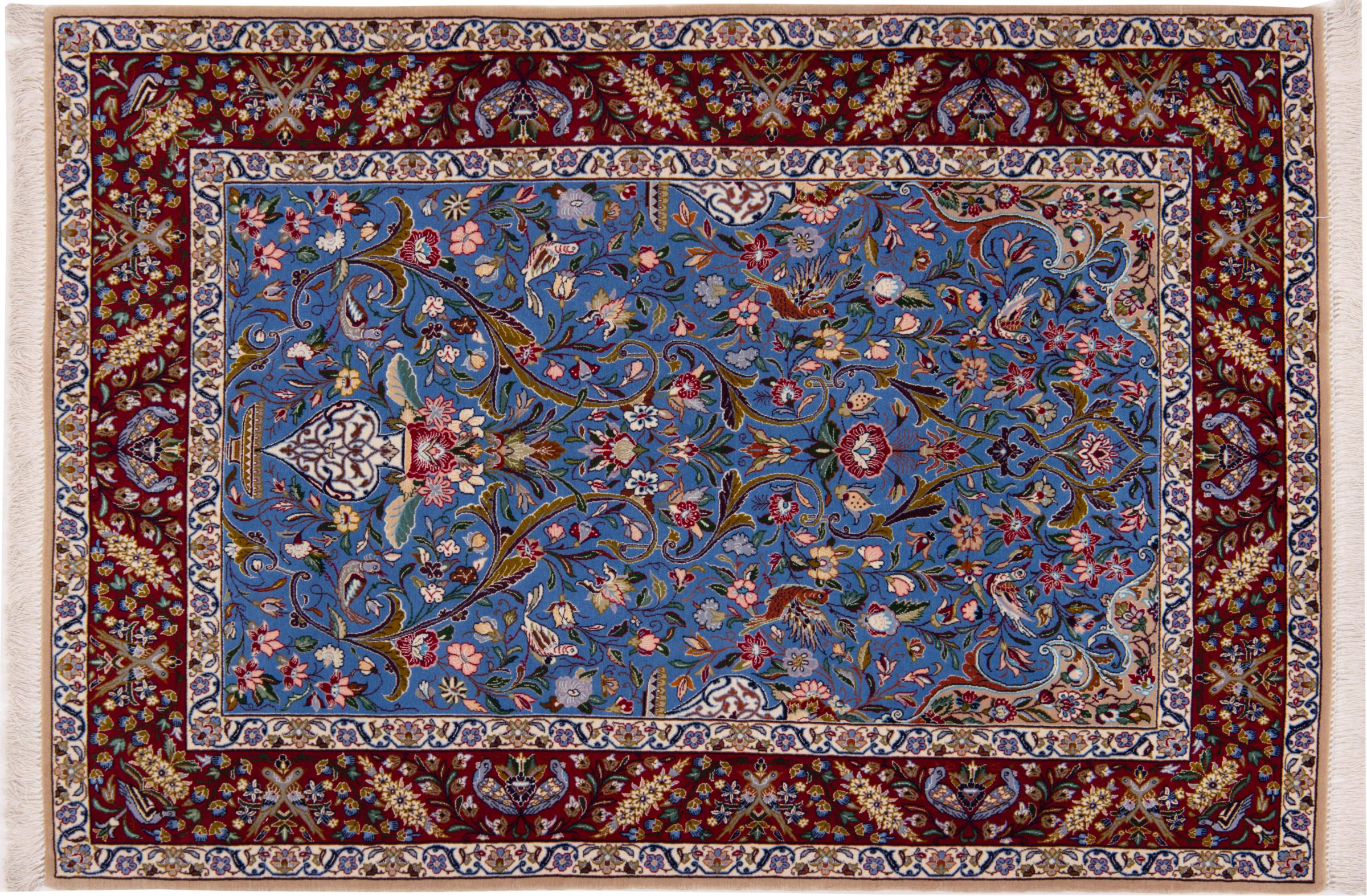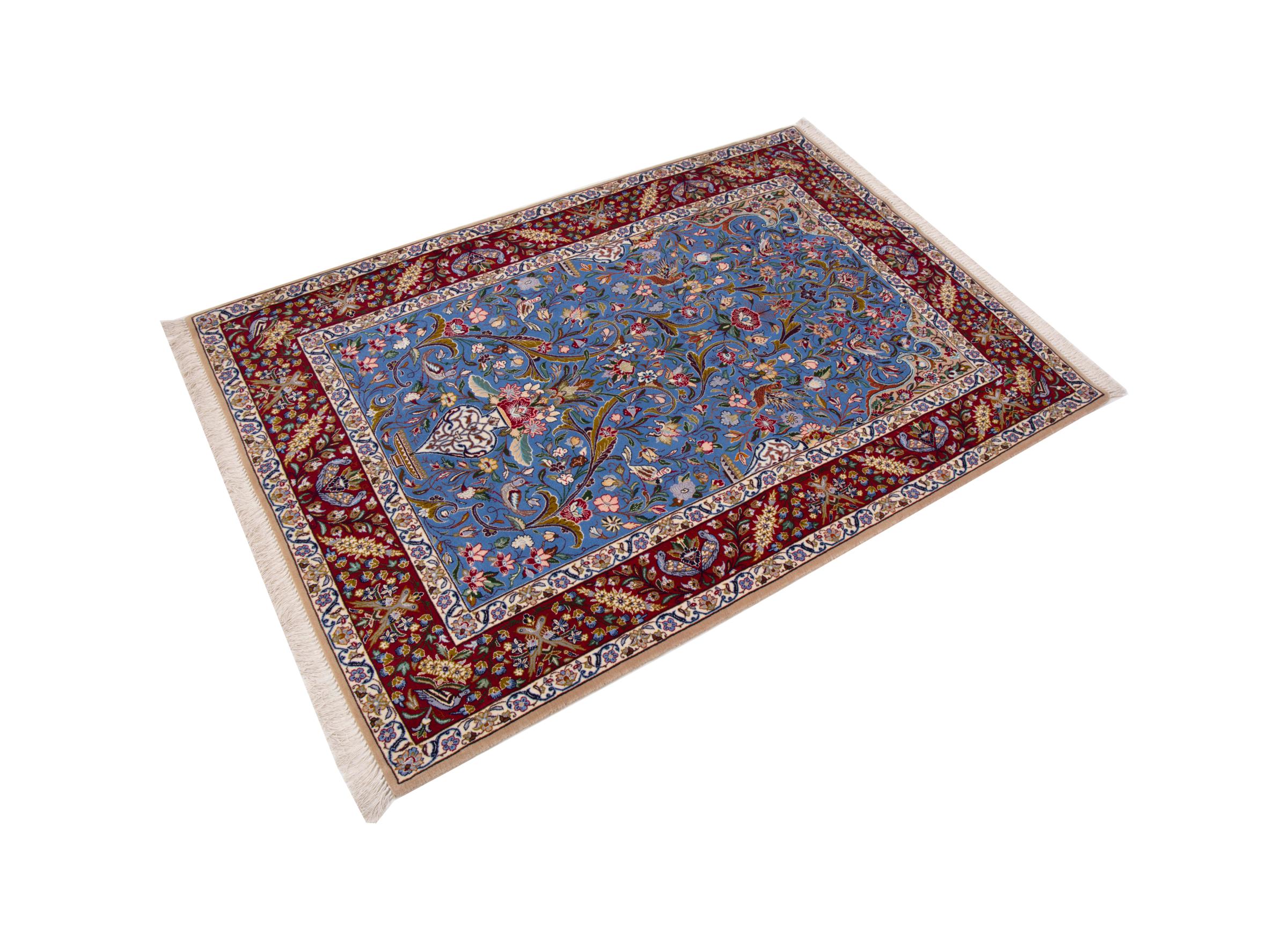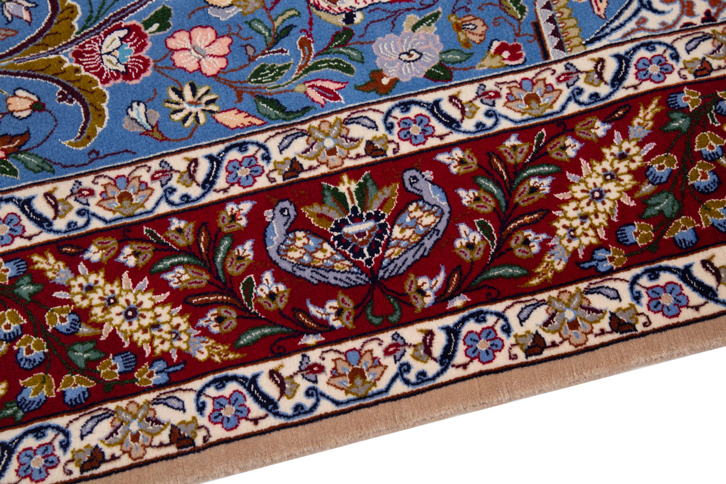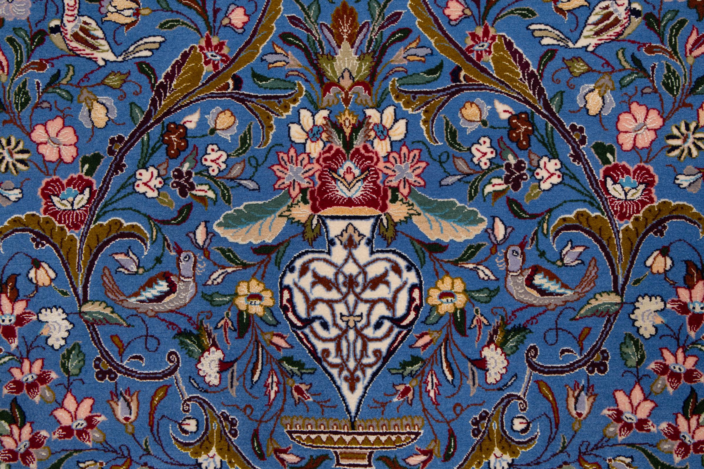This Isfahan carpet is a piece of the most traditional handicraft. It has been made by hand with the most beautiful patterns. In fact, Isfahan carpets are known to count to the finest Persian carpets. This one has been knotted in Isfahan, which is famous of being the most beautiful city in Iran. The carpet is an exceptionally piece of art.
