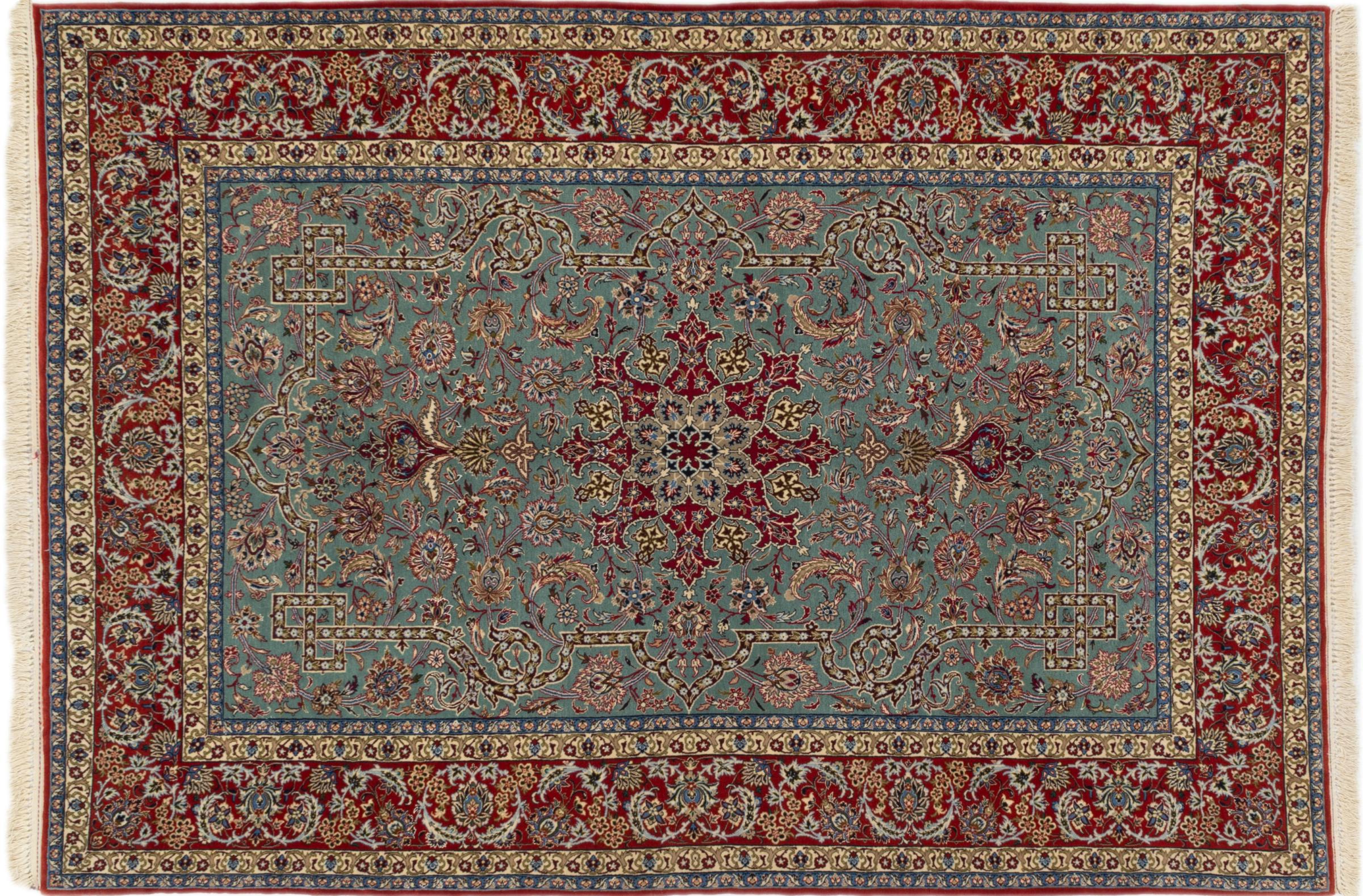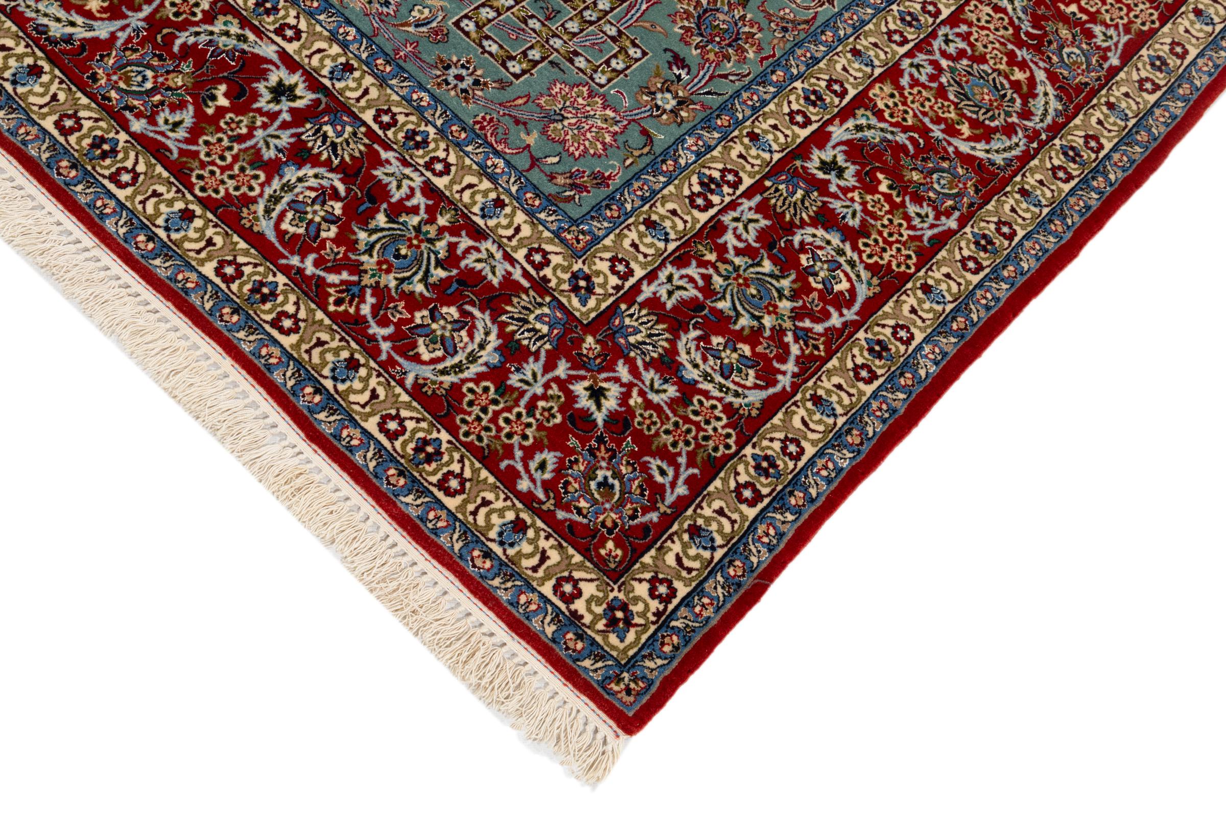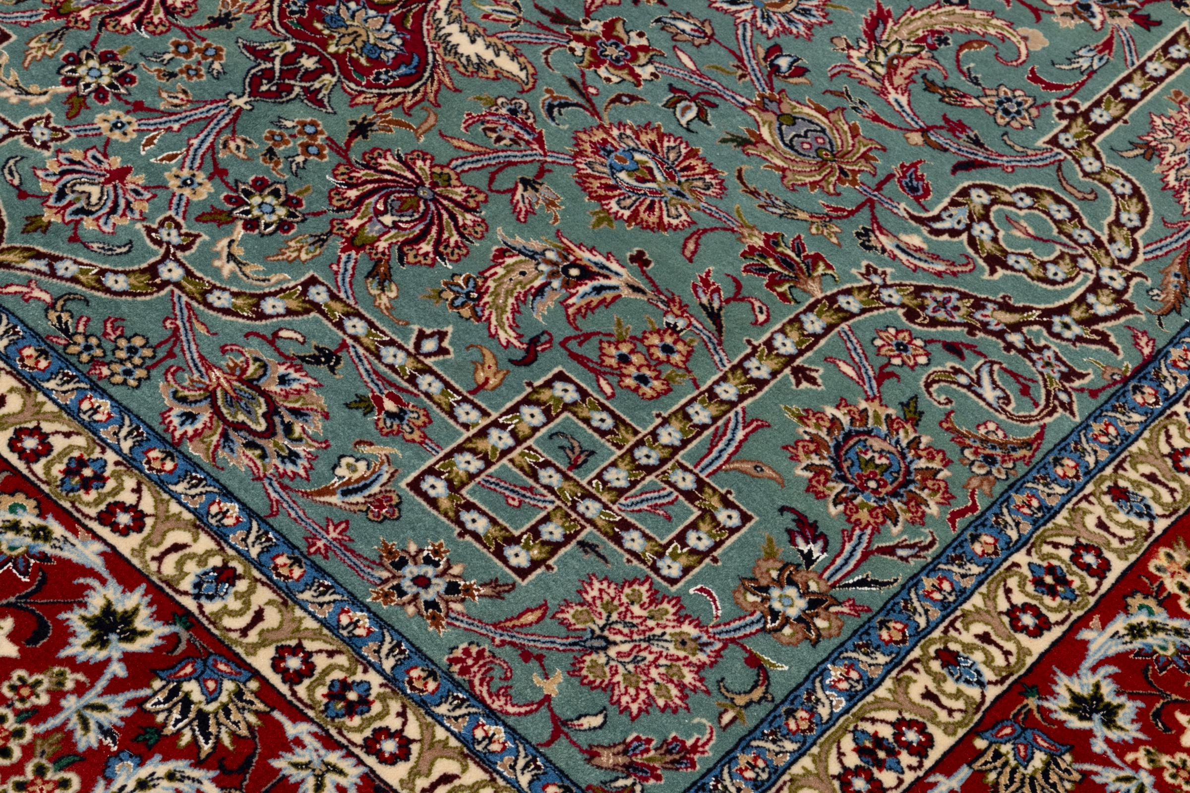 This Isfahan carpet is a piece of the most traditional handicraft. It has been made by hand with the most beautiful patterns. In fact, Isfahan carpets are known to count to the finest Persian carpets. This one has been knotted in Isfahan, which is famous of being the most beautiful city in Iran. The carpet is an exceptionally piece of art.