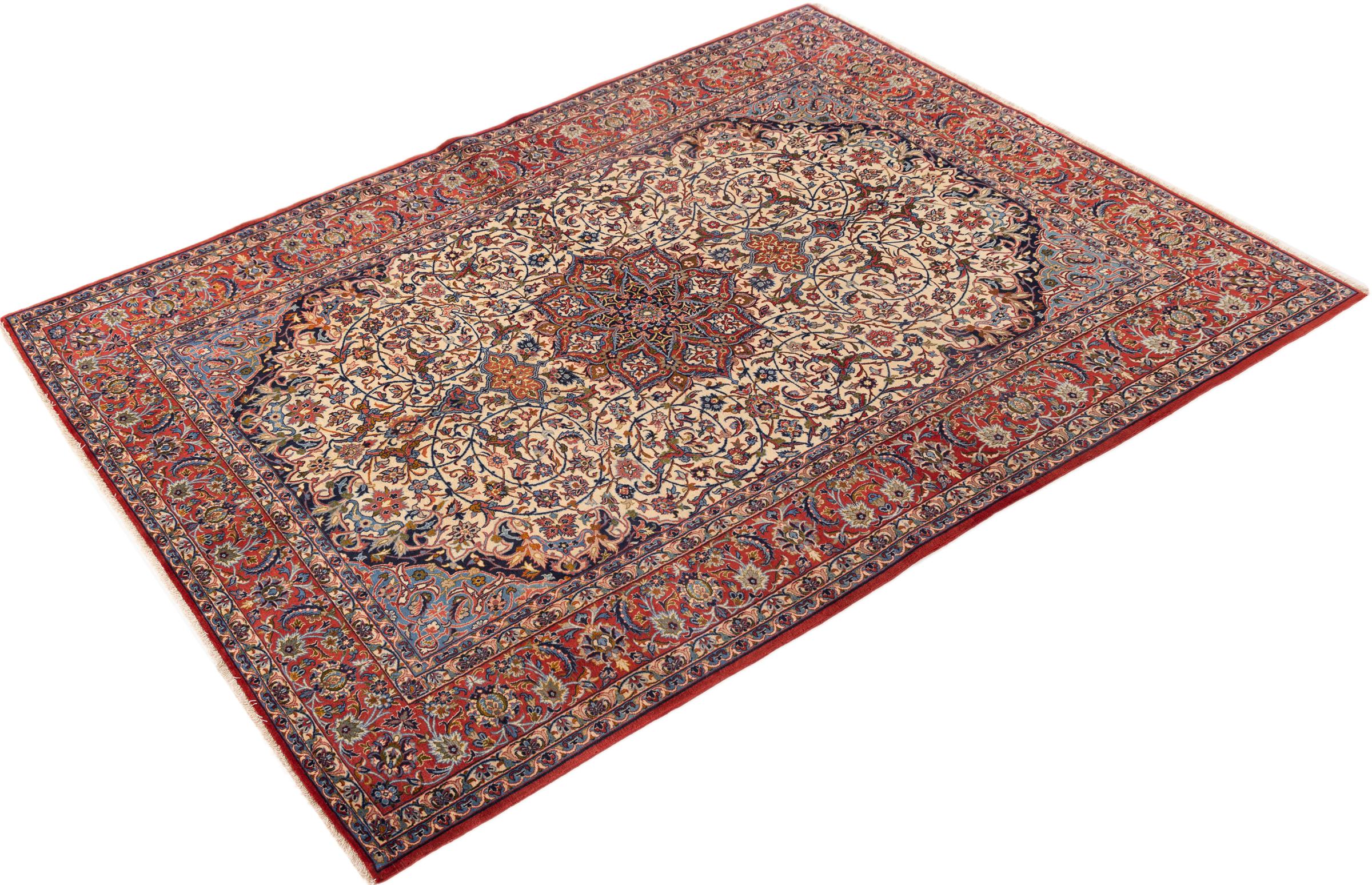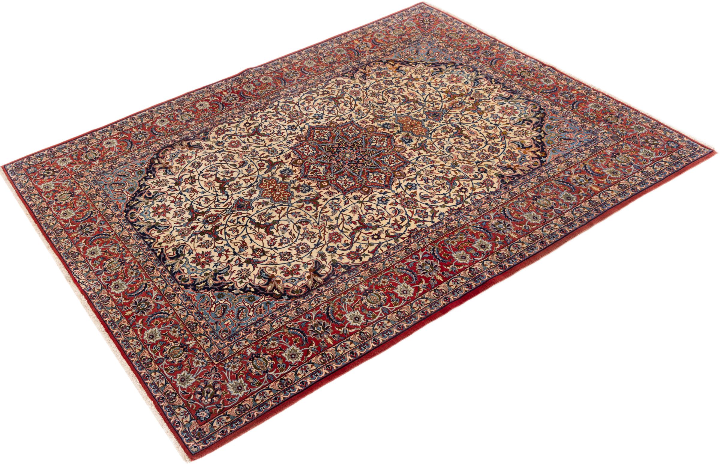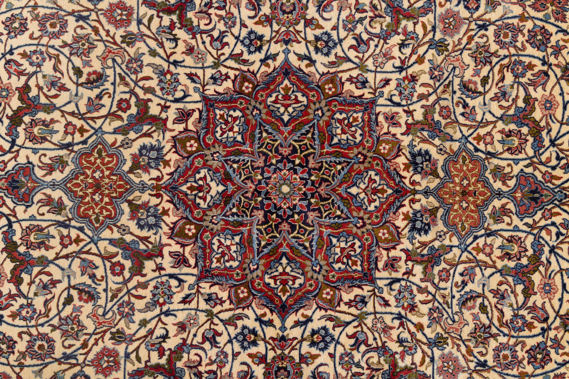 This Isfahan carpet is a piece of the most traditional handicraft. It has been made by hand with the most beautiful patterns. In fact, Isfahan carpets are known to count to the finest Persian carpets. This one has been knotted in Isfahan, which is famous of being the most beautiful city in Iran. The carpet is an exceptionally piece of art.