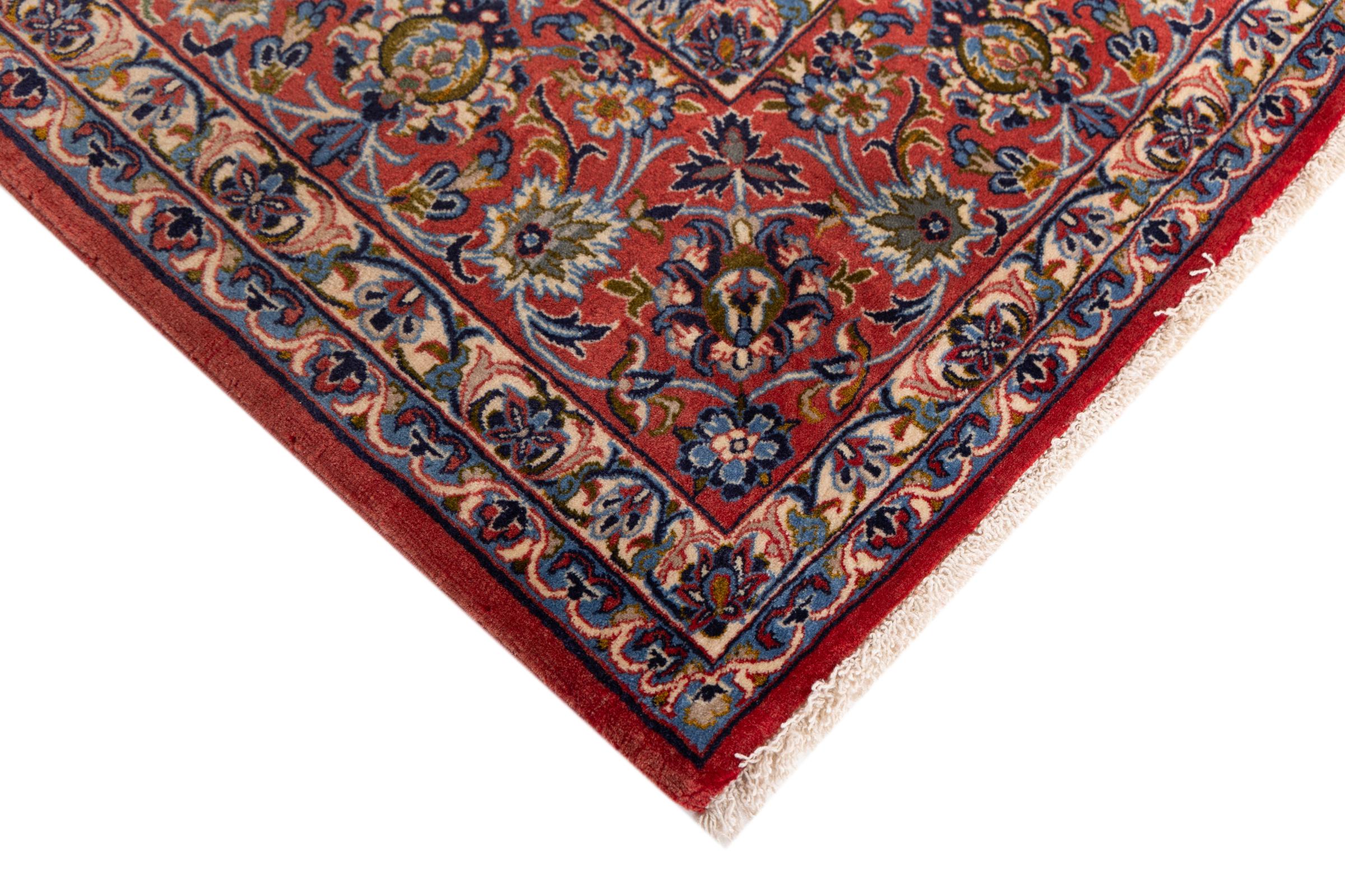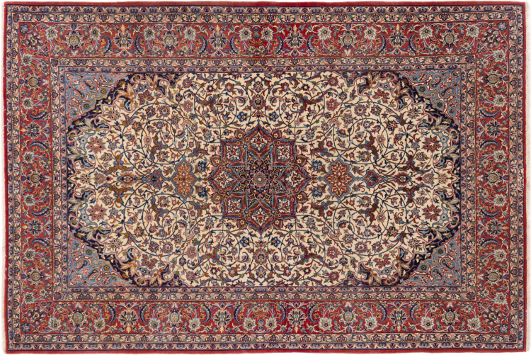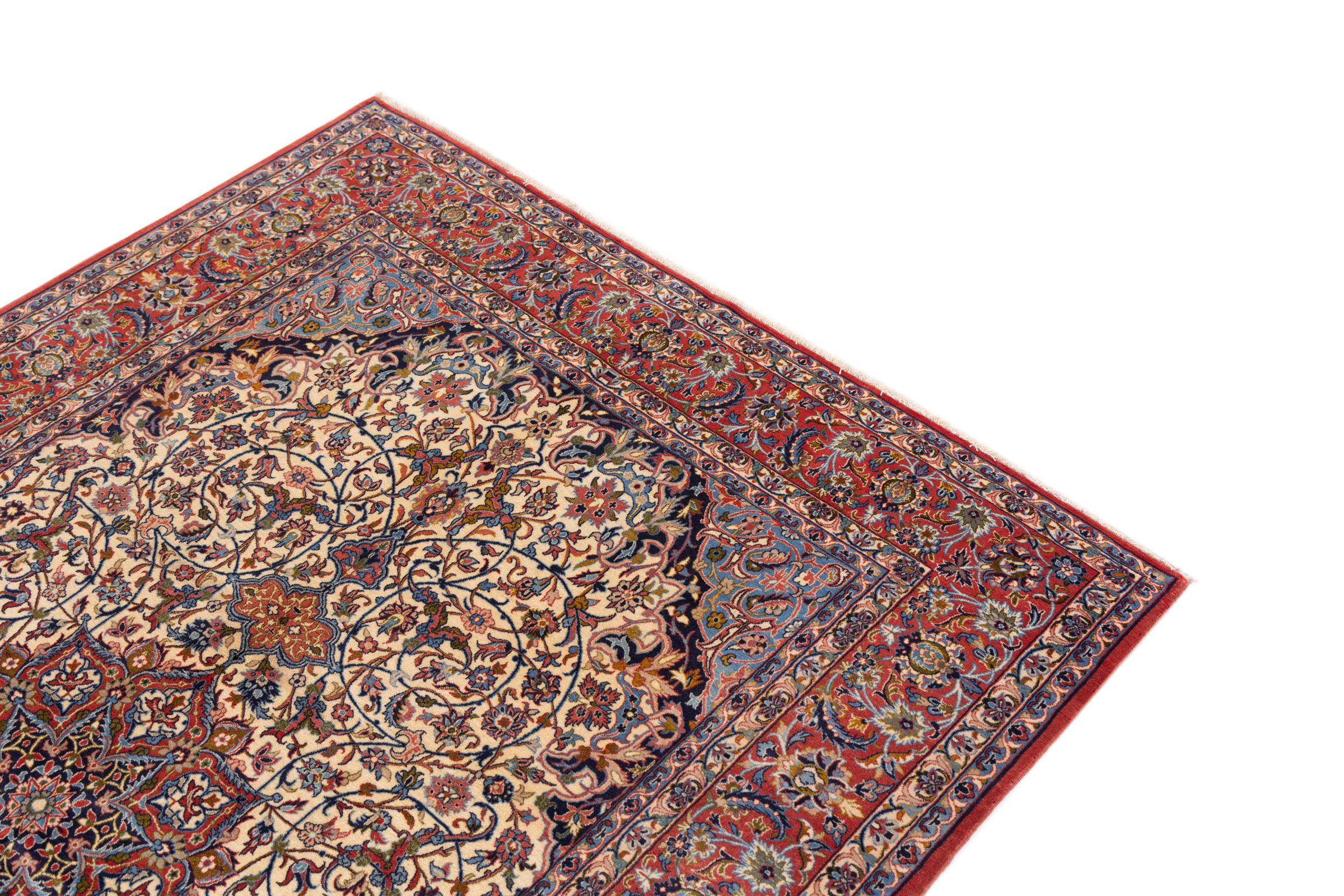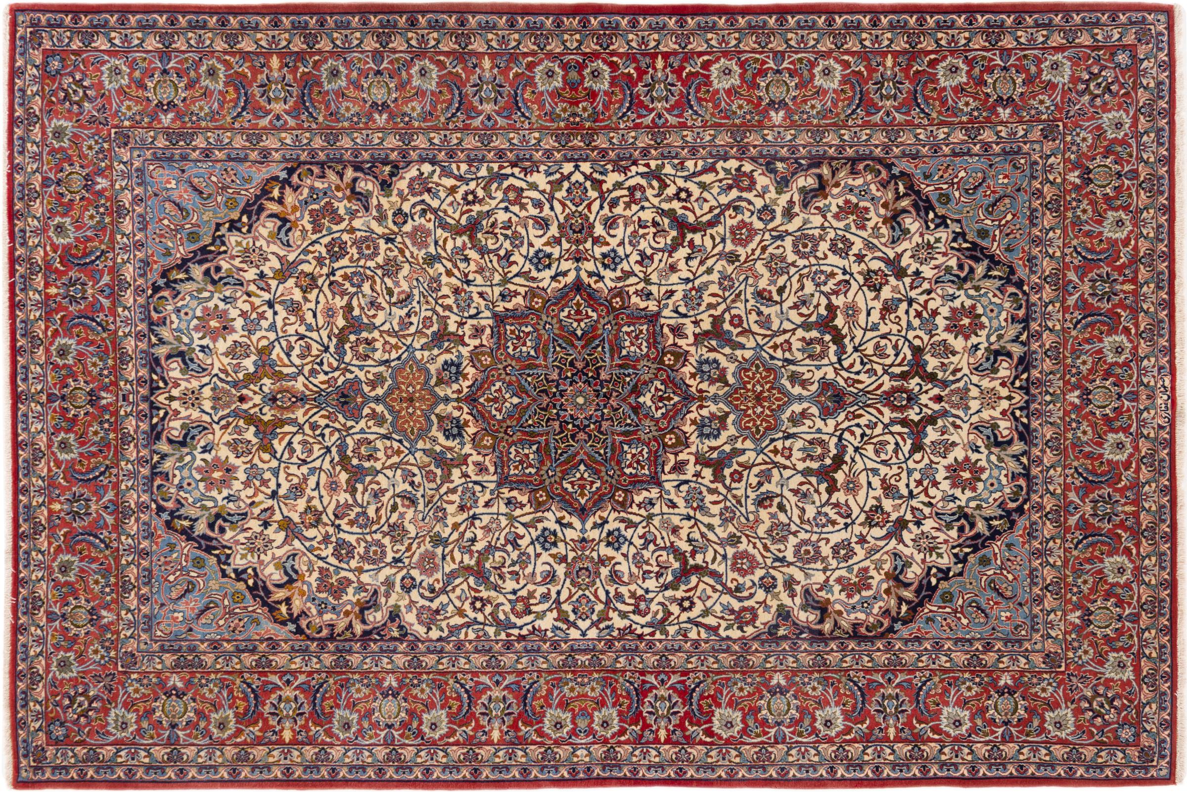 This Isfahan carpet is a piece of the most traditional handicraft. It has been made by hand with the most beautiful patterns. In fact, Isfahan carpets are known to count to the finest Persian carpets. This one has been knotted in Isfahan, which is famous of being the most beautiful city in Iran. The carpet is an exceptionally piece of art.