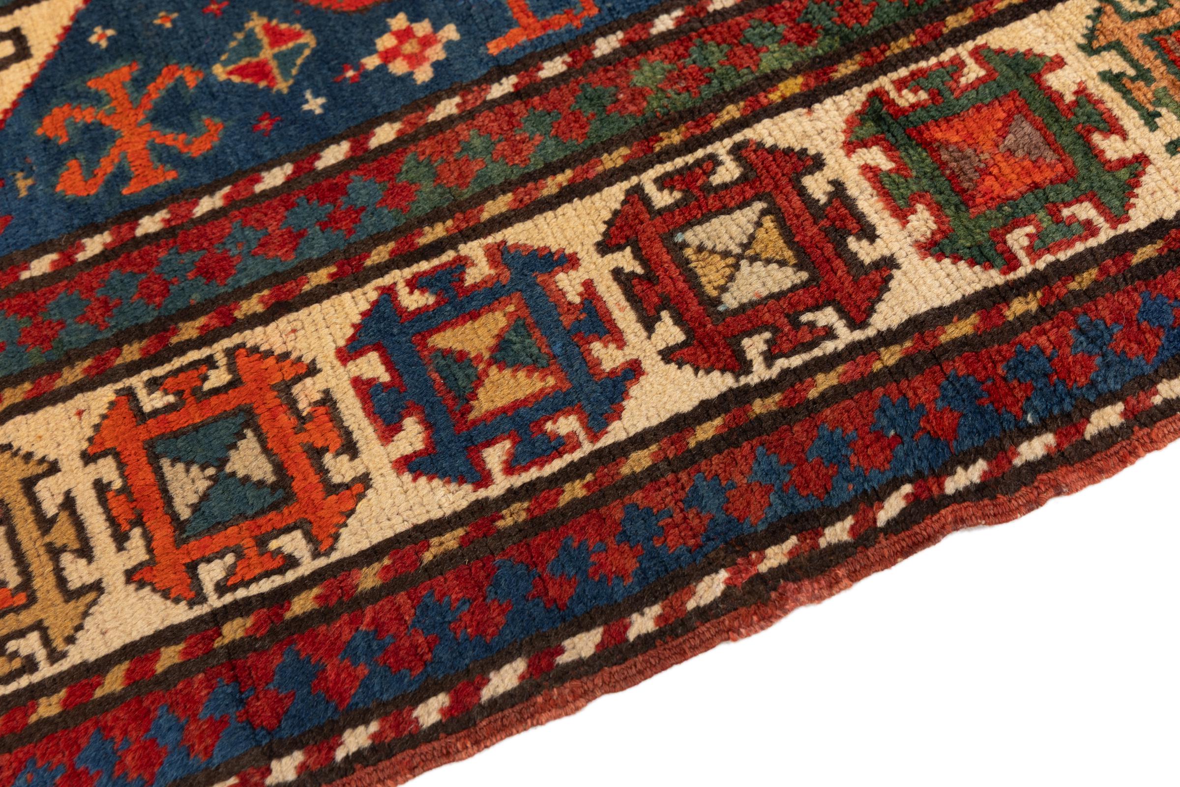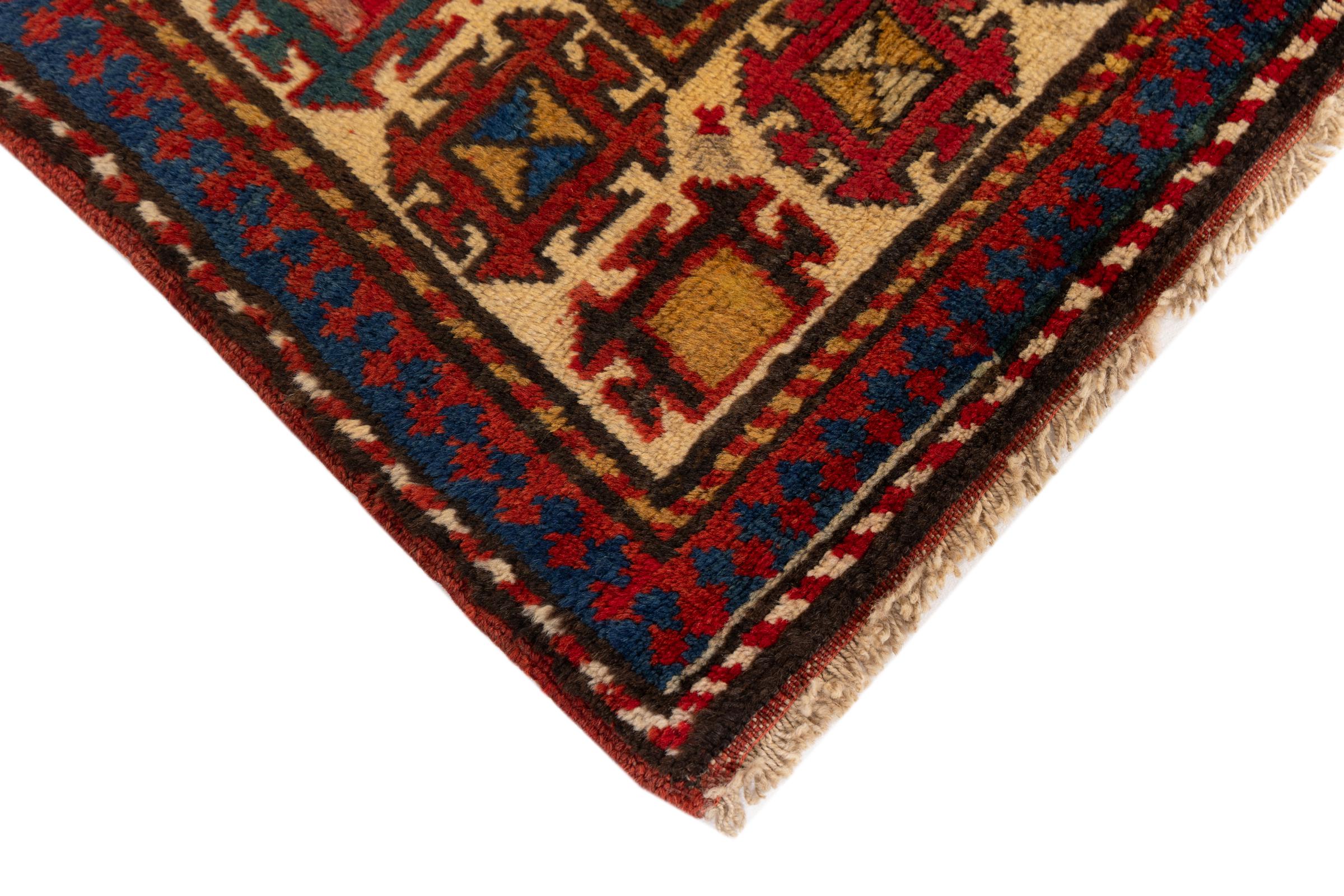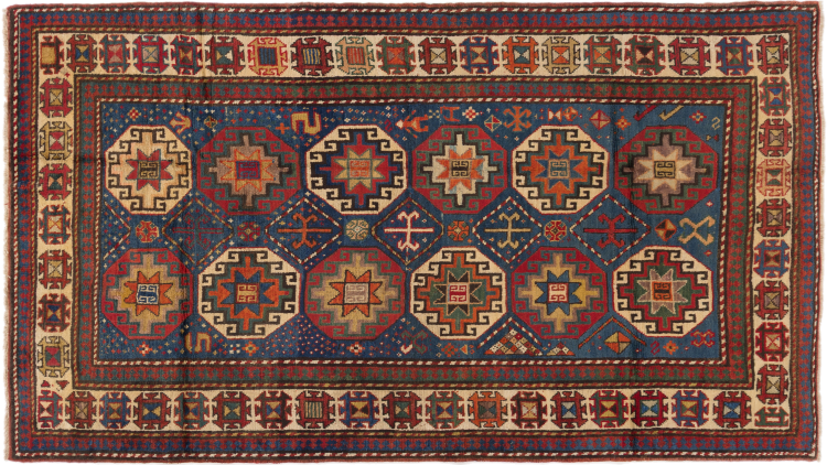 Carpet ID: 299028002506 Size: 224x128 cm Thickness: ap. 5 mm Knot density: 200 000 - 250 000 / m² Manufacturing: Knotted by hand Pile: Handspun wool Warp: Cotton Origin: Azerbaijan / Russia Age: Old/Semi antique, over 50 years Weight: ap. 7 kg In stock: Unique - Only 1 in stock