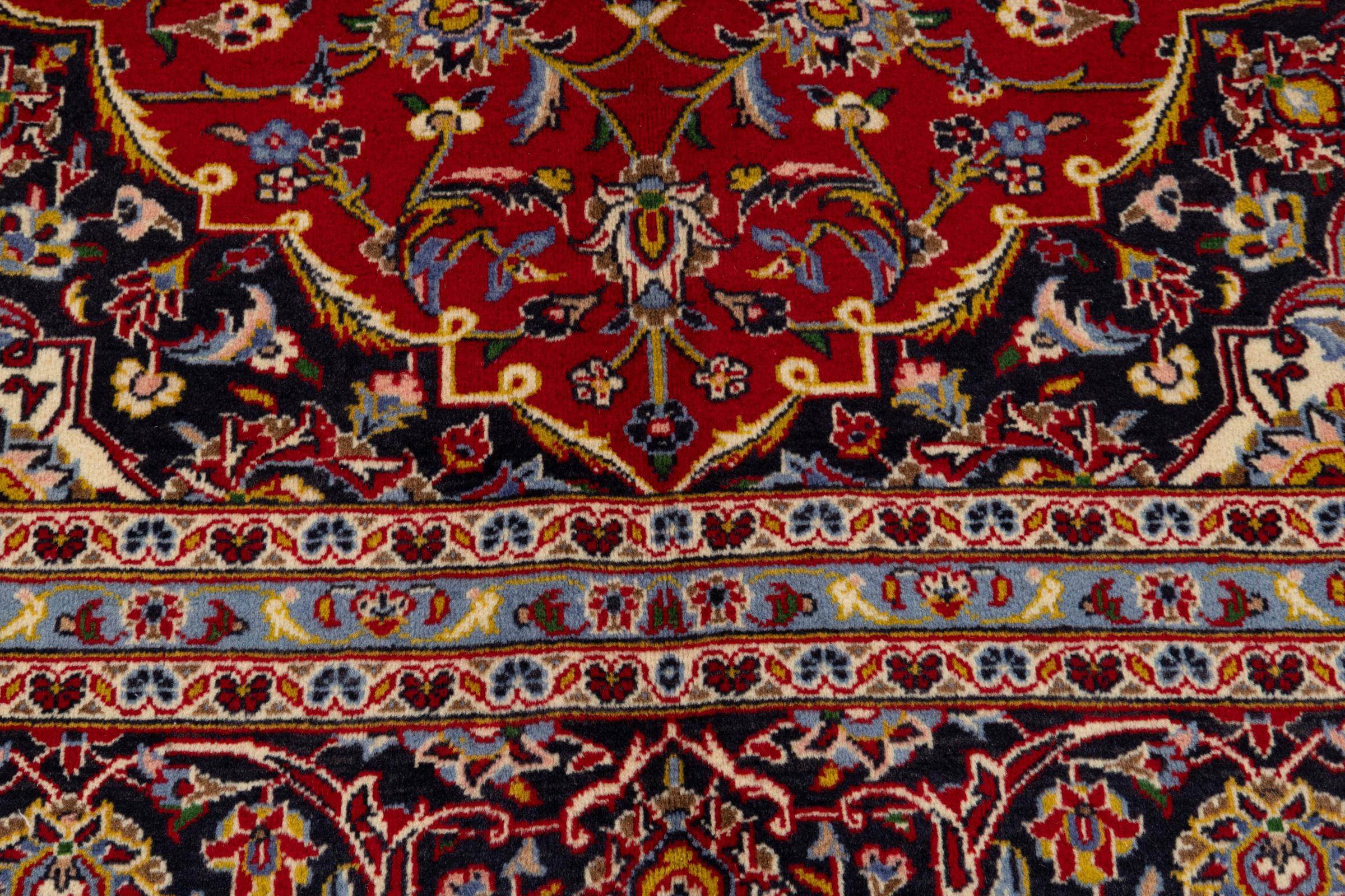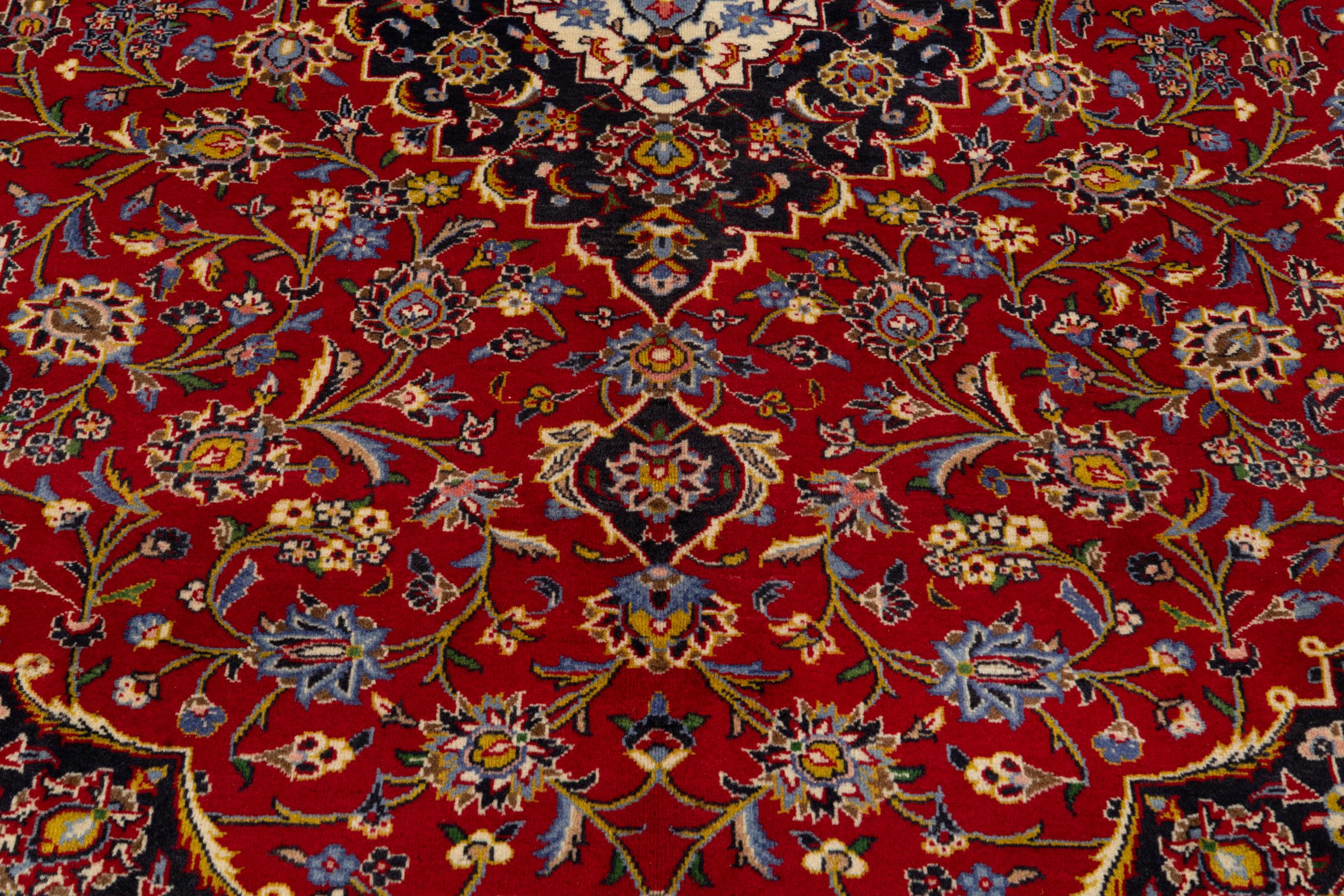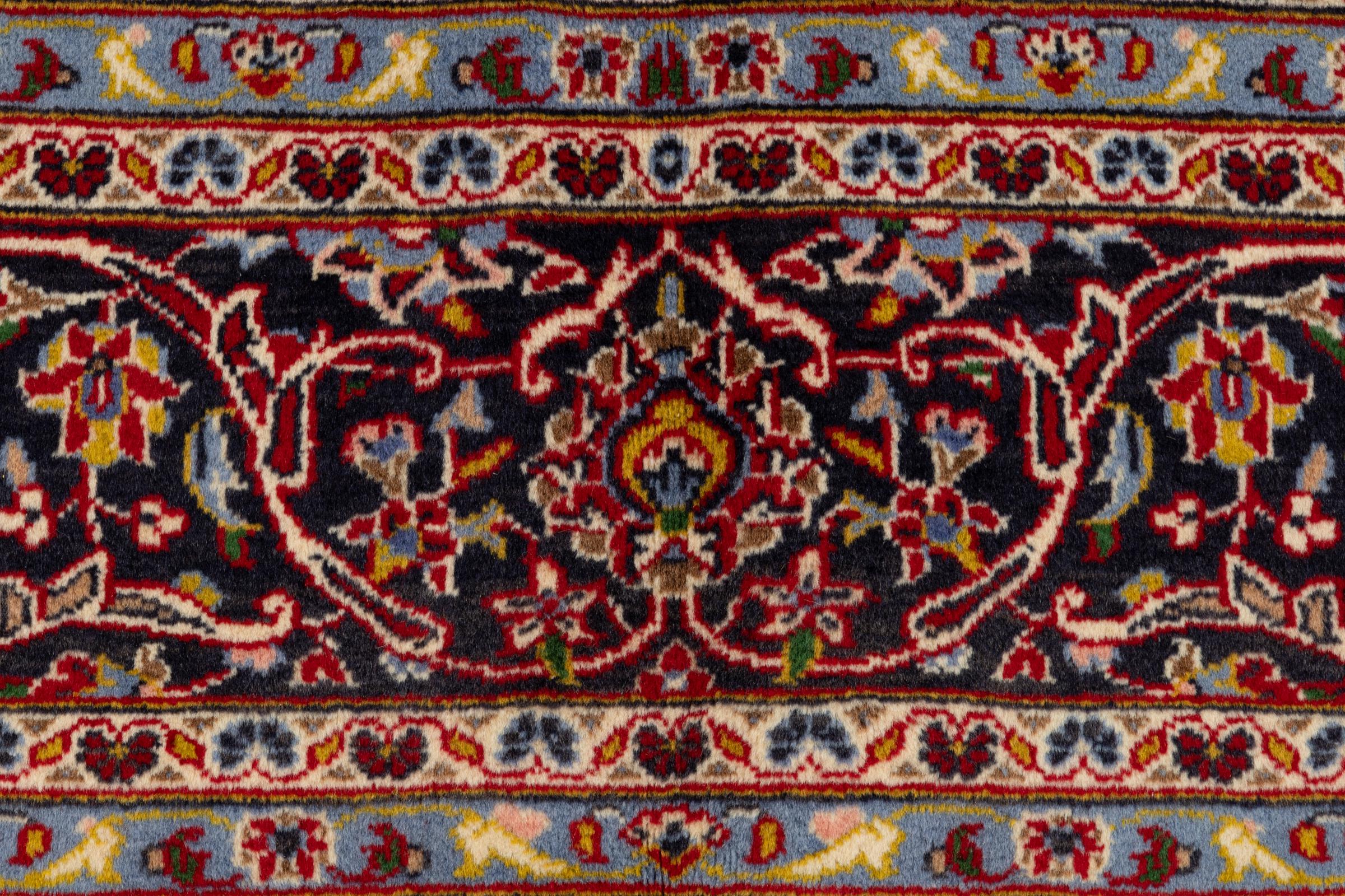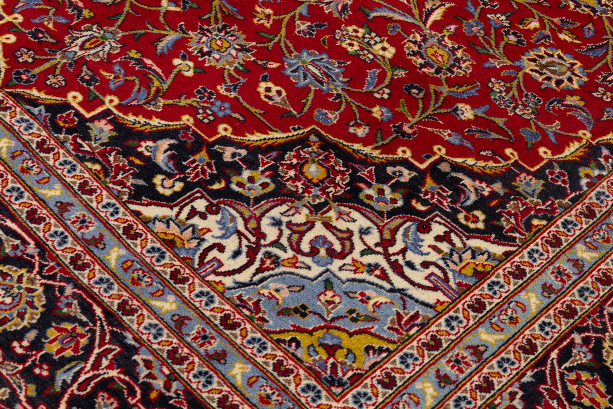This carpet from Kashan (Keshan) is held in its very traditional and typical Persian design with beautiful ornaments. Kashan rugs are highly popular due to their exceptionally elegant design. These carpets originate from Kashan, a city on the ancient Silk Road. This carpet has been knotted by hand from high grade sheep wool and is going to be an one-of-a-kind highlight in your home.