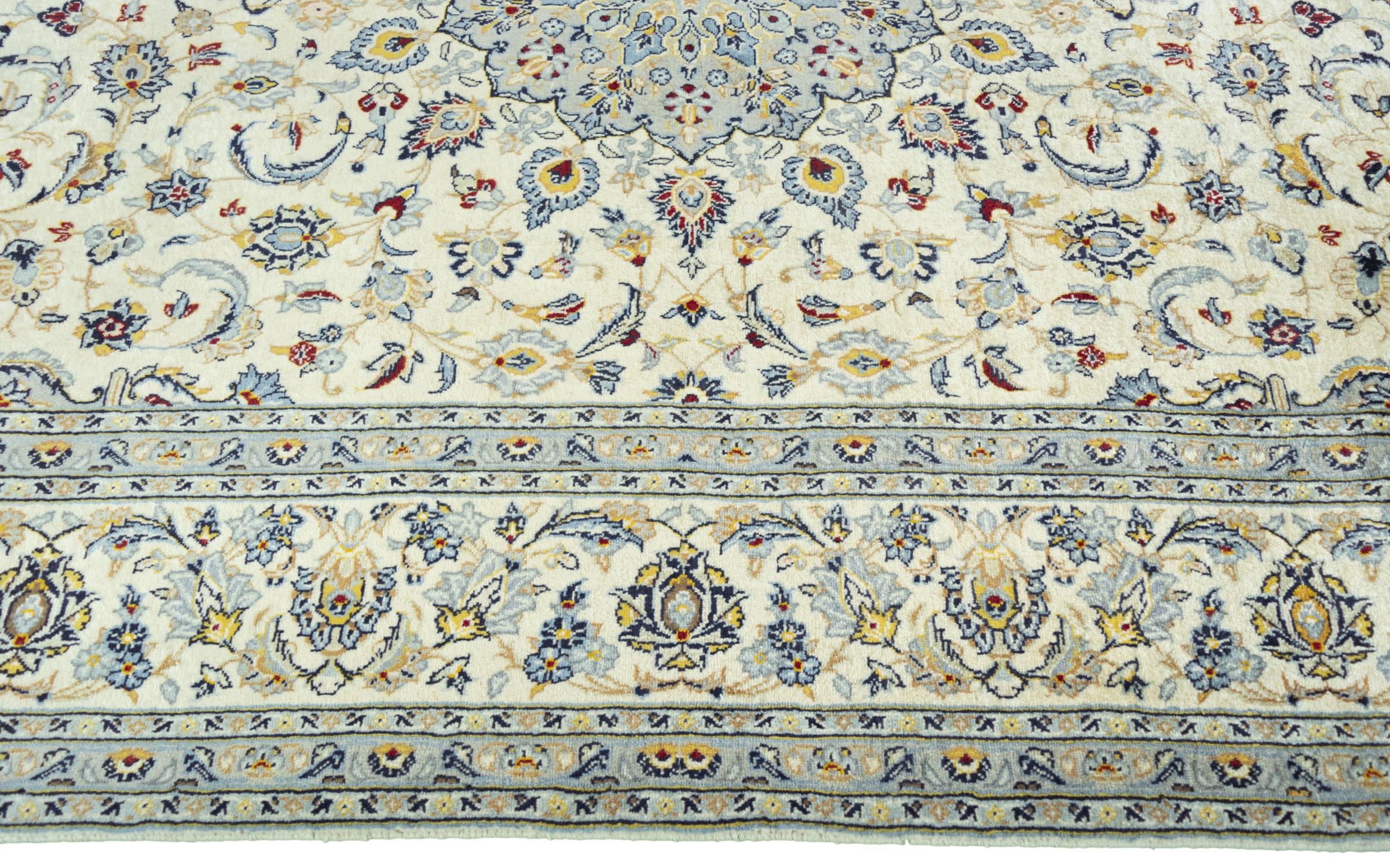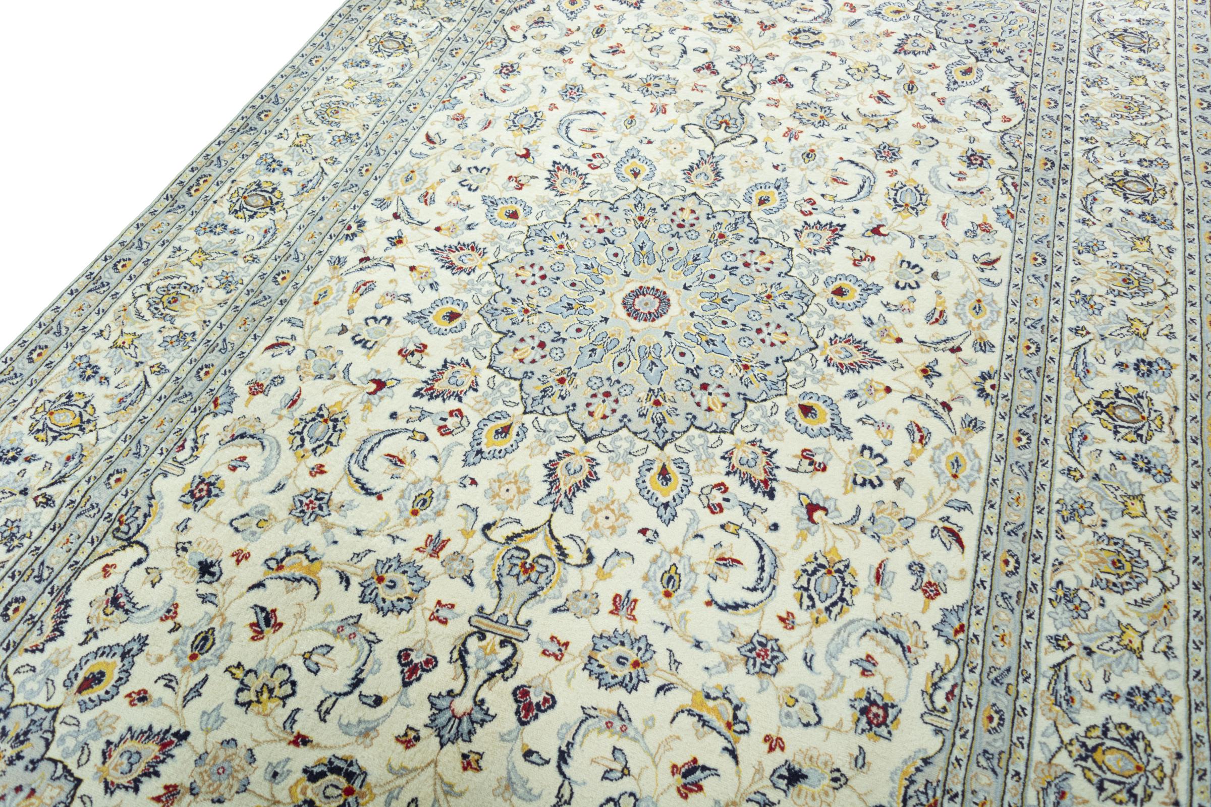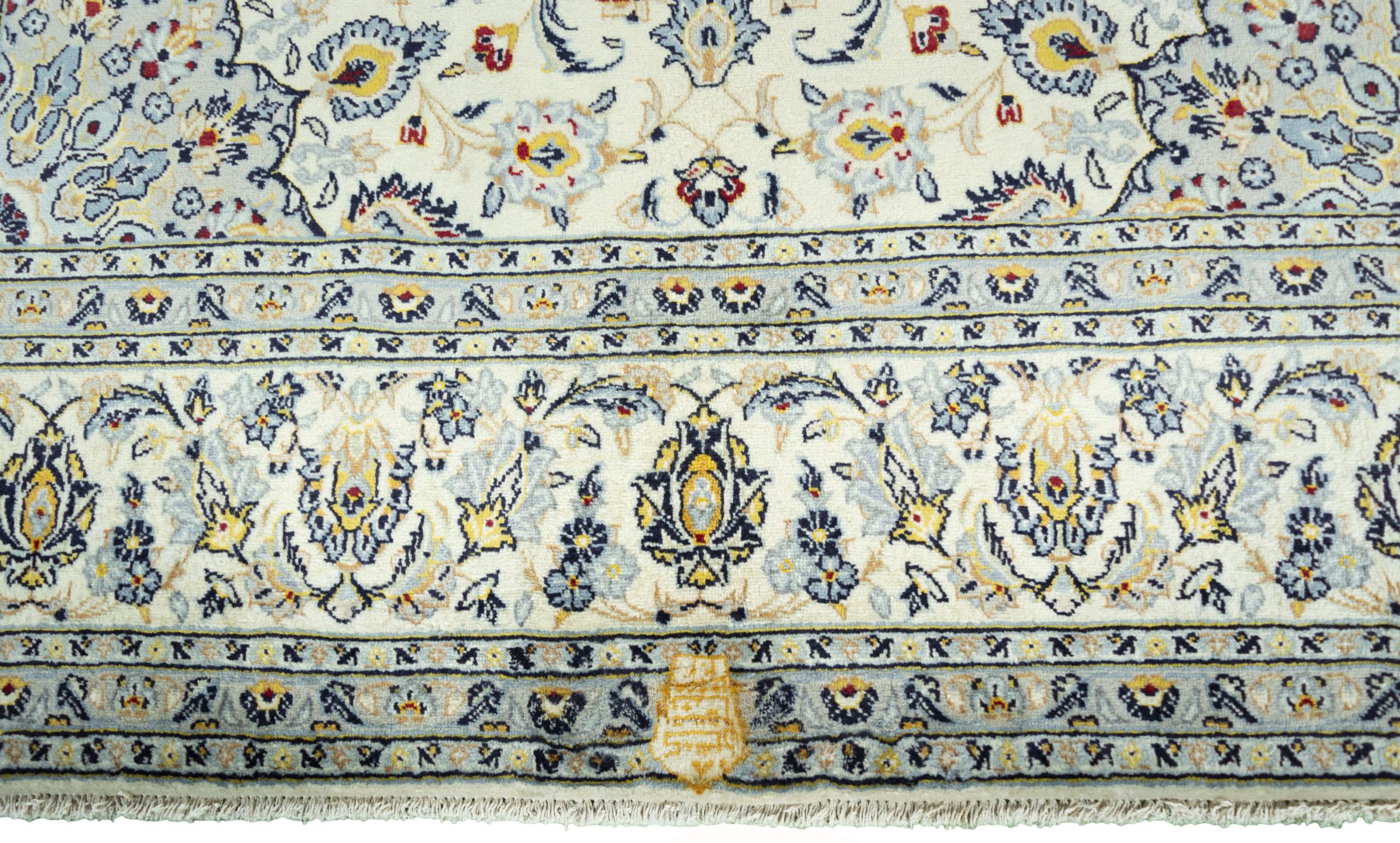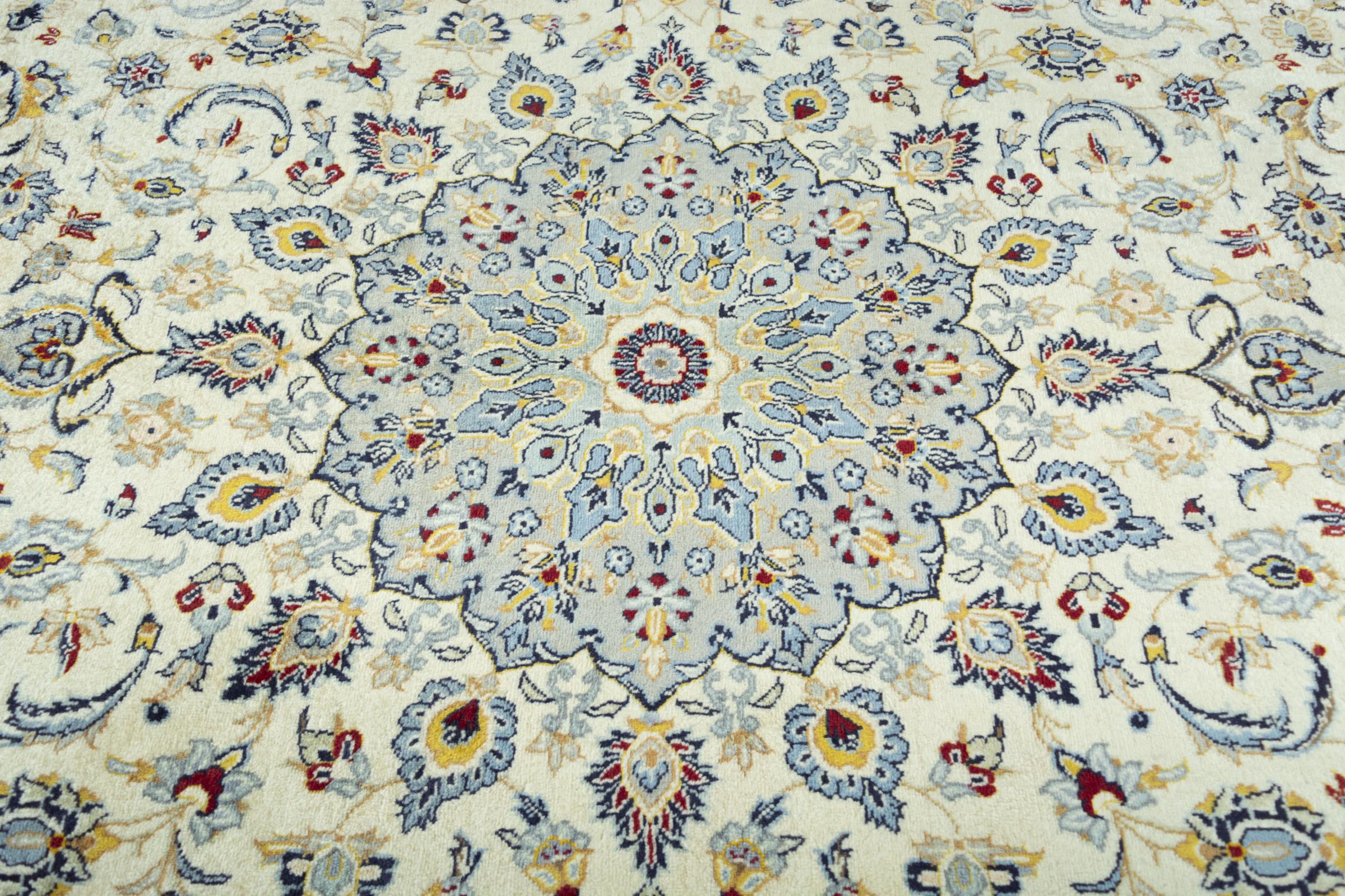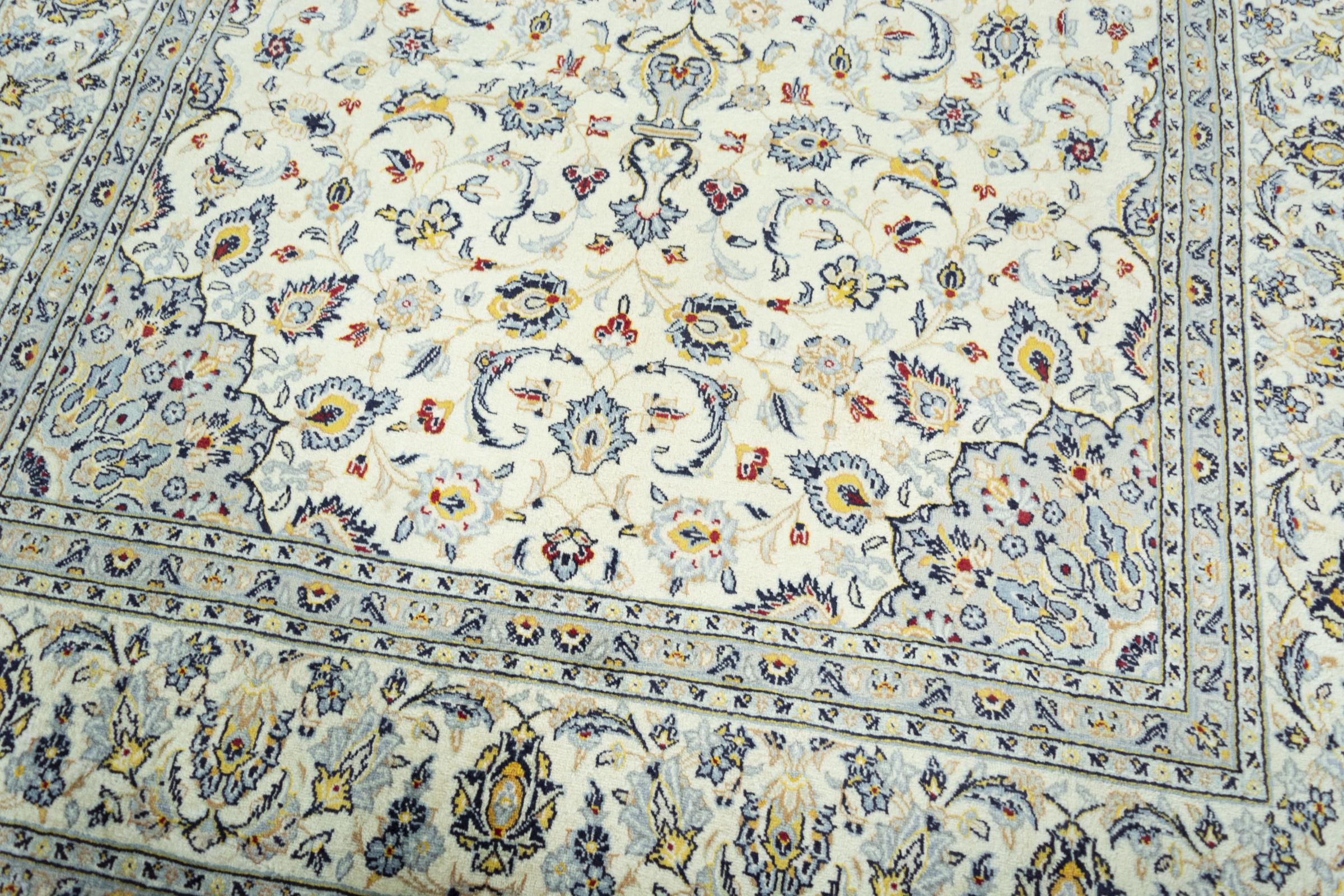 This carpet from Kashan (Keshan) is held in its very traditional and typical Persian design with beautiful ornaments. Kashan rugs are highly popular due to their exceptionally elegant design. These carpets originate from Kashan, a city on the ancient Silk Road. This carpet has been knotted by hand from high grade sheep wool and is going to be an one-of-a-kind highlight in your home.