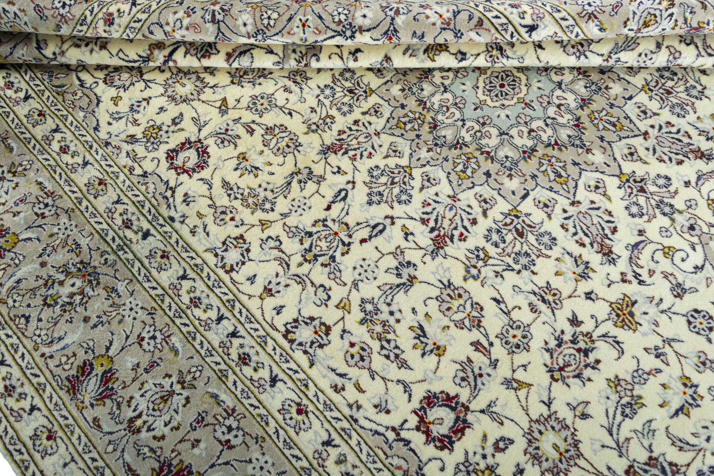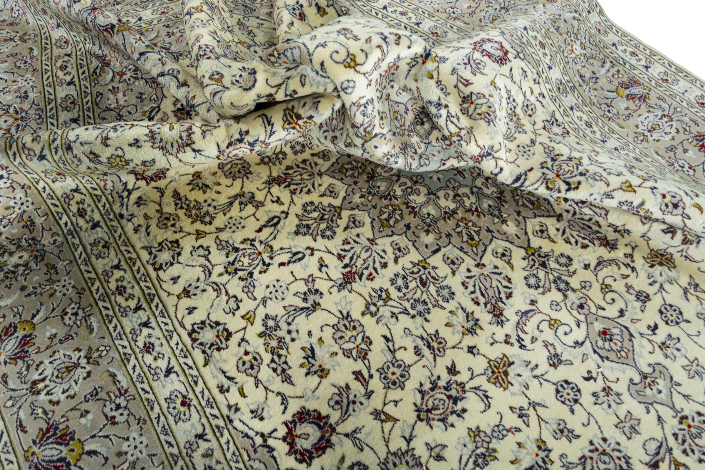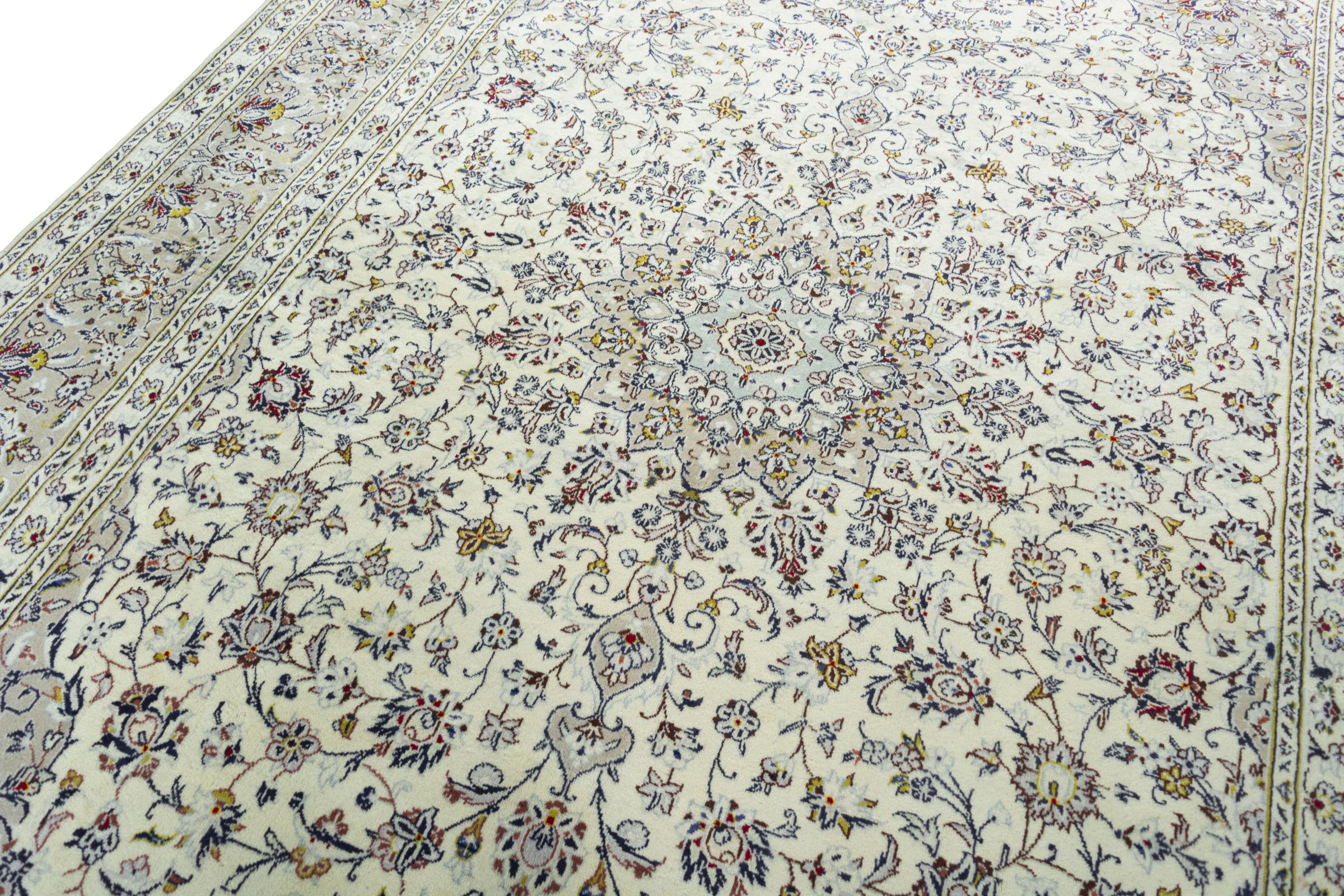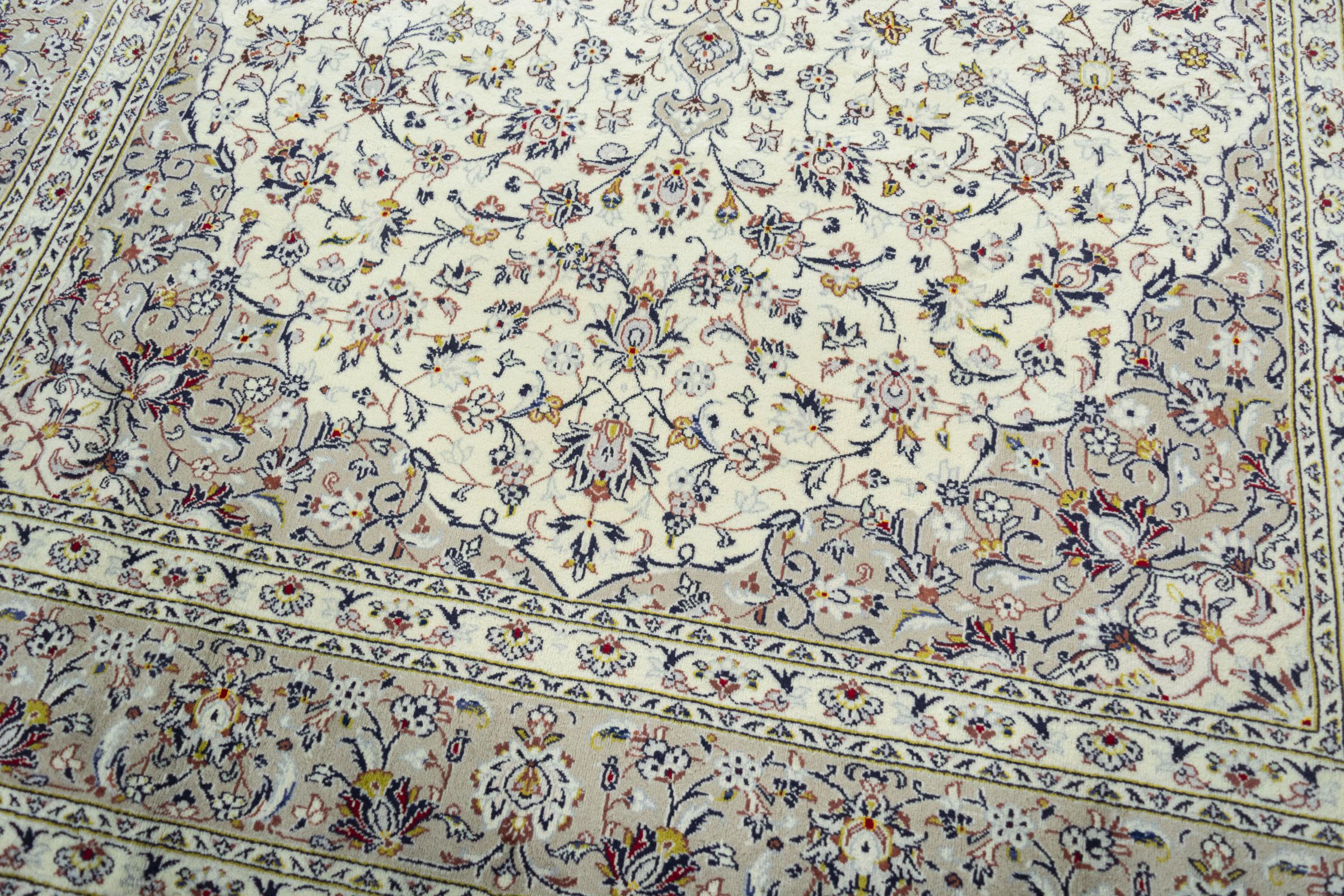 This carpet from Kashan (Keshan) is held in its very traditional and typical Persian design with beautiful ornaments. Kashan rugs are highly popular due to their exceptionally elegant design. These carpets originate from Kashan, a city on the ancient Silk Road. This carpet has been knotted by hand from high grade sheep wool and is going to be an one-of-a-kind highlight in your home.