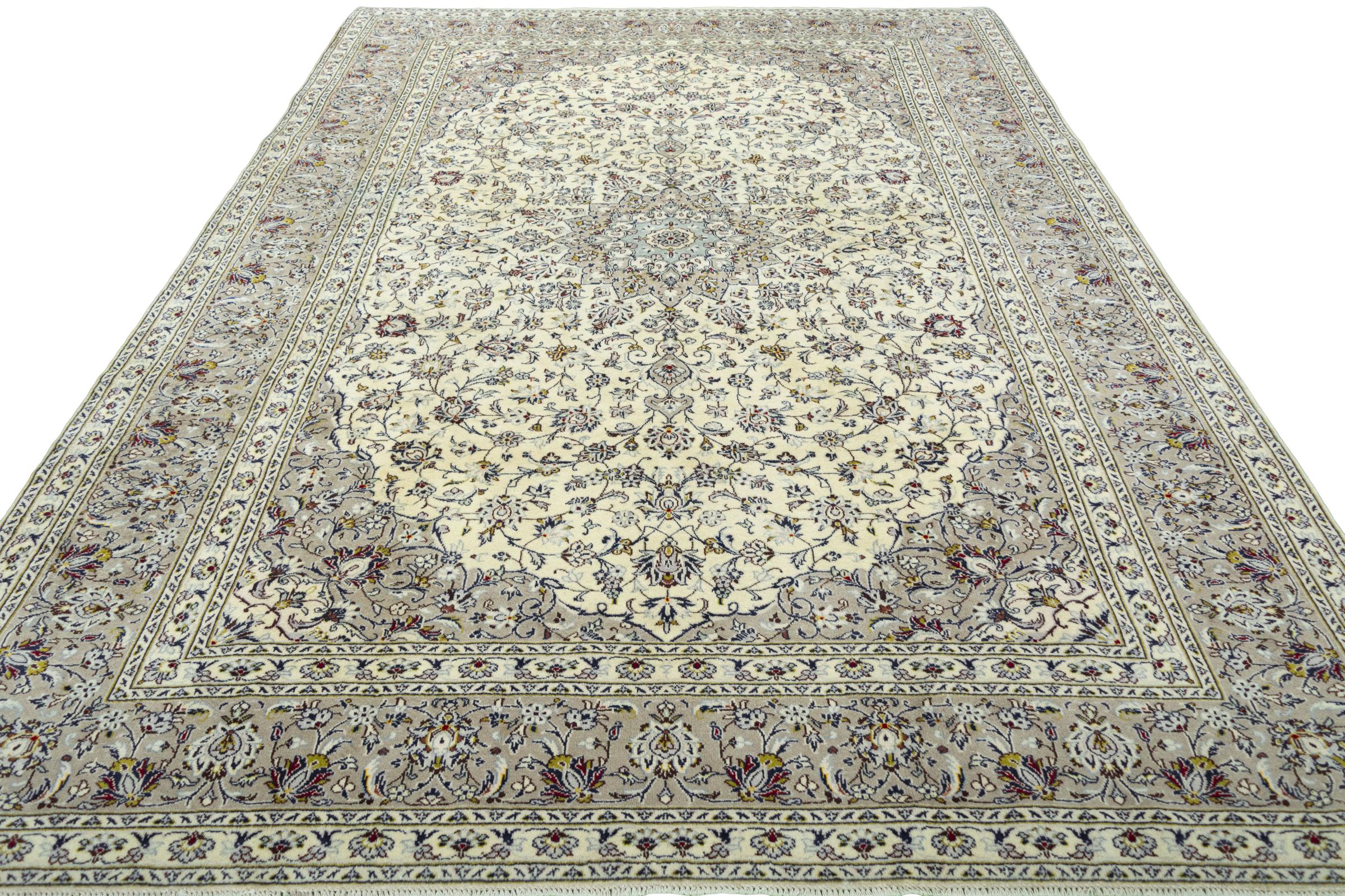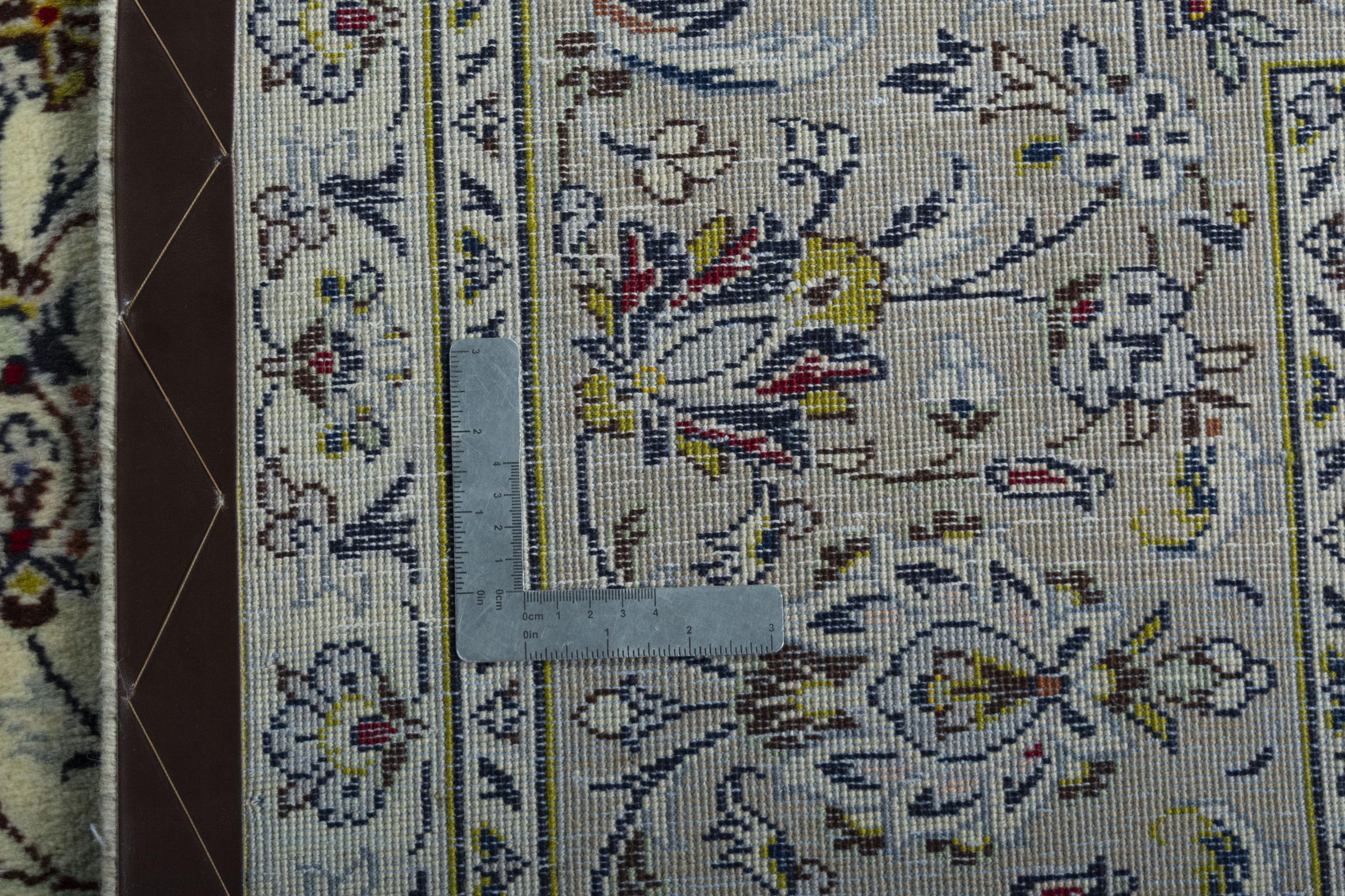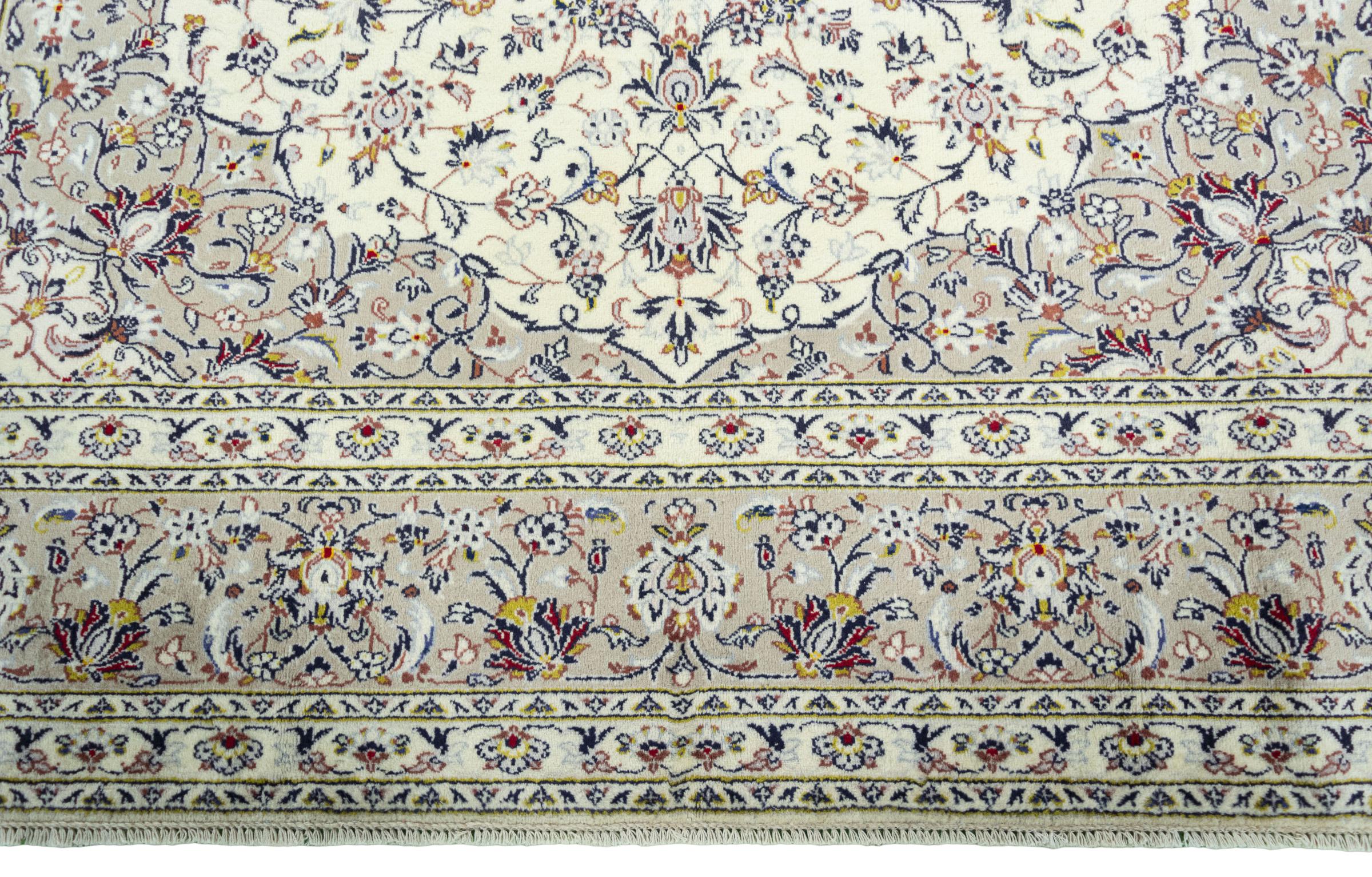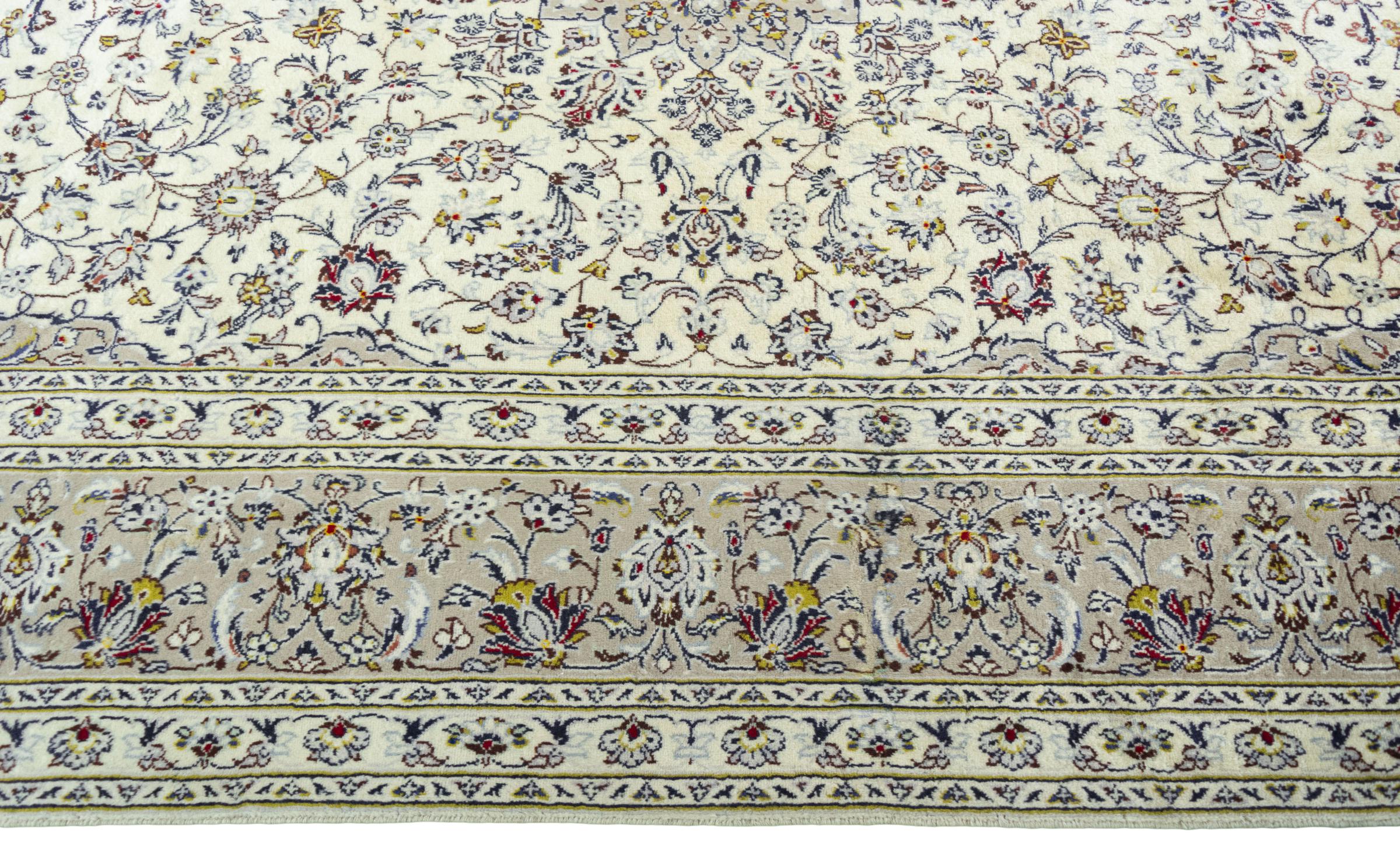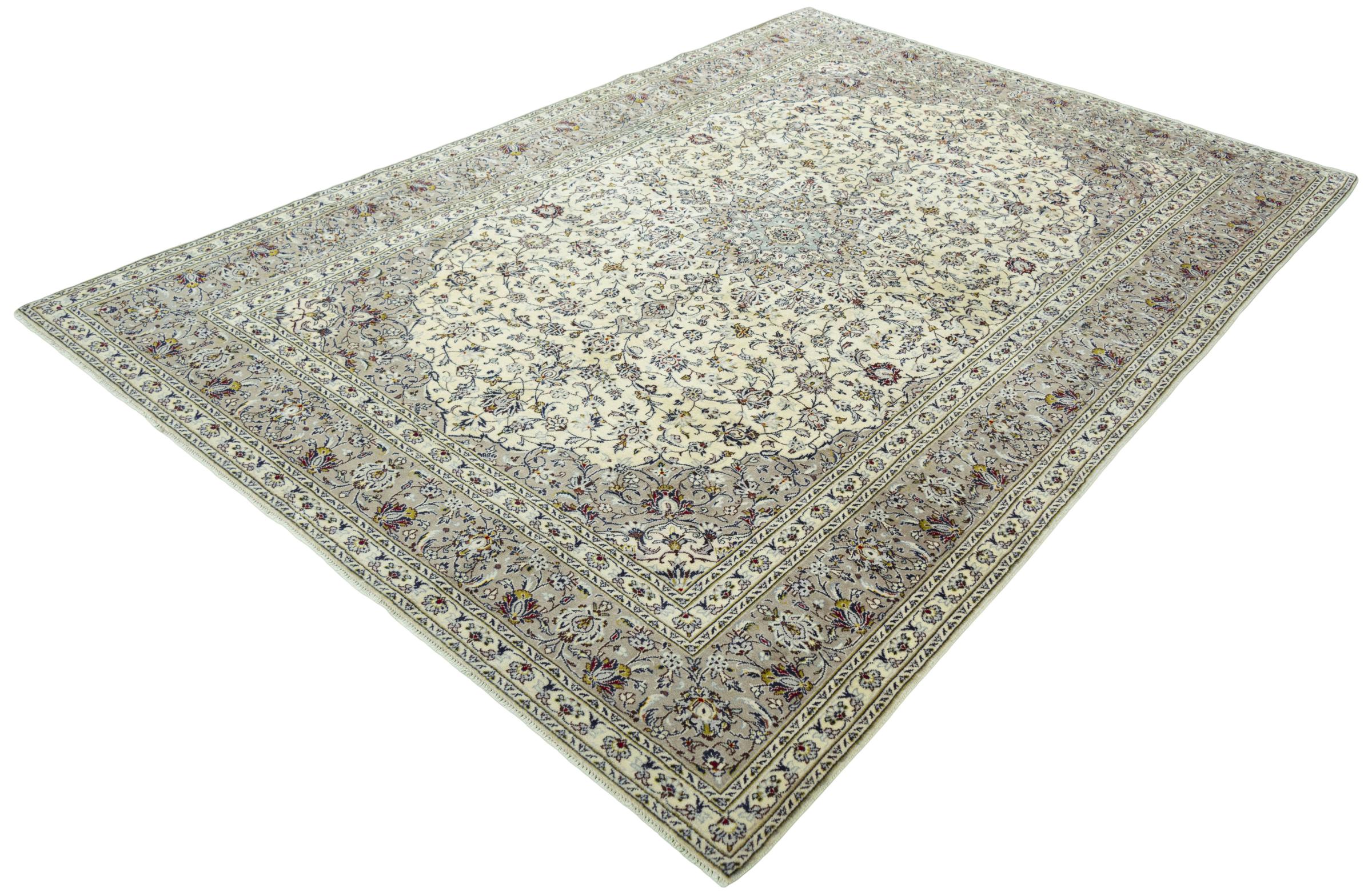 This carpet from Kashan (Keshan) is held in its very traditional and typical Persian design with beautiful ornaments. Kashan rugs are highly popular due to their exceptionally elegant design. These carpets originate from Kashan, a city on the ancient Silk Road. This carpet has been knotted by hand from high grade sheep wool and is going to be an one-of-a-kind highlight in your home.