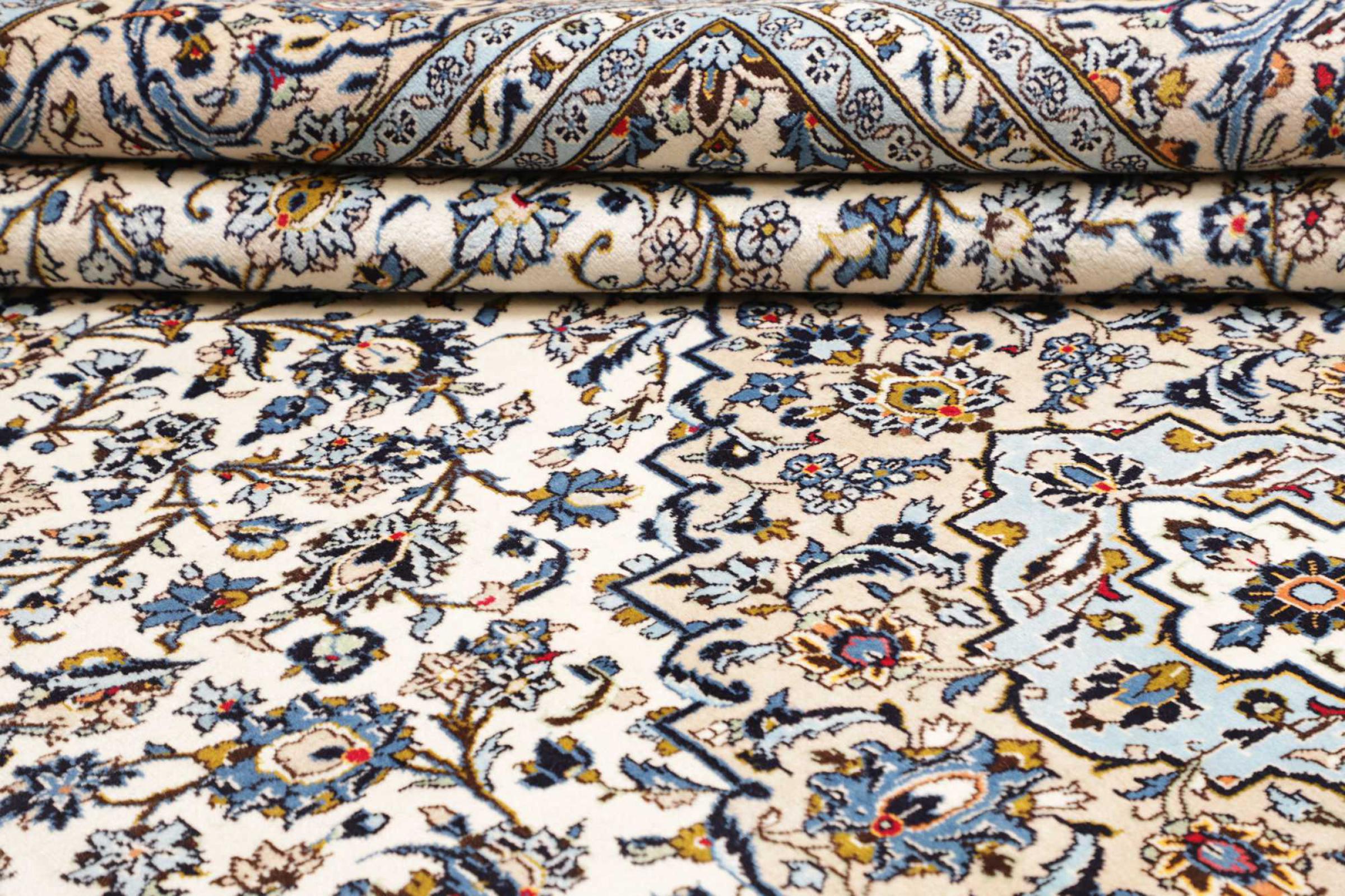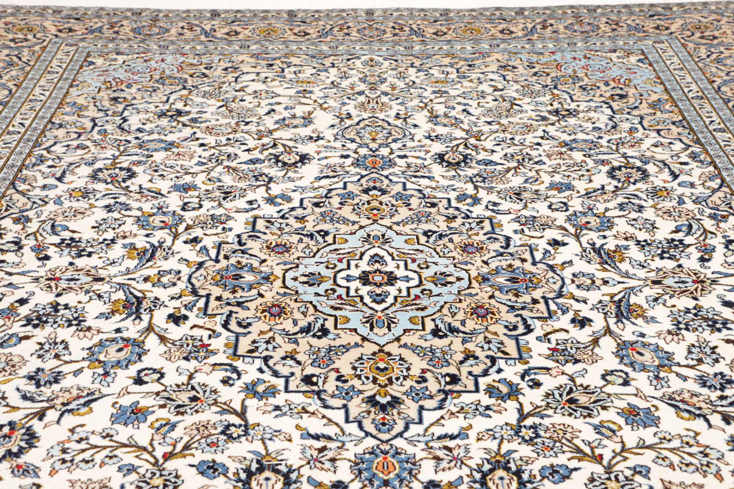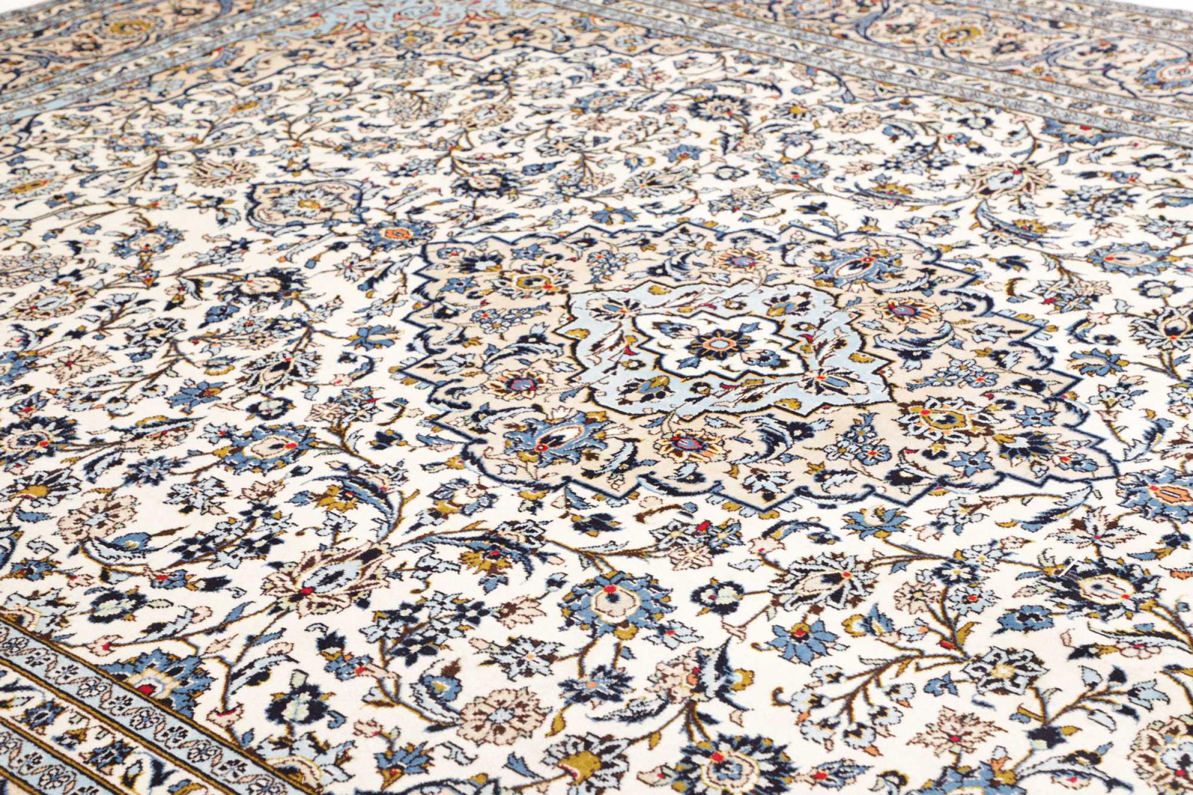 Hand knotted rugs from the city of Kashan (Keshan) are known worldwide. Not only do these Persian rugs have a very popular design, but their quality is undisputedly one of the best. In the Persian Empire the city was considered one of the most important trading places along the famous Silk Road. Kashan rugs usually have a central medallion, floral ornaments and a red background. They are made of high-quality sheep's wool and vegetable dyes.