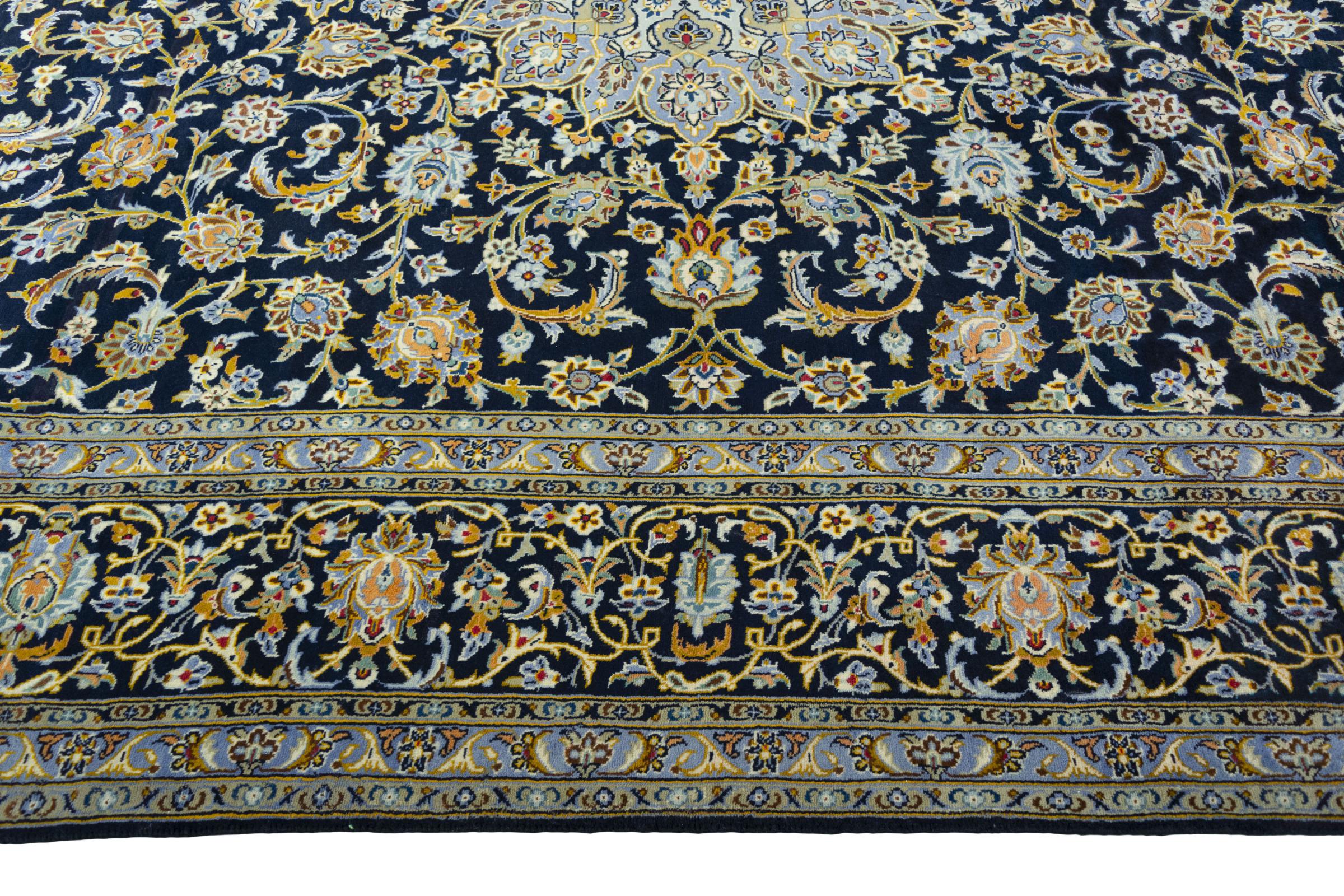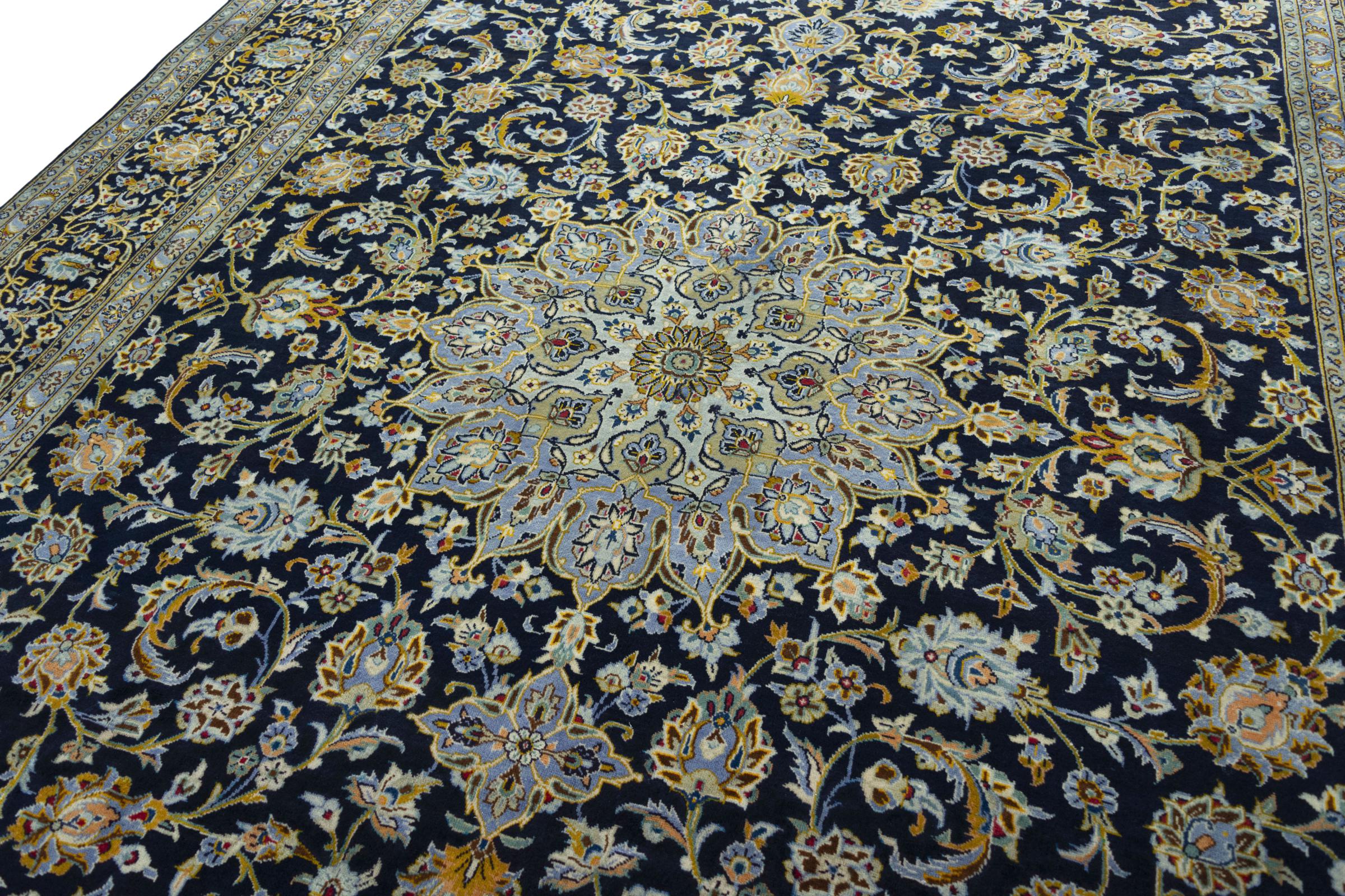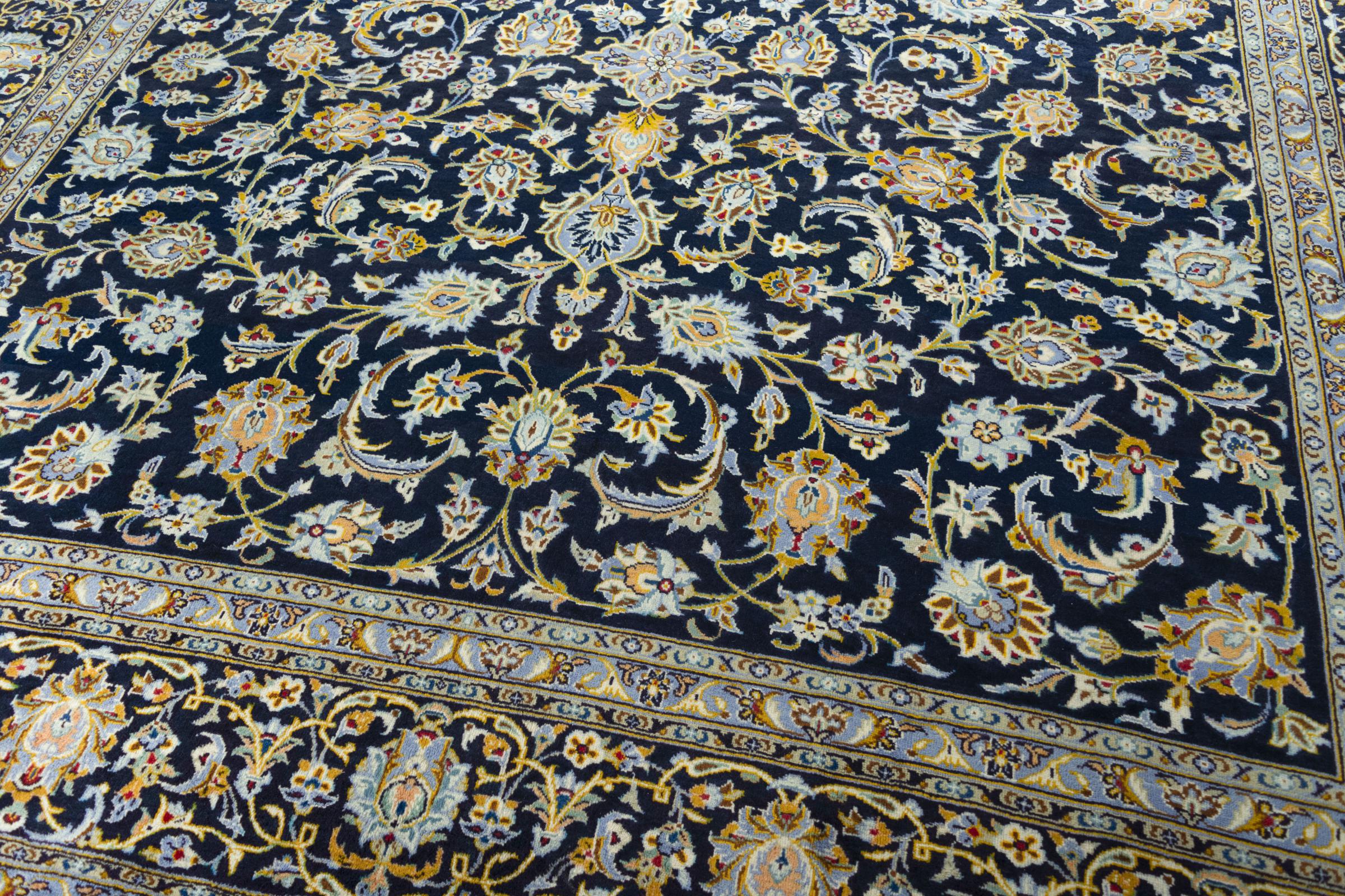 This carpet from Kashan (Keshan) is held in its very traditional and typical Persian design with beautiful ornaments. Kashan rugs are highly popular due to their exceptionally elegant design. These carpets originate from Kashan, a city on the ancient Silk Road. This carpet has been knotted by hand from high grade sheep wool and is going to be an one-of-a-kind highlight in your home.