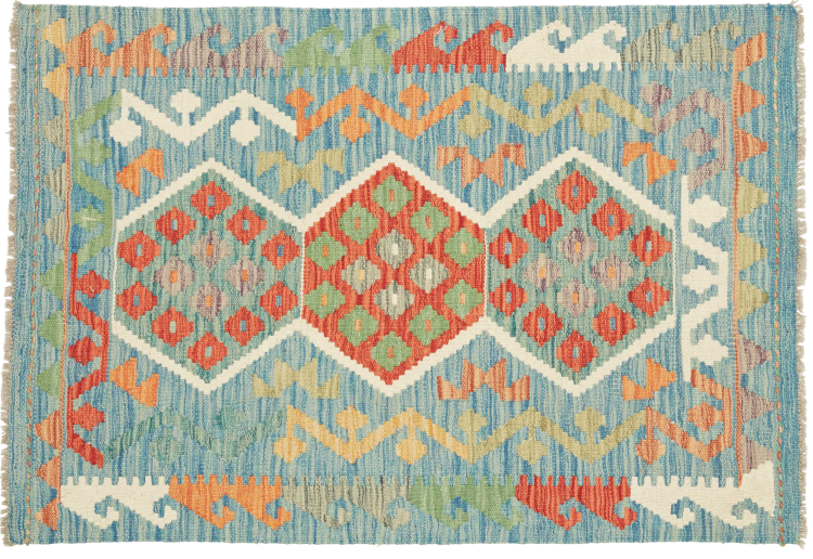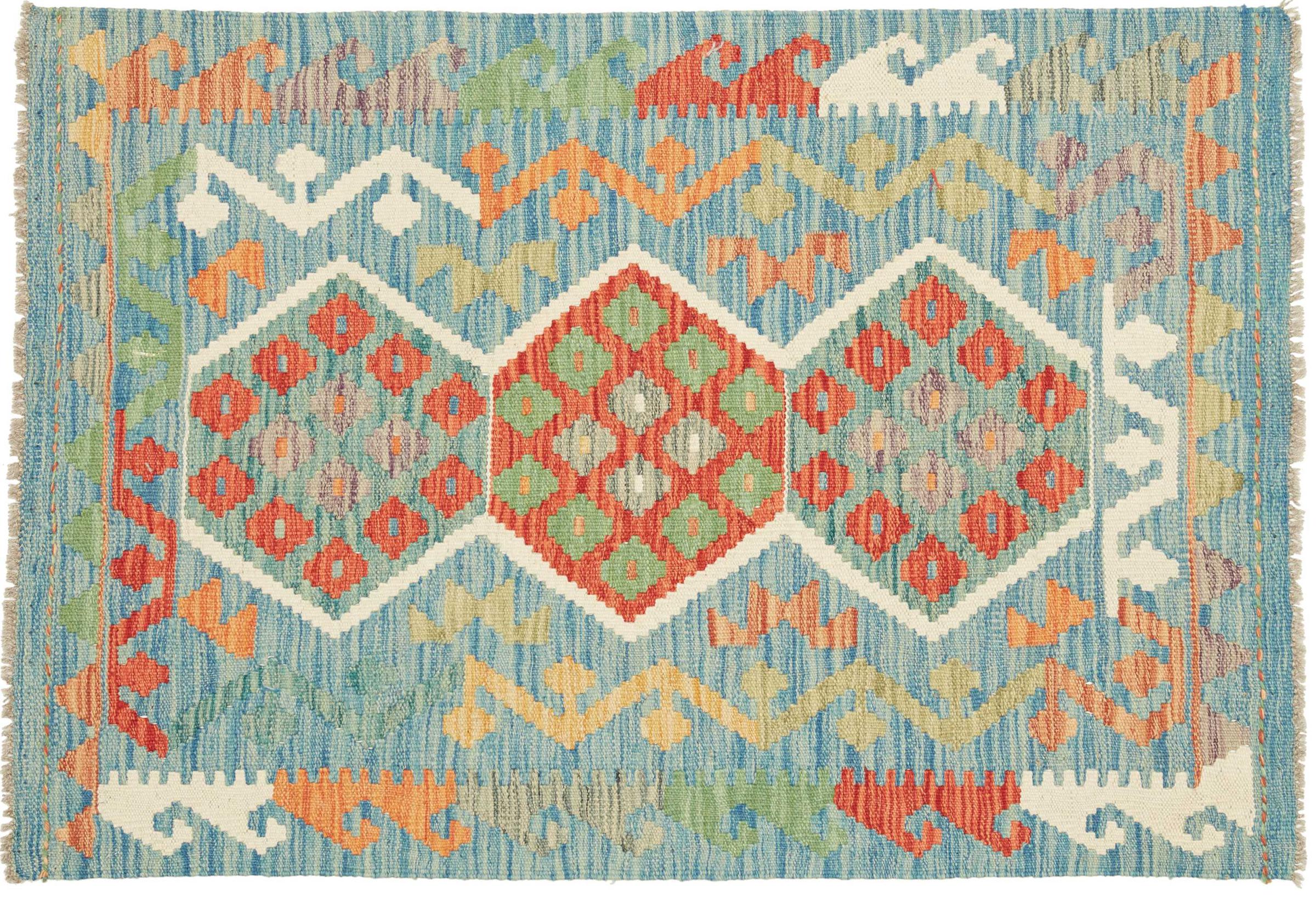 This handwoven Kilim Afghan is a wonderful and unique piece of art. Hard to believe that these modern colours and patterns have already been used centuries ago. This carpet has been woven by hand in old tradition in Afghanistan. It delivers a portion of contemporary history, which you won't find in this specific design a second time. It consists of high-grade natural wool and gives your home a personalised touch.