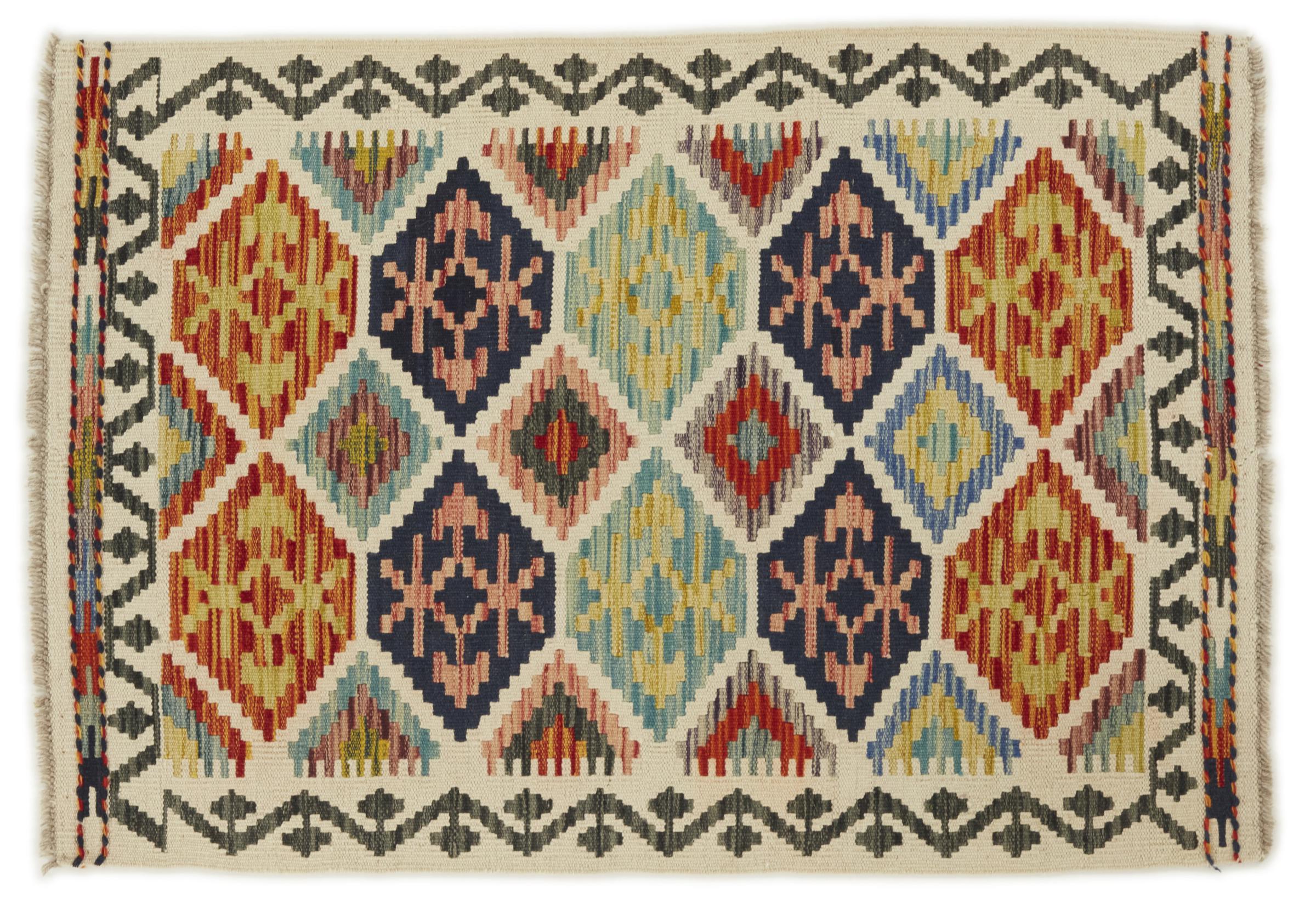 This handwoven Kilim Afghan is a wonderful and unique piece of art. Hard to believe that these modern colours and patterns have already been used centuries ago. This carpet has been woven by hand in old tradition in Afghanistan. It delivers a portion of contemporary history, which you won't find in this specific design a second time. It consists of high-grade natural wool and gives your home a personalised touch.