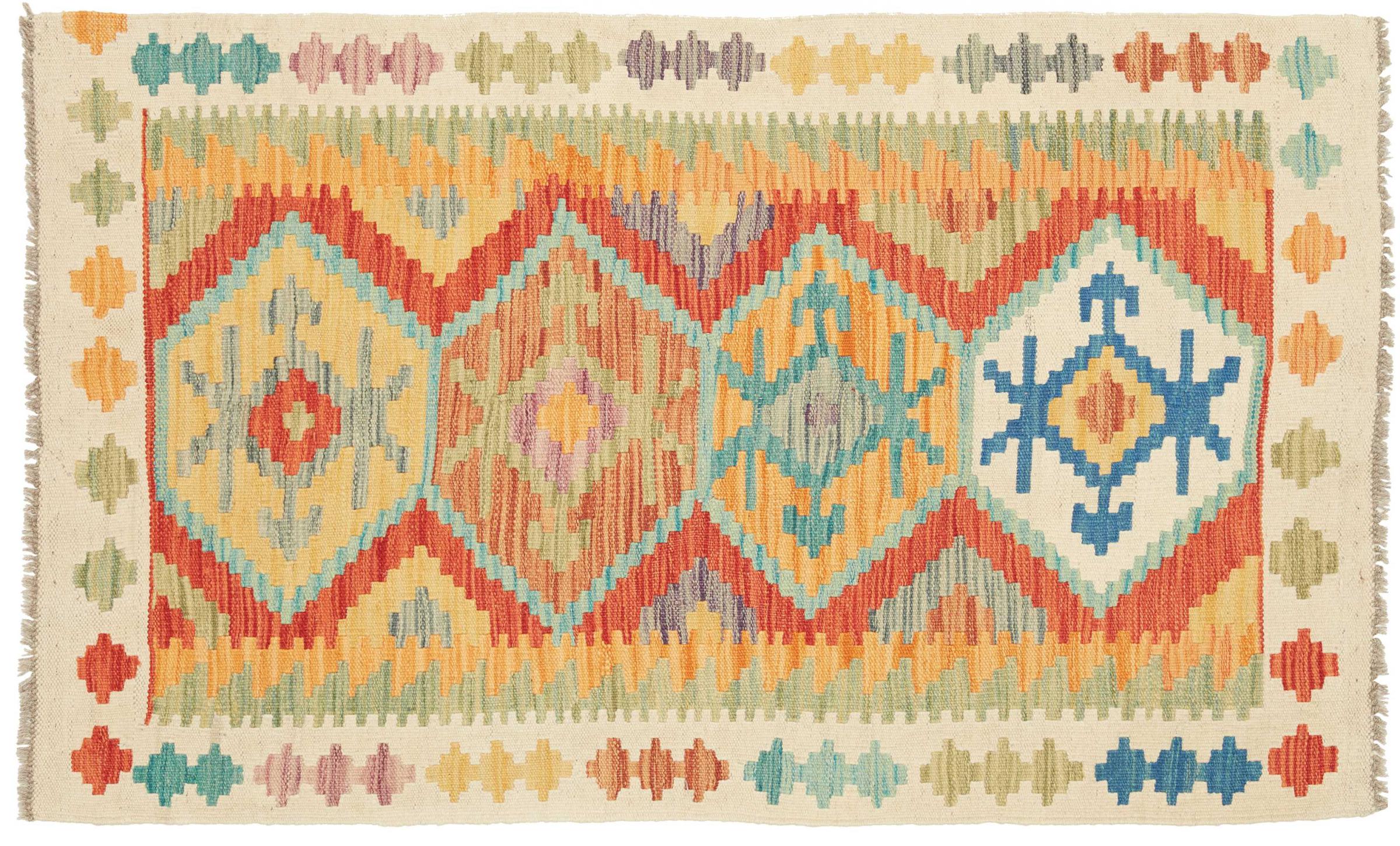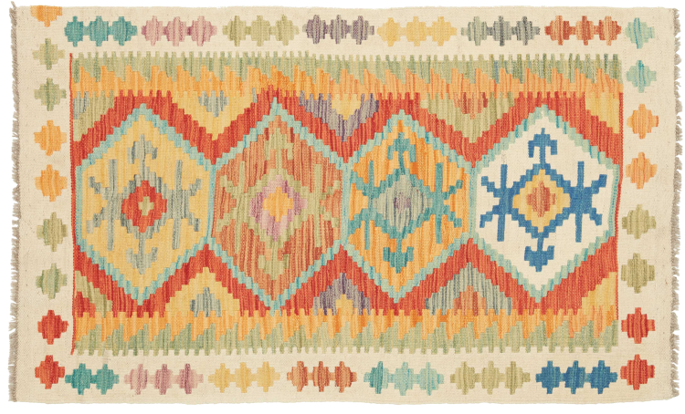 This handwoven Kilim Afghan is a wonderful and unique piece of art. Hard to believe that these modern colours and patterns have already been used centuries ago. This carpet has been woven by hand in old tradition in Afghanistan. It delivers a portion of contemporary history, which you won't find in this specific design a second time. It consists of high-grade natural wool and gives your home a personalised touch.