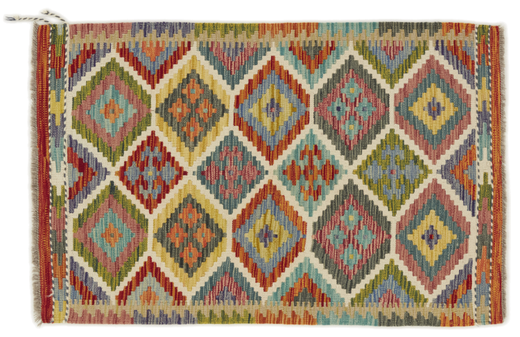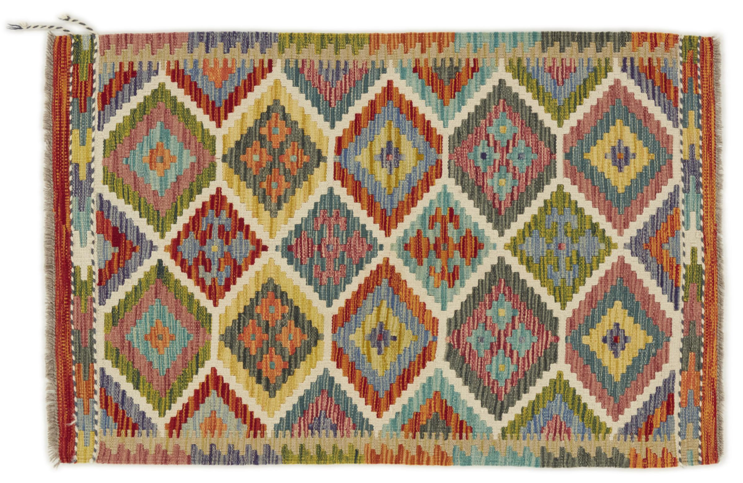 This handwoven Kilim Afghan is a wonderful and unique piece of art. Hard to believe that these modern colours and patterns have already been used centuries ago. This carpet has been woven by hand in old tradition in Afghanistan. It delivers a portion of contemporary history, which you won't find in this specific design a second time. It consists of high-grade natural wool and gives your home a personalised touch.
