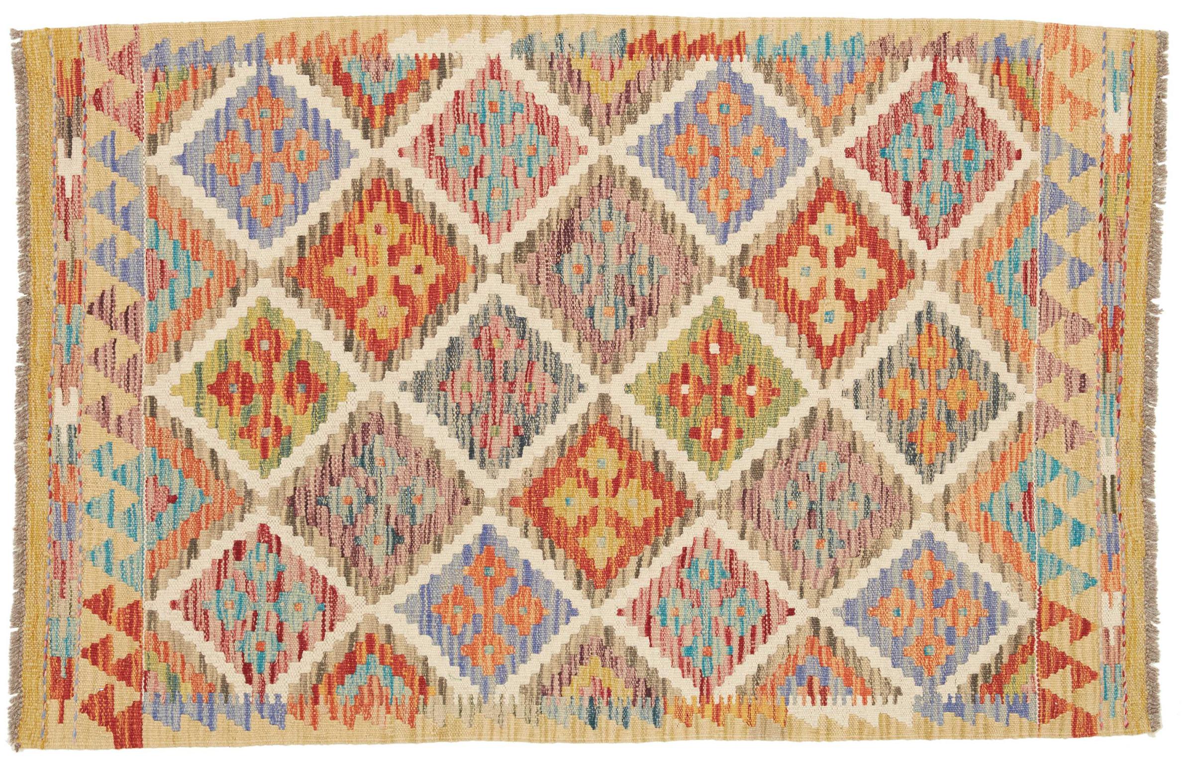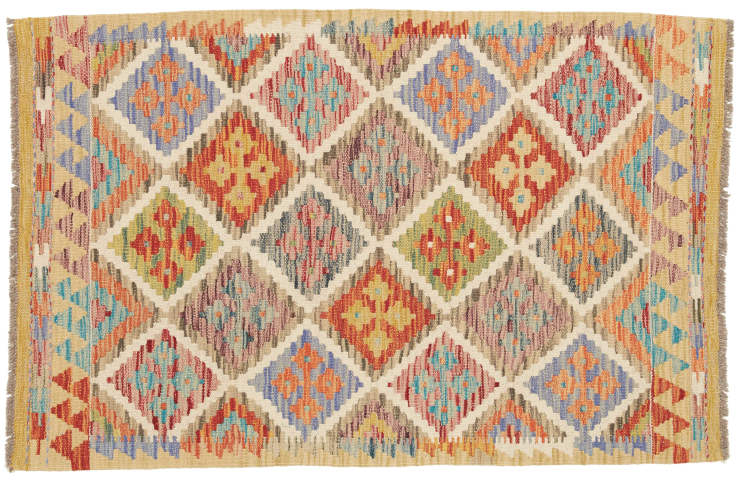 This handwoven Kilim Afghan is a wonderful and unique piece of art. Hard to believe that these modern colours and patterns have already been used centuries ago. This carpet has been woven by hand in old tradition in Afghanistan. It delivers a portion of contemporary history, which you won't find in this specific design a second time. It consists of high-grade natural wool and gives your home a personalised touch.