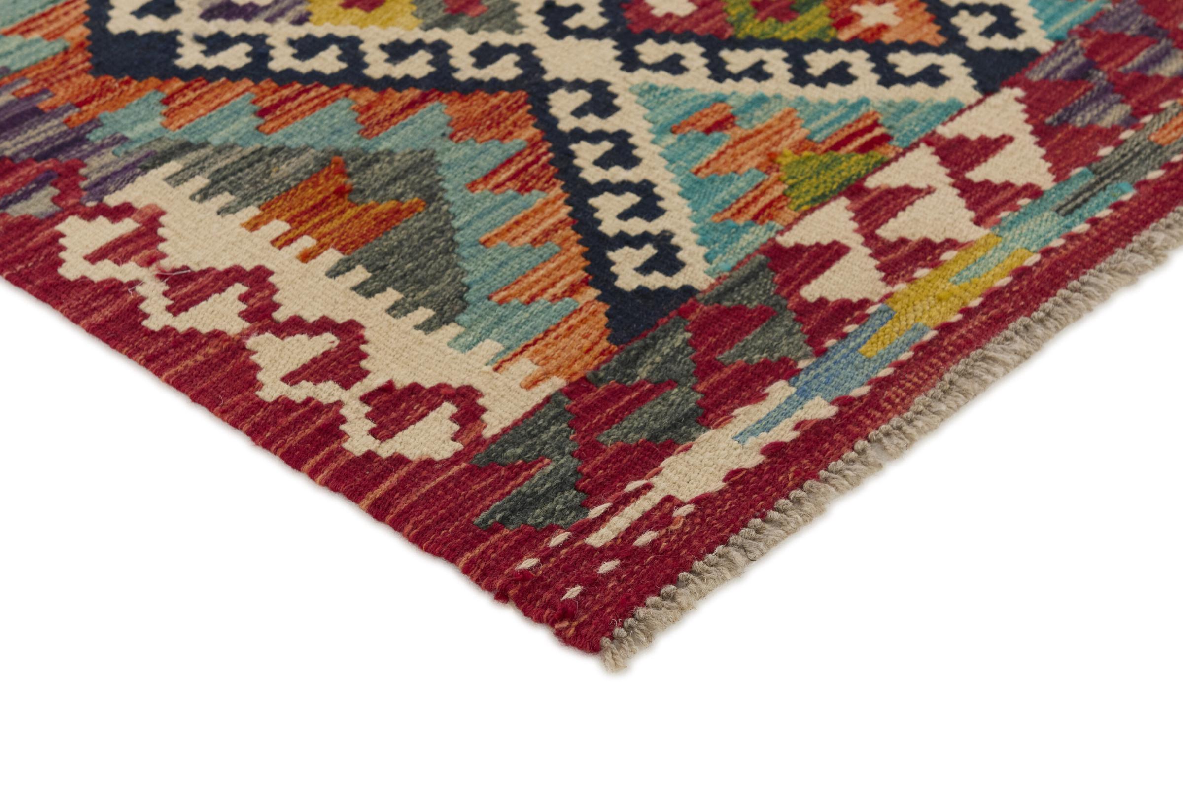 This handwoven Kilim Afghan is a wonderful and unique piece of art. Hard to believe that these modern colours and patterns have already been used centuries ago. This carpet has been woven by hand in old tradition in Afghanistan. It delivers a portion of contemporary history, which you won't find in this specific design a second time. It consists of high-grade natural wool and gives your home a personalised touch.