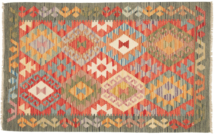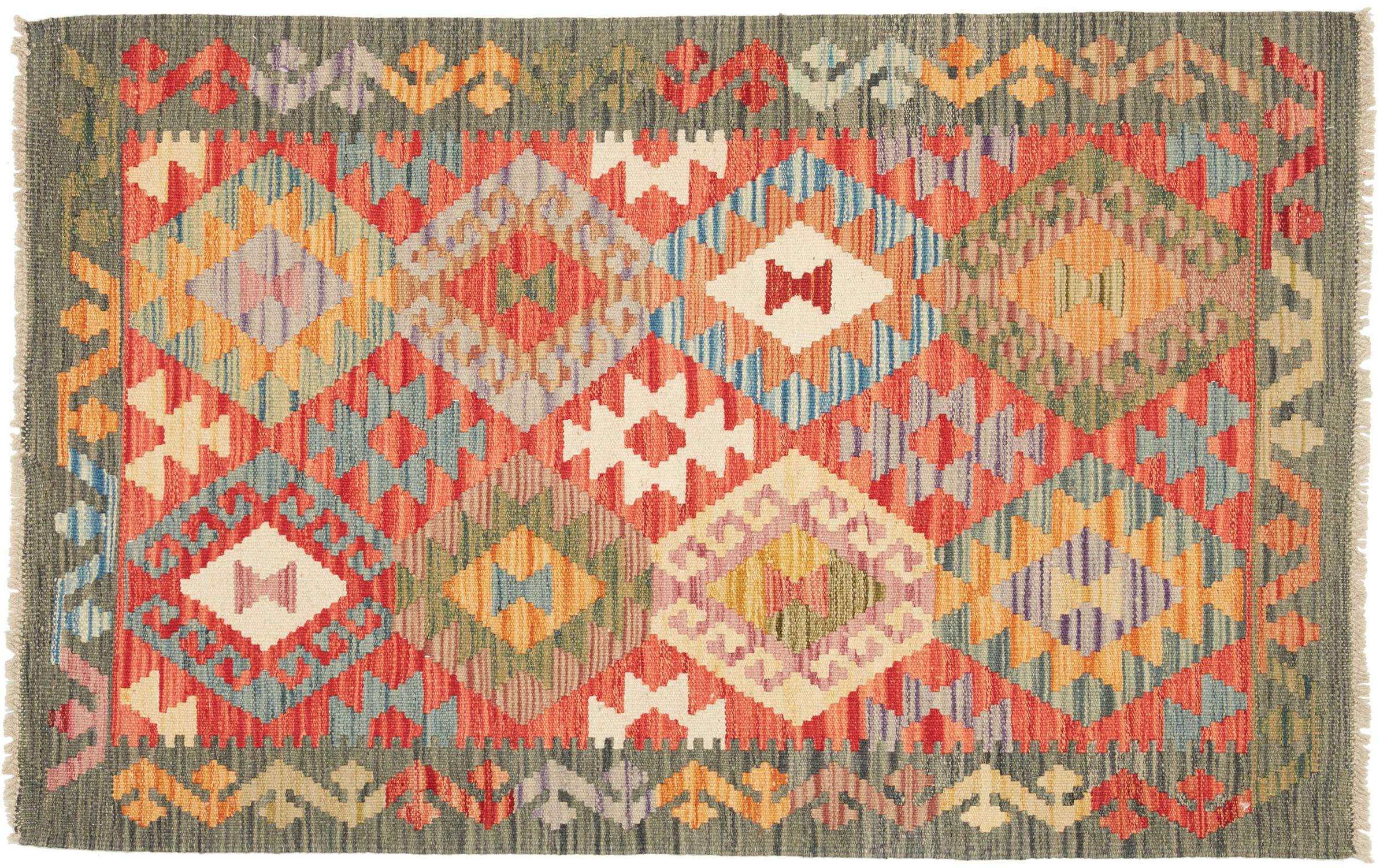 This handwoven Kilim Afghan is a wonderful and unique piece of art. Hard to believe that these modern colours and patterns have already been used centuries ago. This carpet has been woven by hand in old tradition in Afghanistan. It delivers a portion of contemporary history, which you won't find in this specific design a second time. It consists of high-grade natural wool and gives your home a personalised touch.