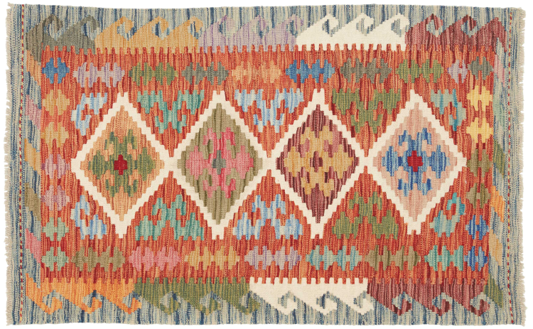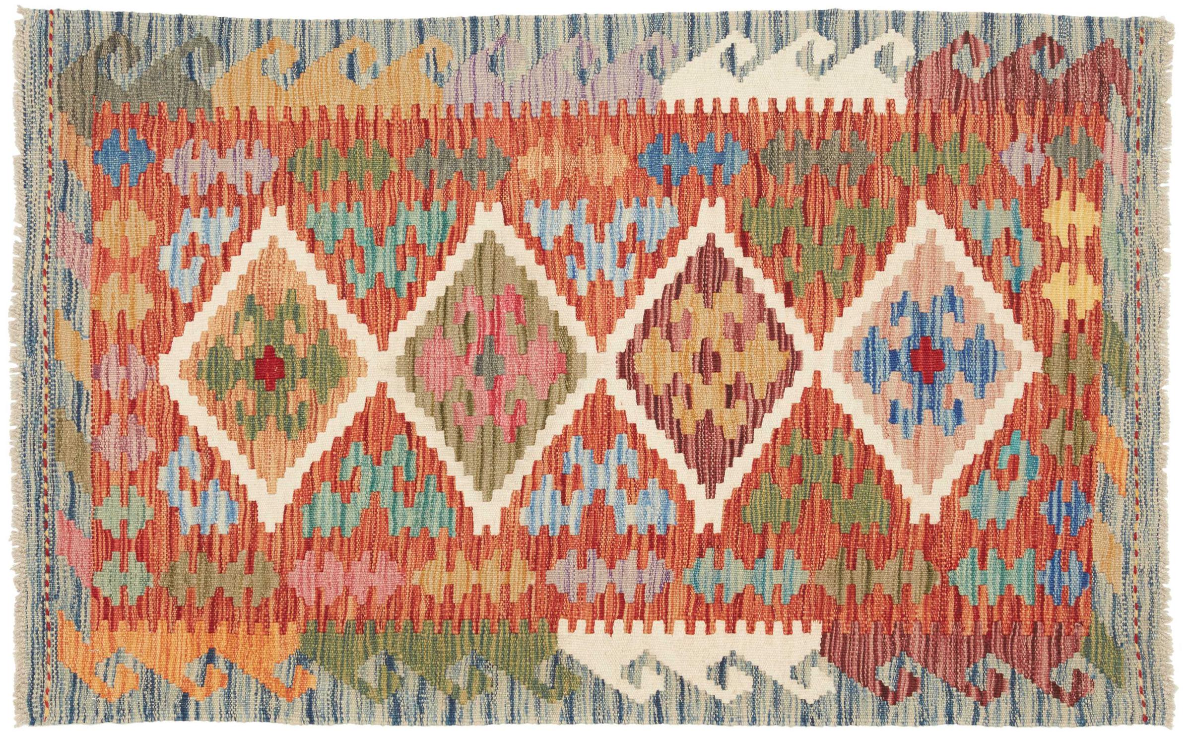 This handwoven Kilim Afghan is a wonderful and unique piece of art. Hard to believe that these modern colours and patterns have already been used centuries ago. This carpet has been woven by hand in old tradition in Afghanistan. It delivers a portion of contemporary history, which you won't find in this specific design a second time. It consists of high-grade natural wool and gives your home a personalised touch.