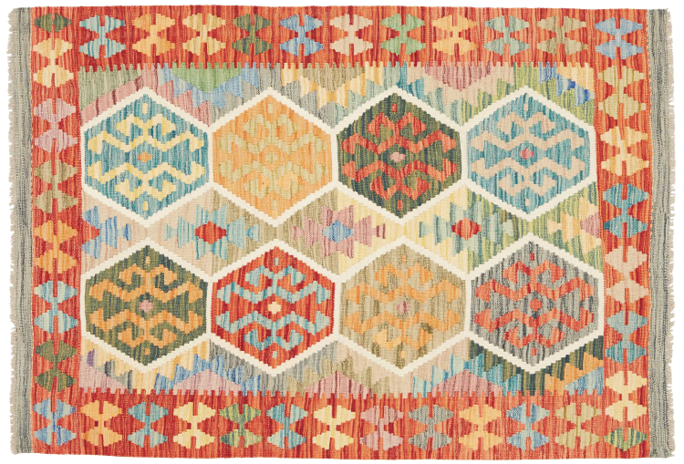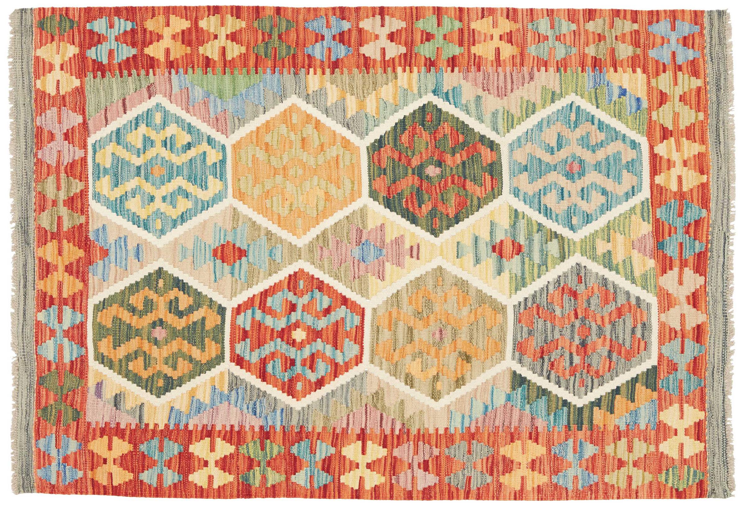 This handwoven Kilim Afghan is a wonderful and unique piece of art. Hard to believe that these modern colours and patterns have already been used centuries ago. This carpet has been woven by hand in old tradition in Afghanistan. It delivers a portion of contemporary history, which you won't find in this specific design a second time. It consists of high-grade natural wool and gives your home a personalised touch.