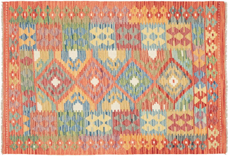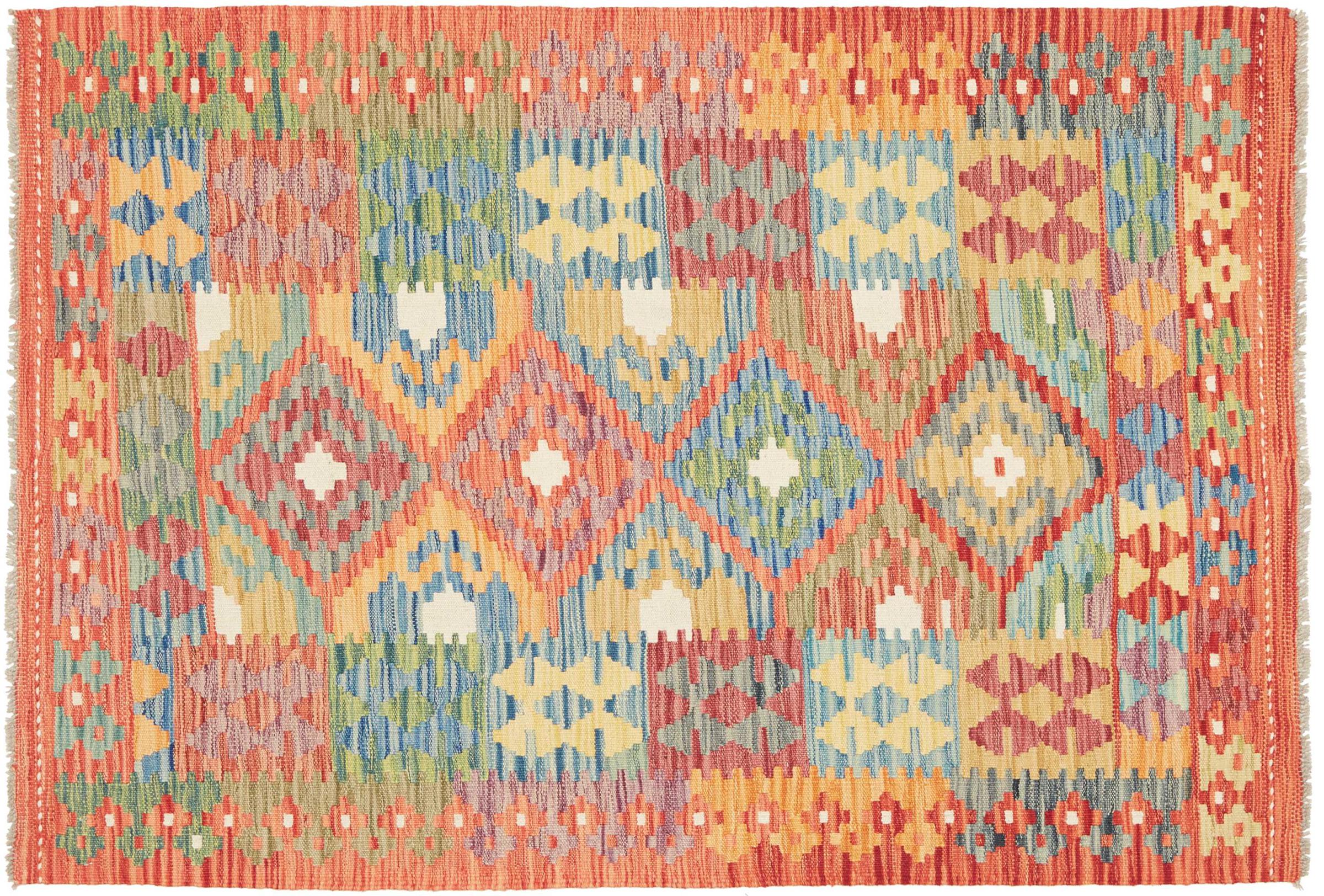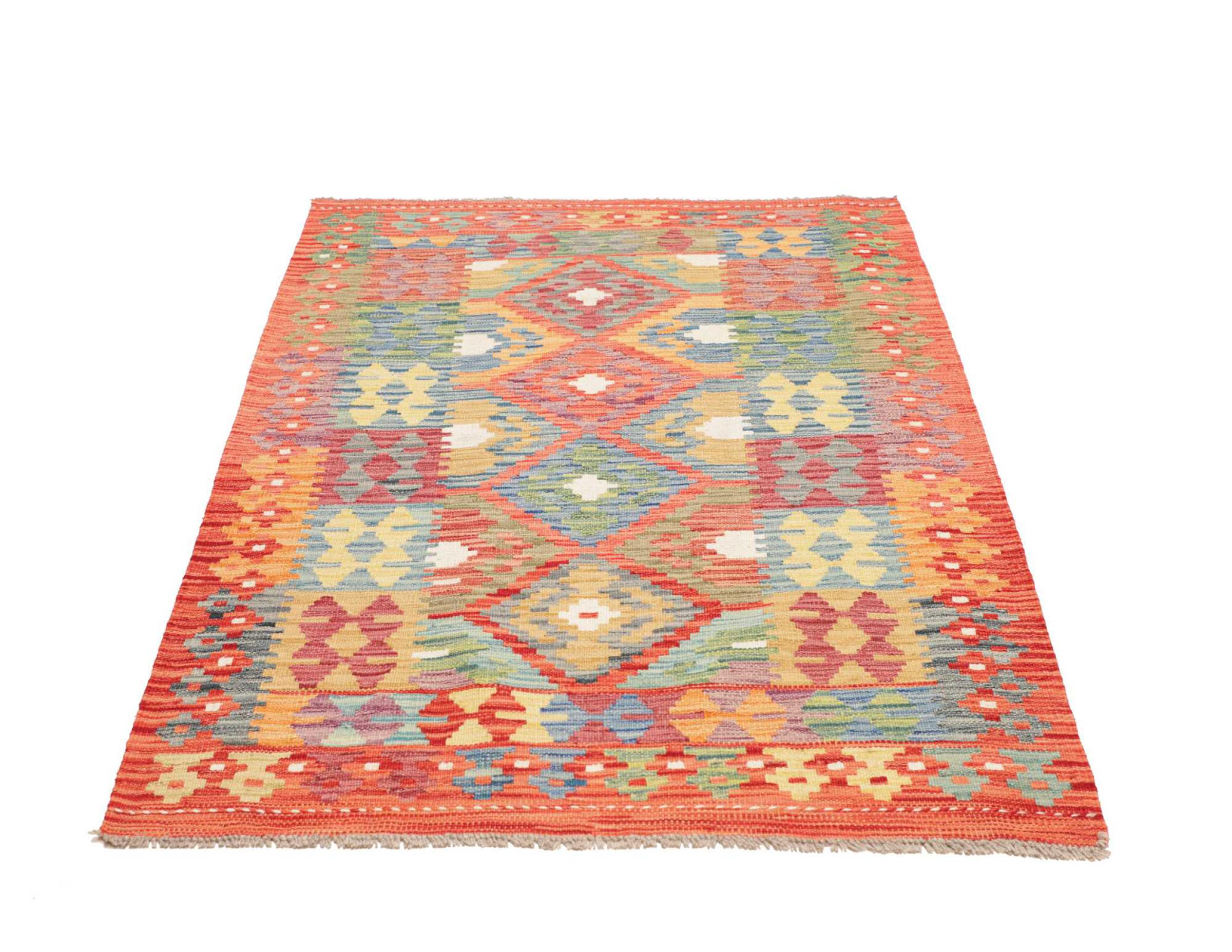 This handwoven Kilim Afghan is a wonderful and unique piece of art. Hard to believe that these modern colours and patterns have already been used centuries ago. This carpet has been woven by hand in old tradition in Afghanistan. It delivers a portion of contemporary history, which you won't find in this specific design a second time. It consists of high-grade natural wool and gives your home a personalised touch.