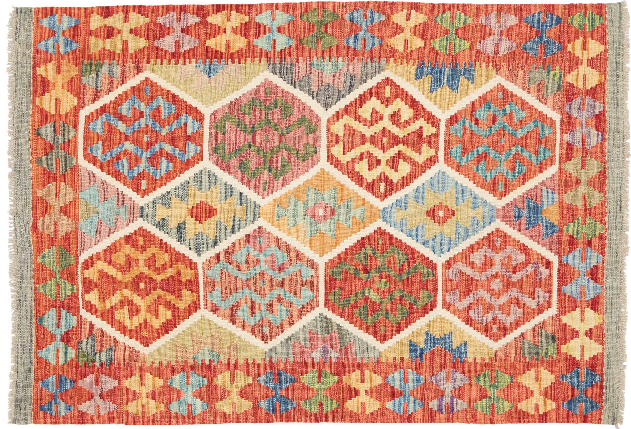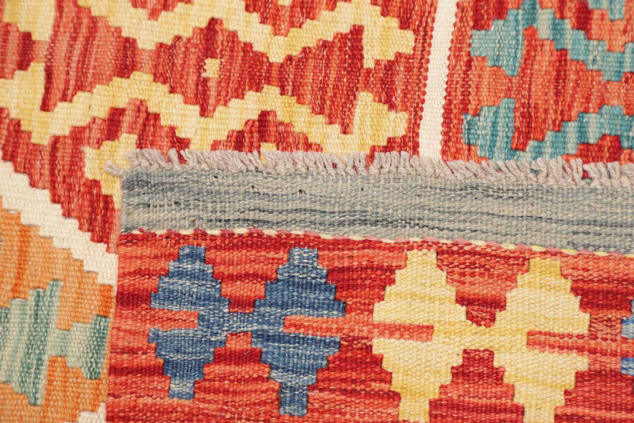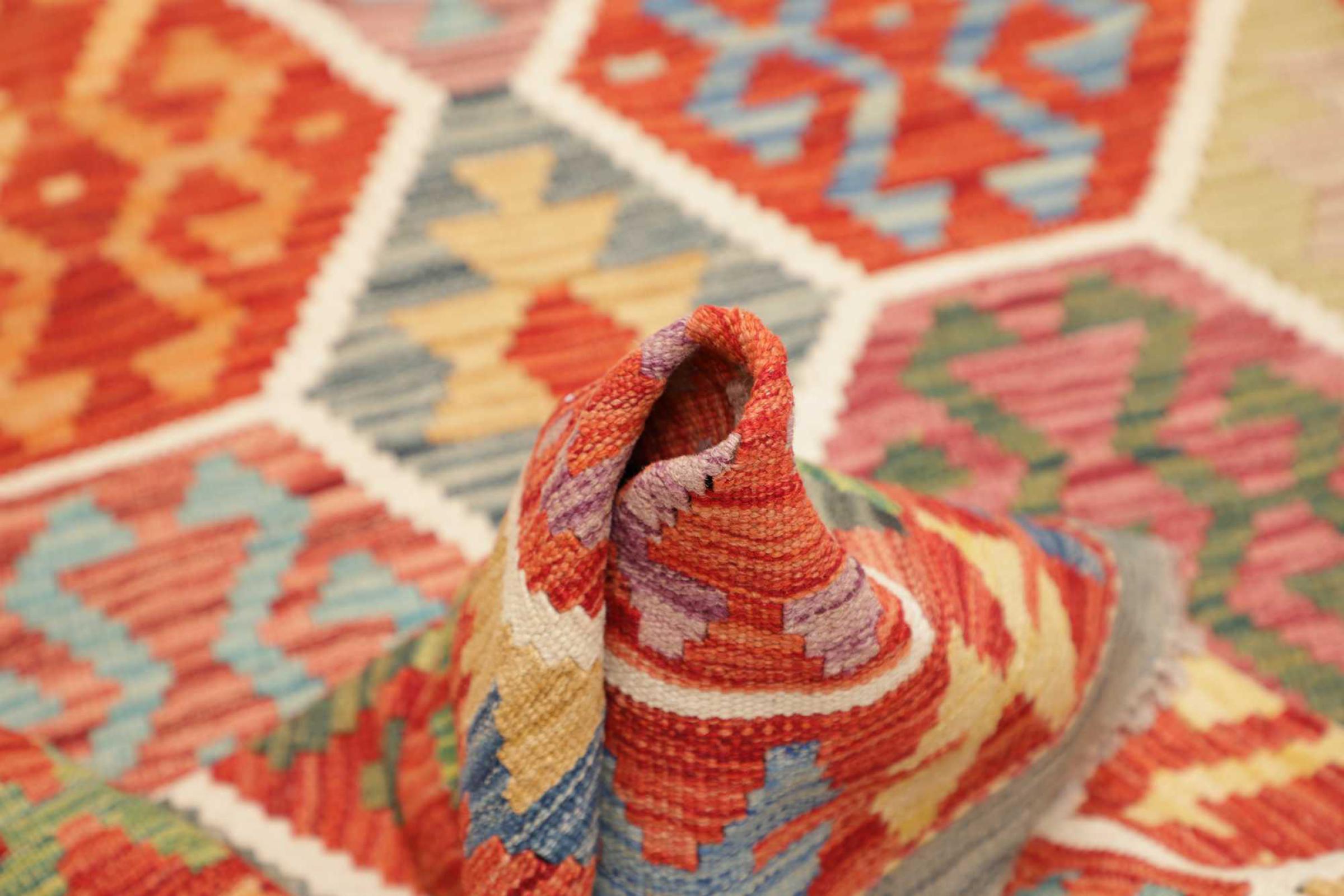 This handwoven Kilim Afghan is a wonderful and unique piece of art. Hard to believe that these modern colours and patterns have already been used centuries ago. This carpet has been woven by hand in old tradition in Afghanistan. It delivers a portion of contemporary history, which you won't find in this specific design a second time. It consists of high-grade natural wool and gives your home a personalised touch.