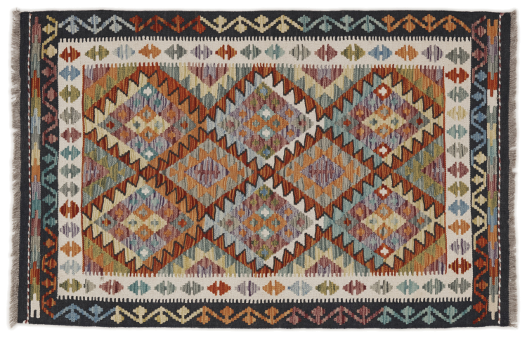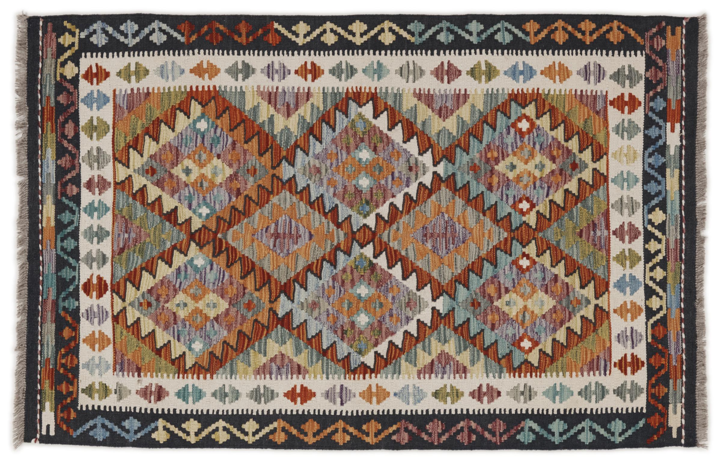 This handwoven Kilim Afghan is a wonderful and unique piece of art. Hard to believe that these modern colours and patterns have already been used centuries ago. This carpet has been woven by hand in old tradition in Afghanistan. It delivers a portion of contemporary history, which you won't find in this specific design a second time. It consists of high-grade natural wool and gives your home a personalised touch.