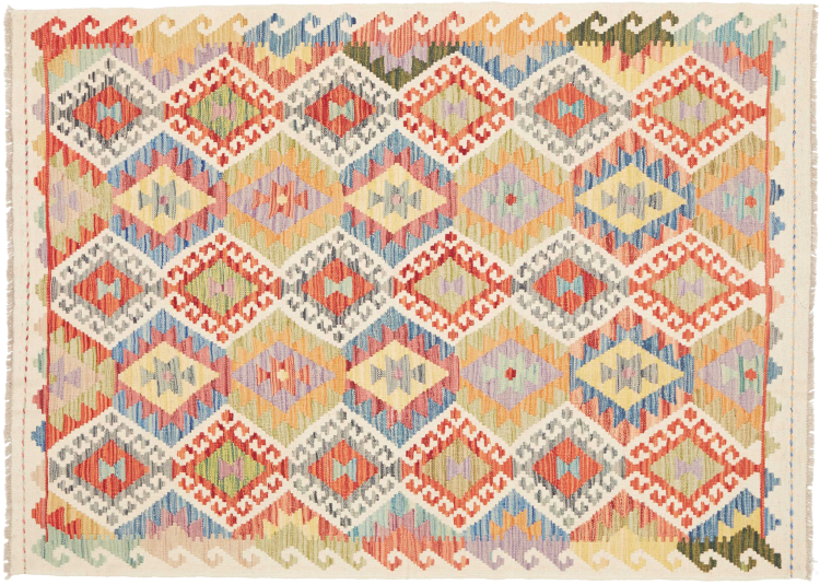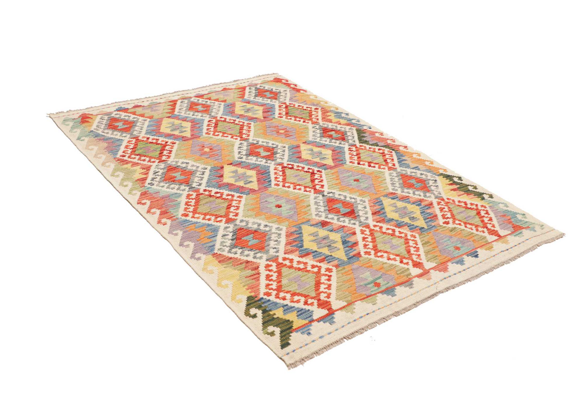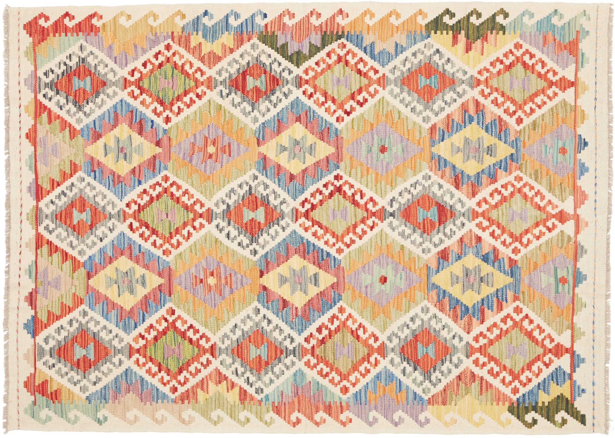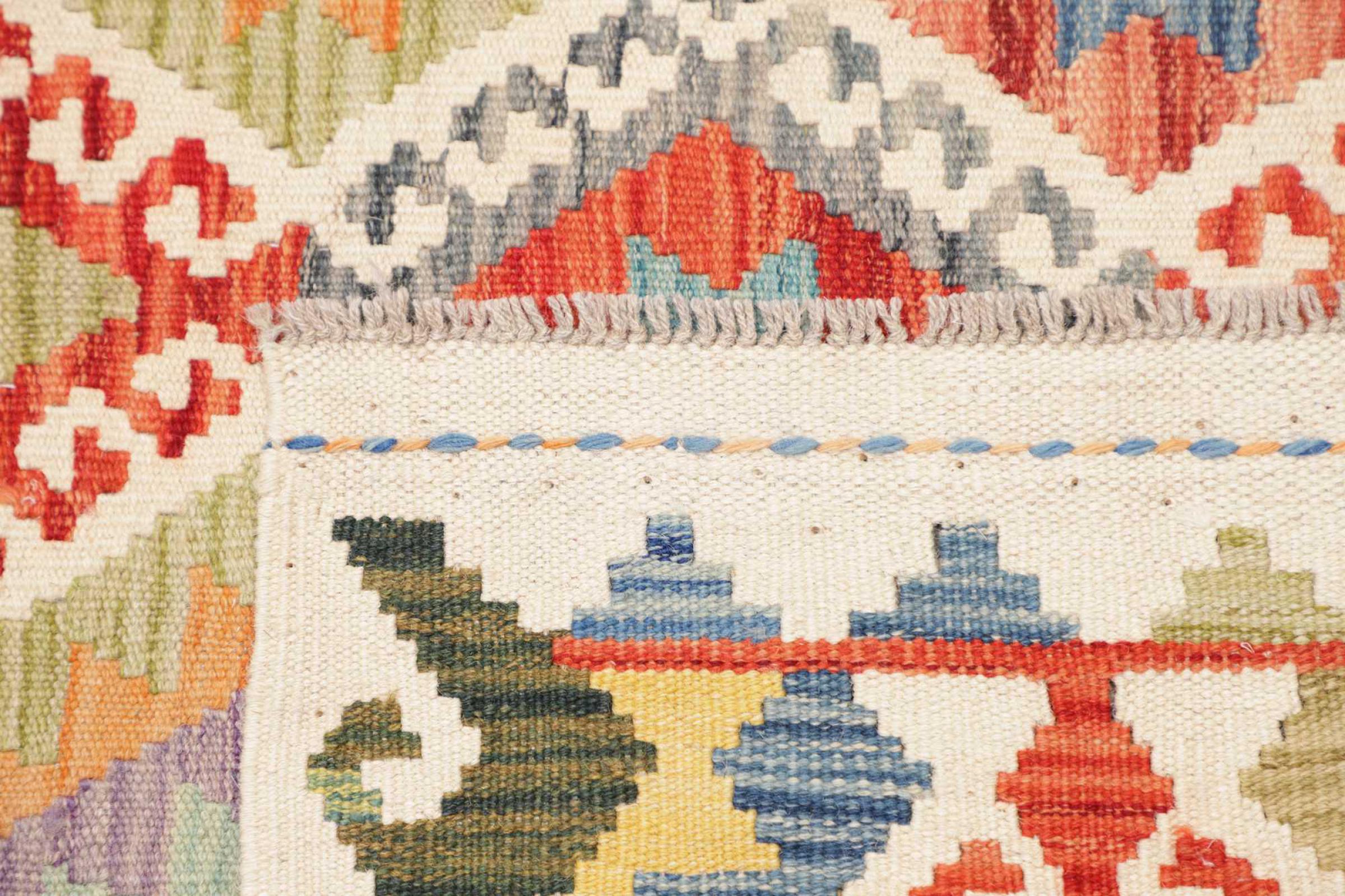 This handwoven Kilim Afghan is a wonderful and unique piece of art. Hard to believe that these modern colours and patterns have already been used centuries ago. This carpet has been woven by hand in old tradition in Afghanistan. It delivers a portion of contemporary history, which you won't find in this specific design a second time. It consists of high-grade natural wool and gives your home a personalised touch.