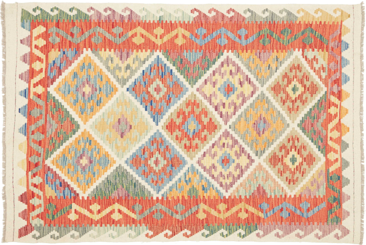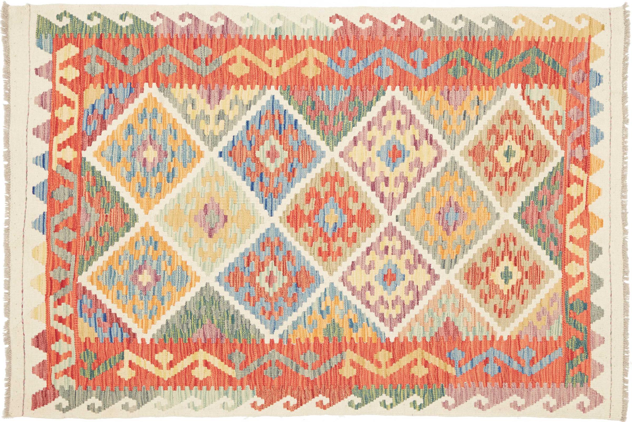 This handwoven Kilim Afghan is a wonderful and unique piece of art. Hard to believe that these modern colours and patterns have already been used centuries ago. This carpet has been woven by hand in old tradition in Afghanistan. It delivers a portion of contemporary history, which you won't find in this specific design a second time. It consists of high-grade natural wool and gives your home a personalised touch.
