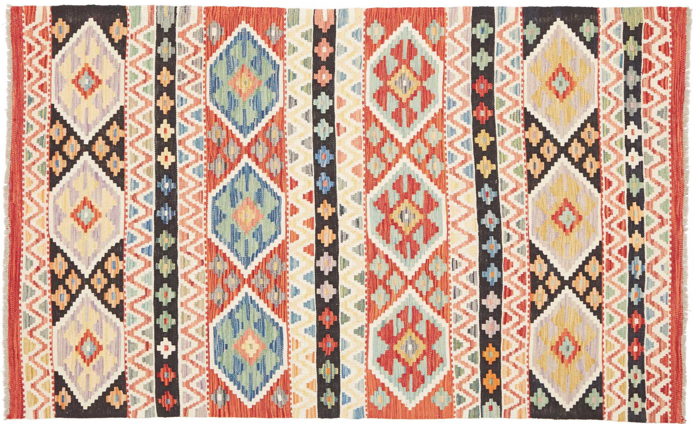 This handwoven Kilim Afghan is a wonderful and unique piece of art. Hard to believe that these modern colours and patterns have already been used centuries ago. This carpet has been woven by hand in old tradition in Afghanistan. It delivers a portion of contemporary history, which you won't find in this specific design a second time. It consists of high-grade natural wool and gives your home a personalised touch.
