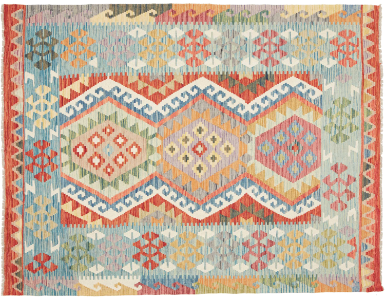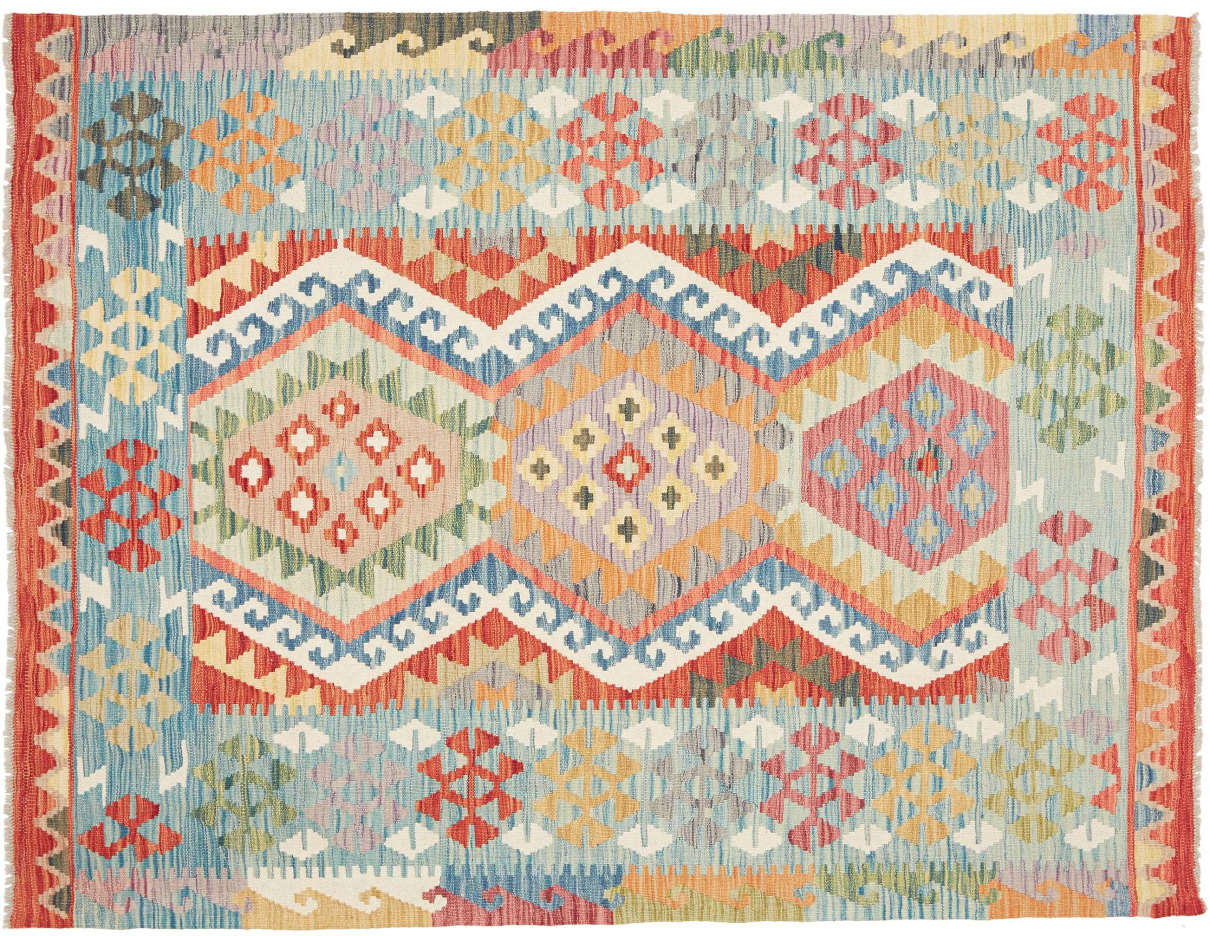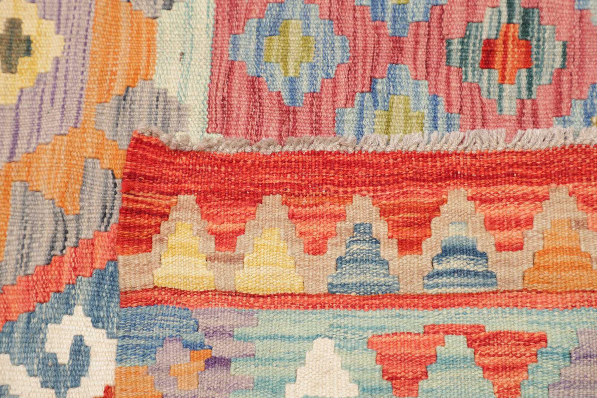 This handwoven Kilim Afghan is a wonderful and unique piece of art. Hard to believe that these modern colours and patterns have already been used centuries ago. This carpet has been woven by hand in old tradition in Afghanistan. It delivers a portion of contemporary history, which you won't find in this specific design a second time. It consists of high-grade natural wool and gives your home a personalised touch.