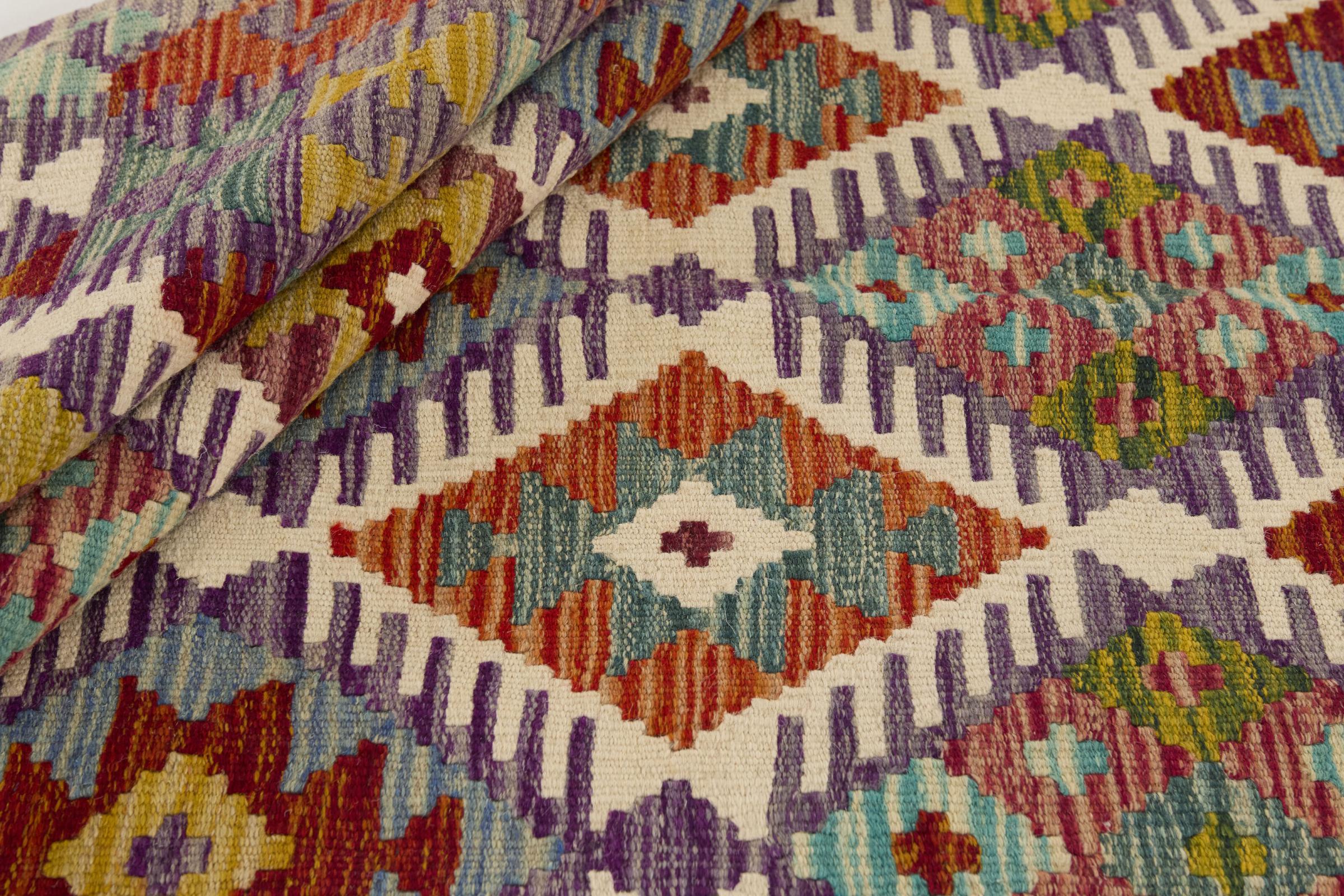 This handwoven Kilim Afghan is a wonderful and unique piece of art. Hard to believe that these modern colours and patterns have already been used centuries ago. This carpet has been woven by hand in old tradition in Afghanistan. It delivers a portion of contemporary history, which you won't find in this specific design a second time. It consists of high-grade natural wool and gives your home a personalised touch.