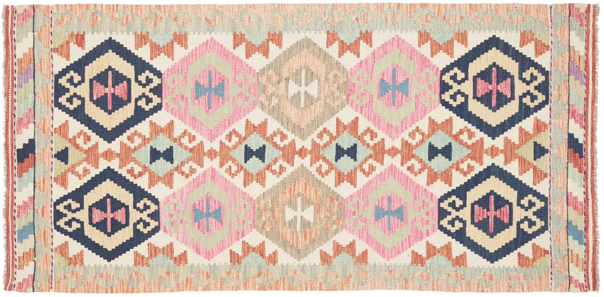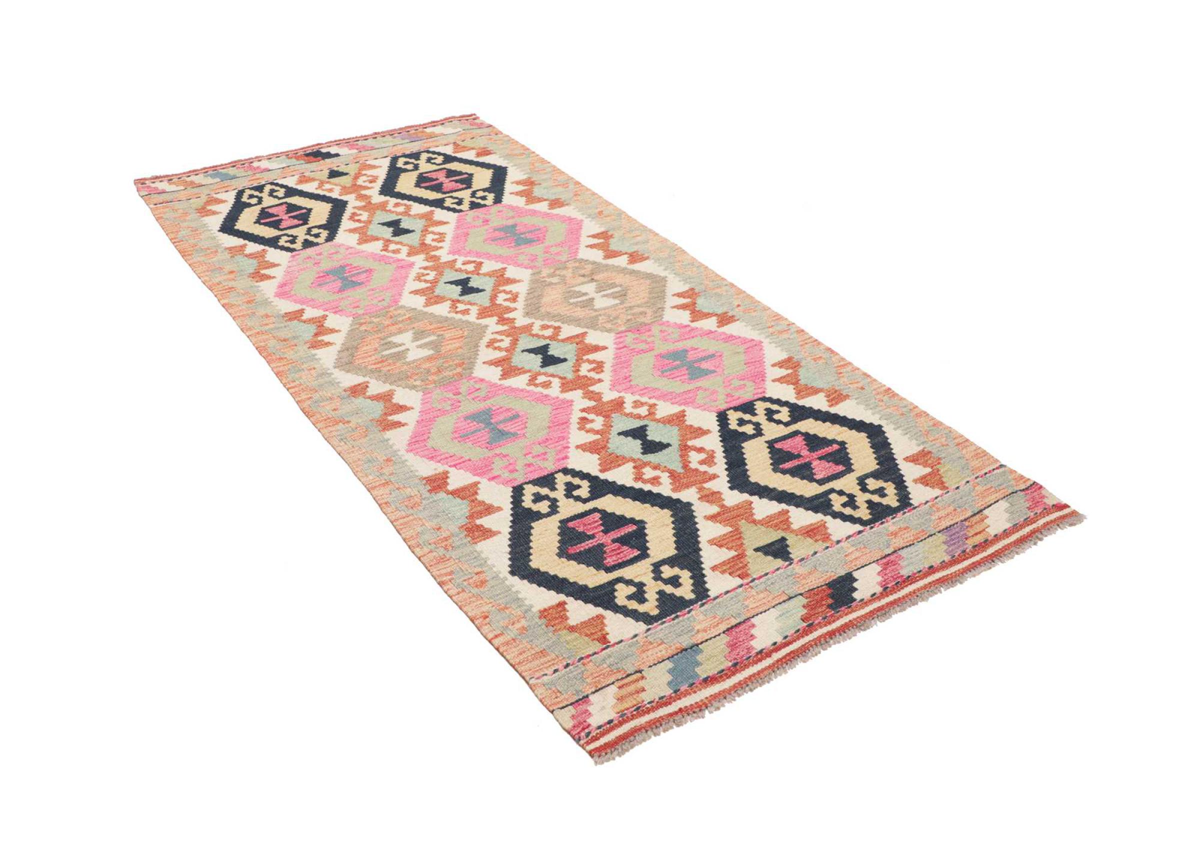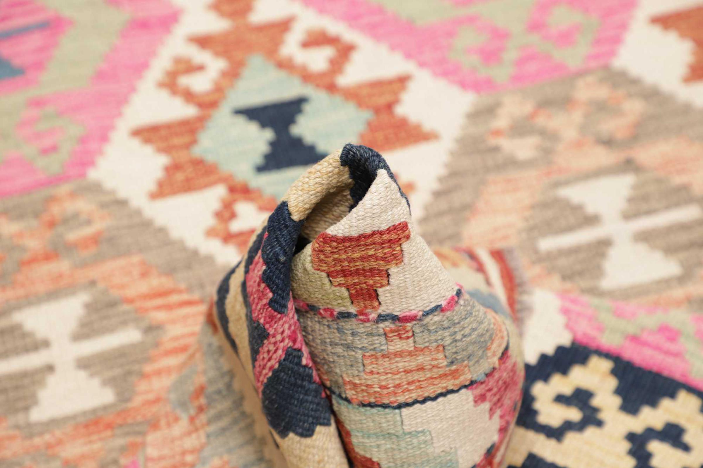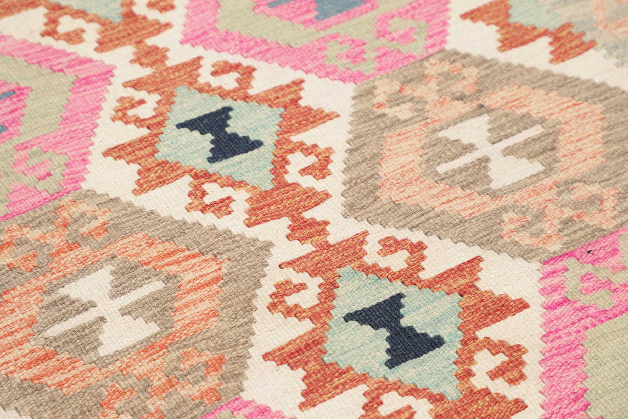 This handwoven Kilim Afghan is a wonderful and unique piece of art. Hard to believe that these modern colours and patterns have already been used centuries ago. This carpet has been woven by hand in old tradition in Afghanistan. It delivers a portion of contemporary history, which you won't find in this specific design a second time. It consists of high-grade natural wool and gives your home a personalised touch.