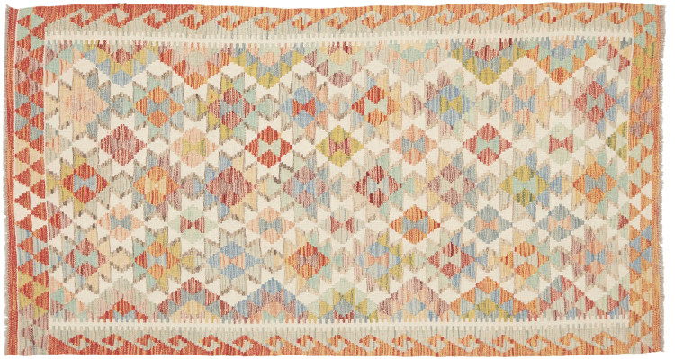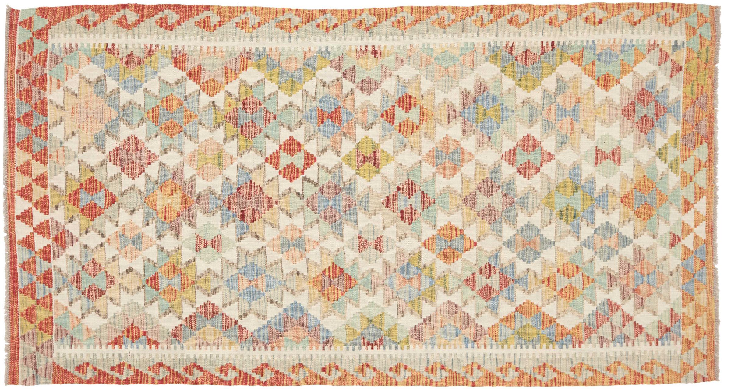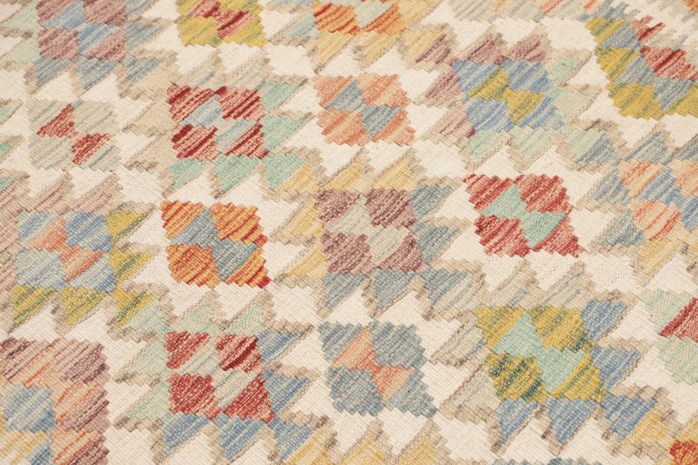 This handwoven Kilim Afghan is a wonderful and unique piece of art. Hard to believe that these modern colours and patterns have already been used centuries ago. This carpet has been woven by hand in old tradition in Afghanistan. It delivers a portion of contemporary history, which you won't find in this specific design a second time. It consists of high-grade natural wool and gives your home a personalised touch.