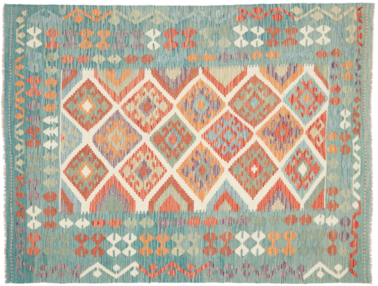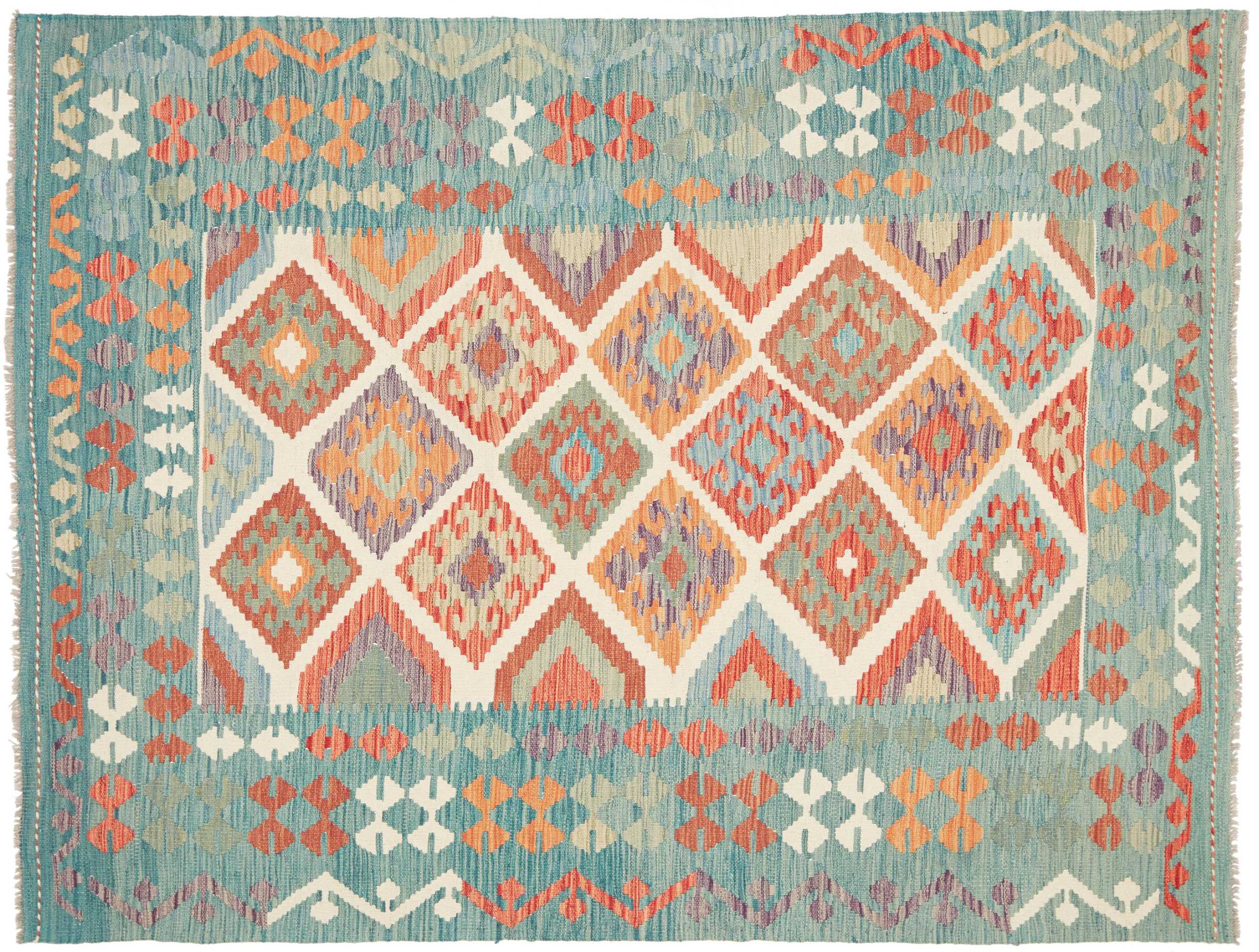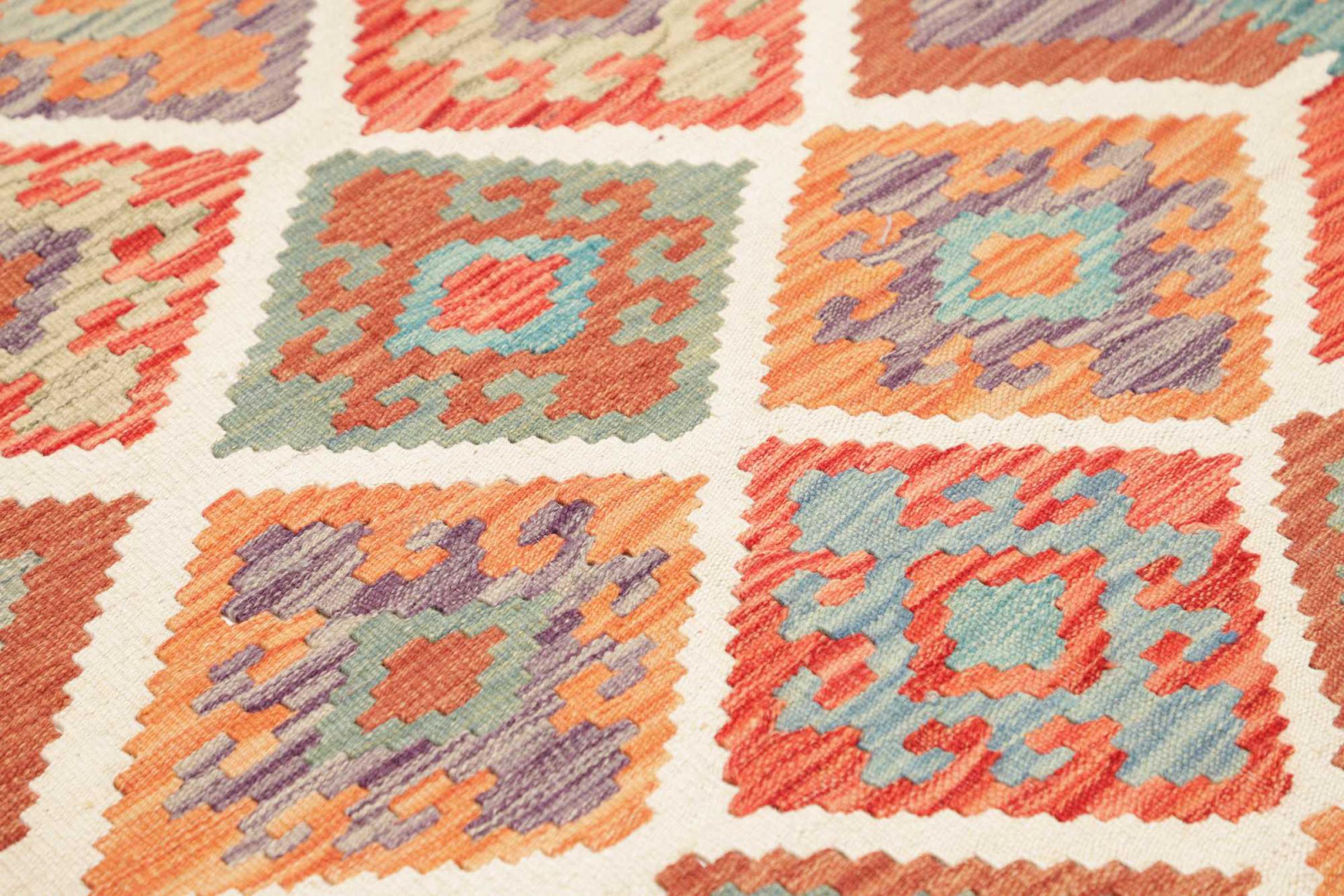 This handwoven Kilim Afghan is a wonderful and unique piece of art. Hard to believe that these modern colours and patterns have already been used centuries ago. This carpet has been woven by hand in old tradition in Afghanistan. It delivers a portion of contemporary history, which you won't find in this specific design a second time. It consists of high-grade natural wool and gives your home a personalised touch.